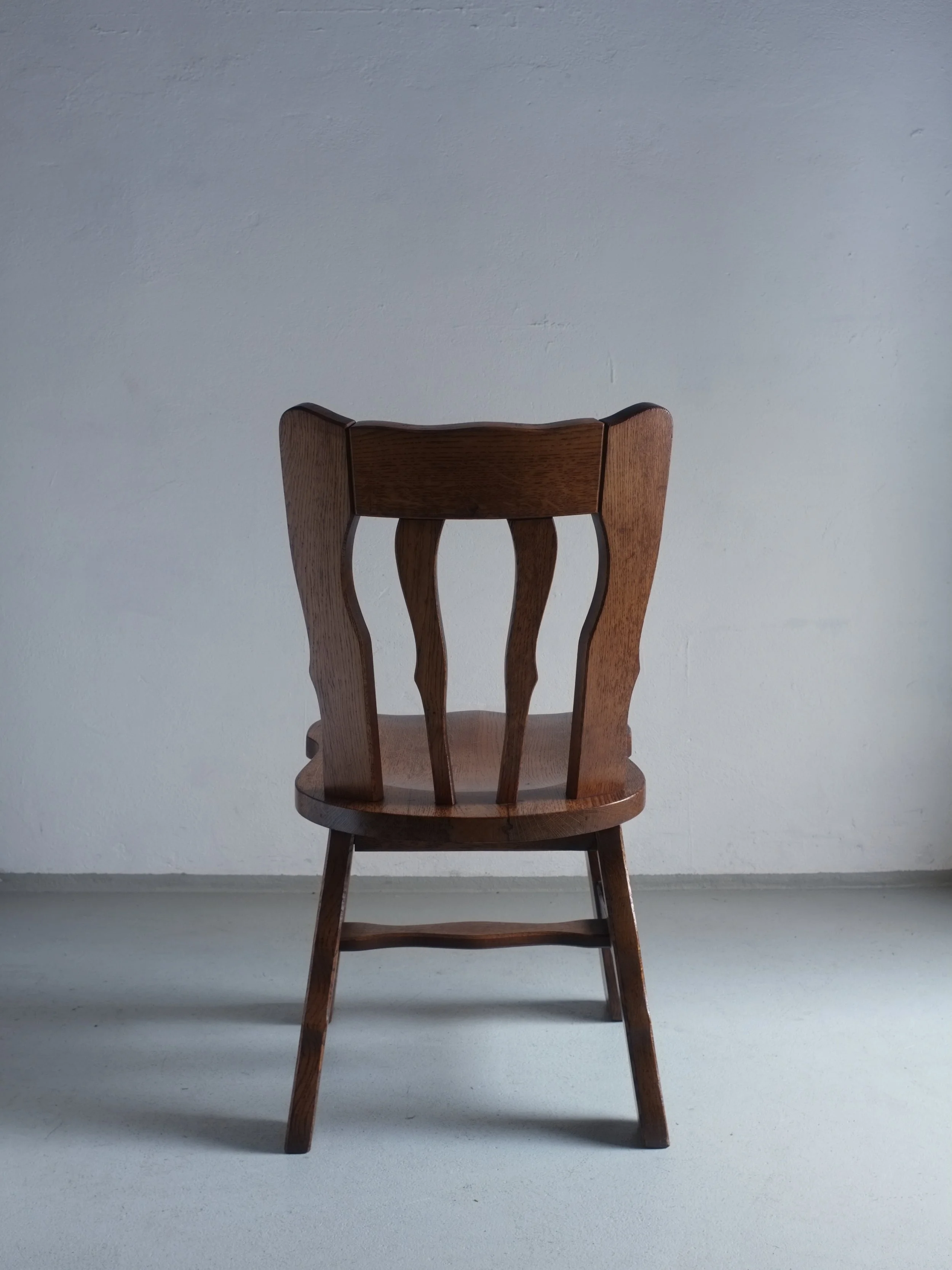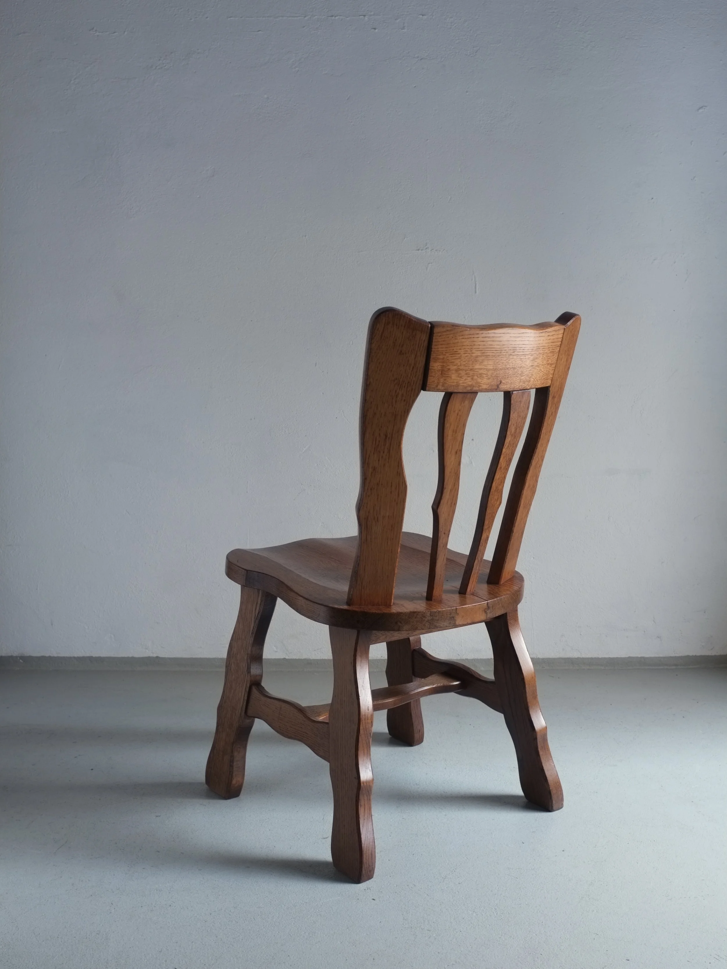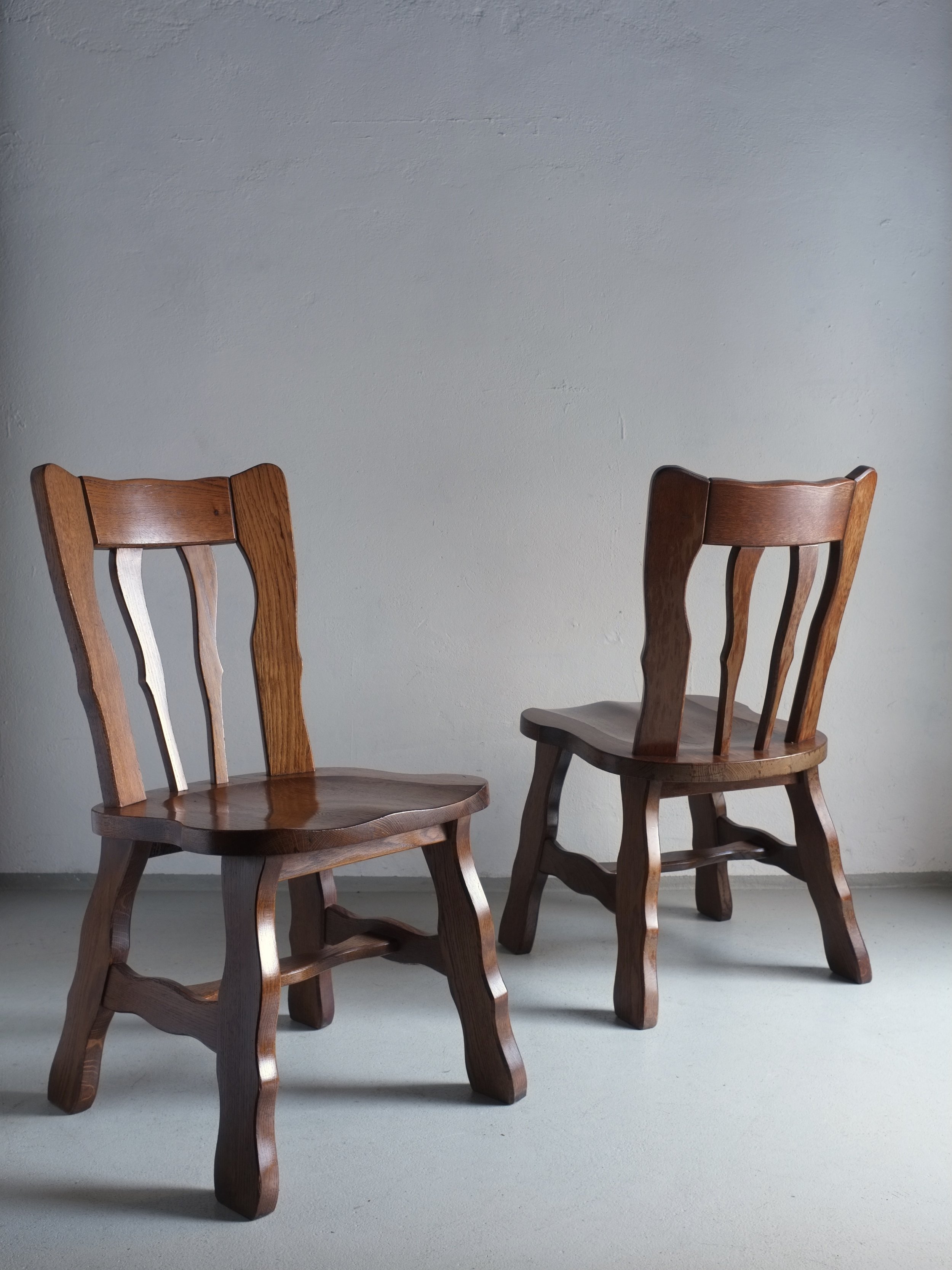 Set of 2 brutalist oak chairs with carved details, very heavy and stable.