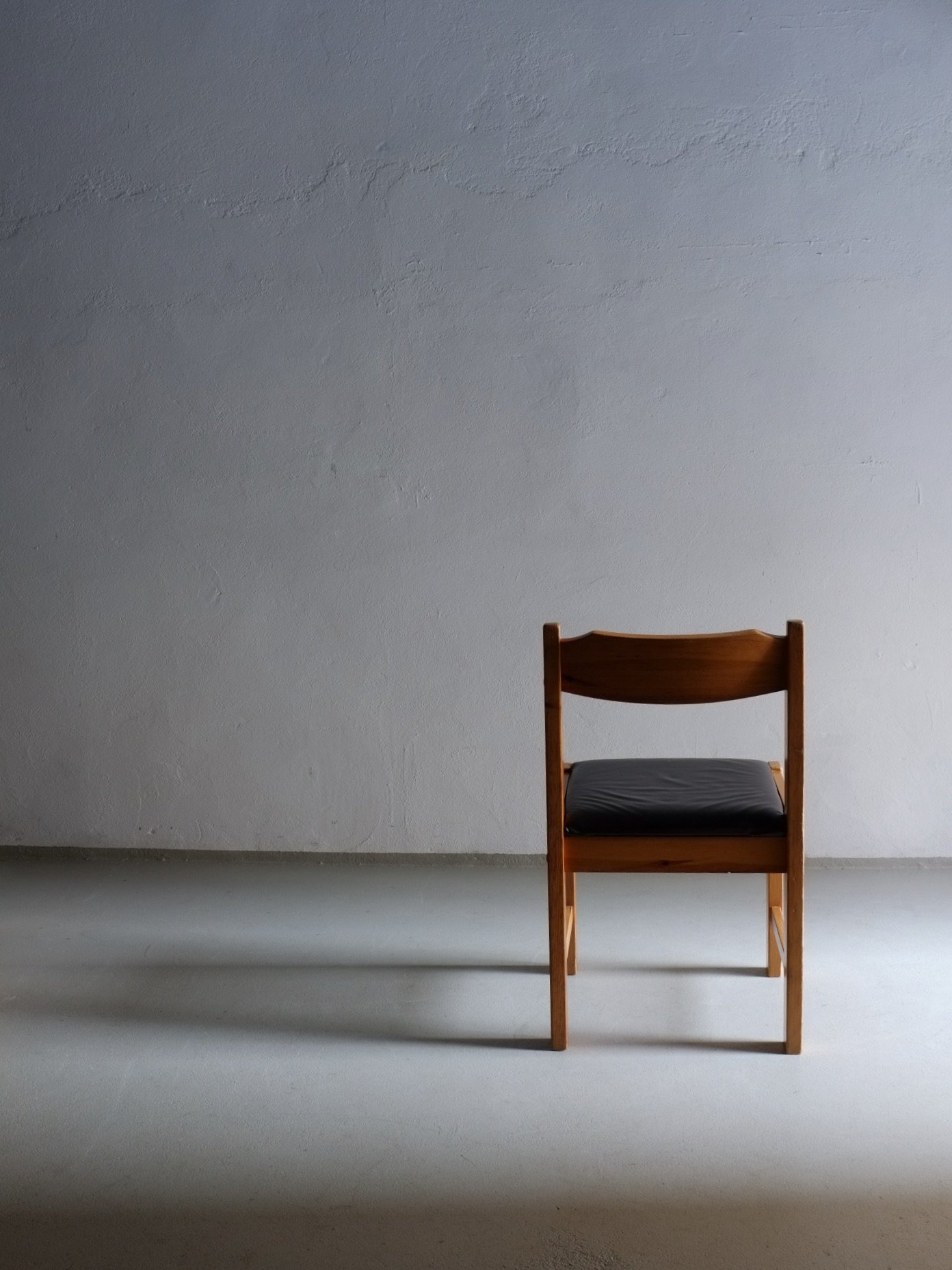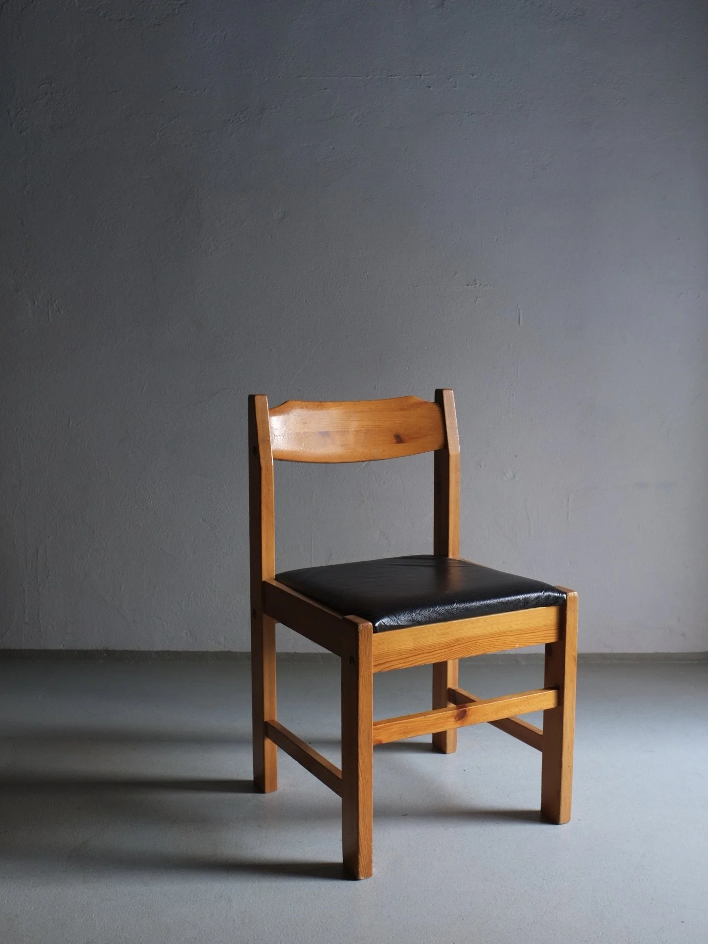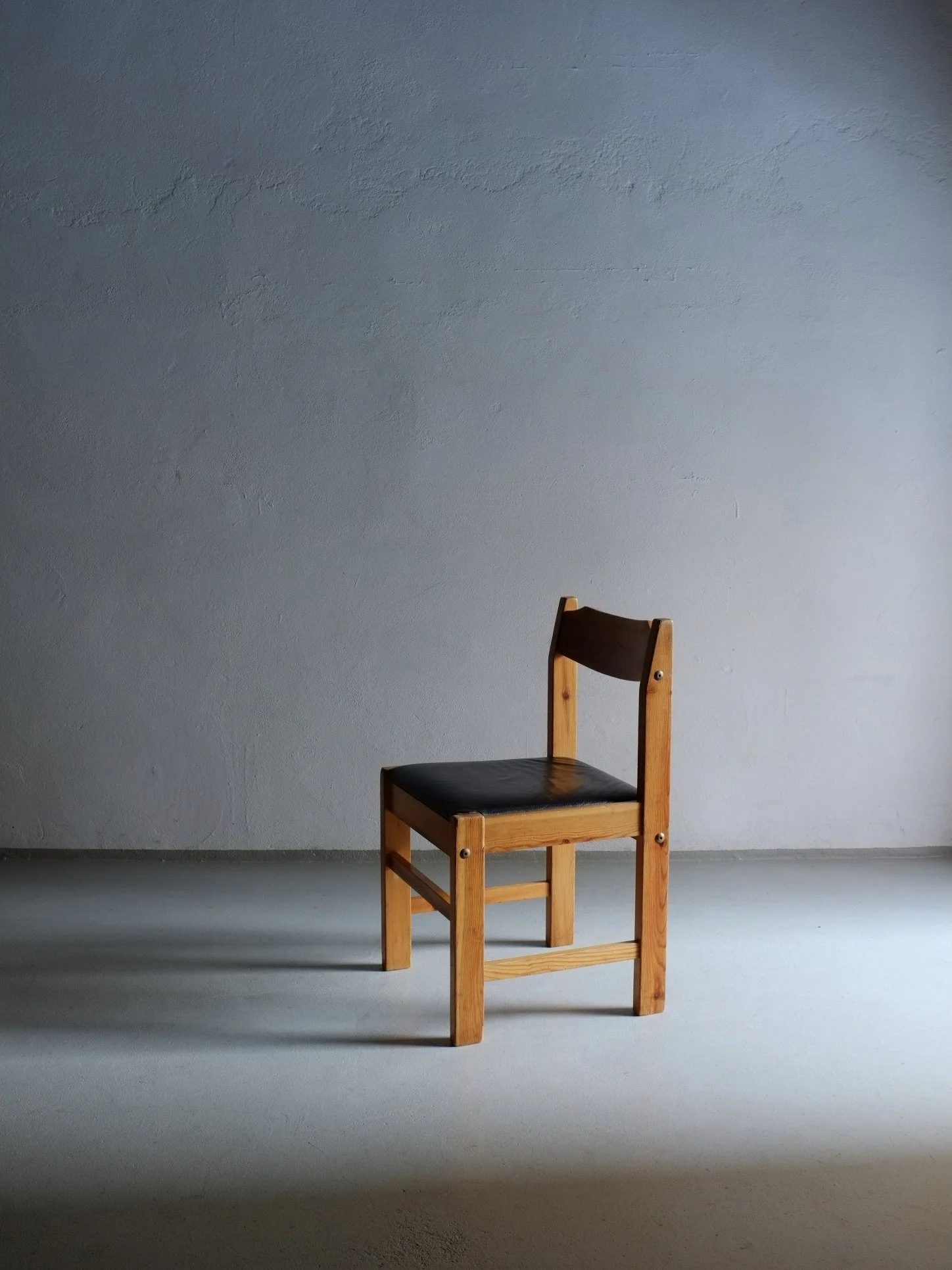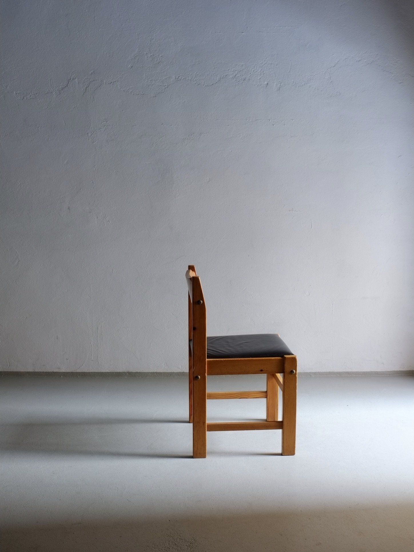 Set of 6 pine dining chairs with dark brown faux leather seats.