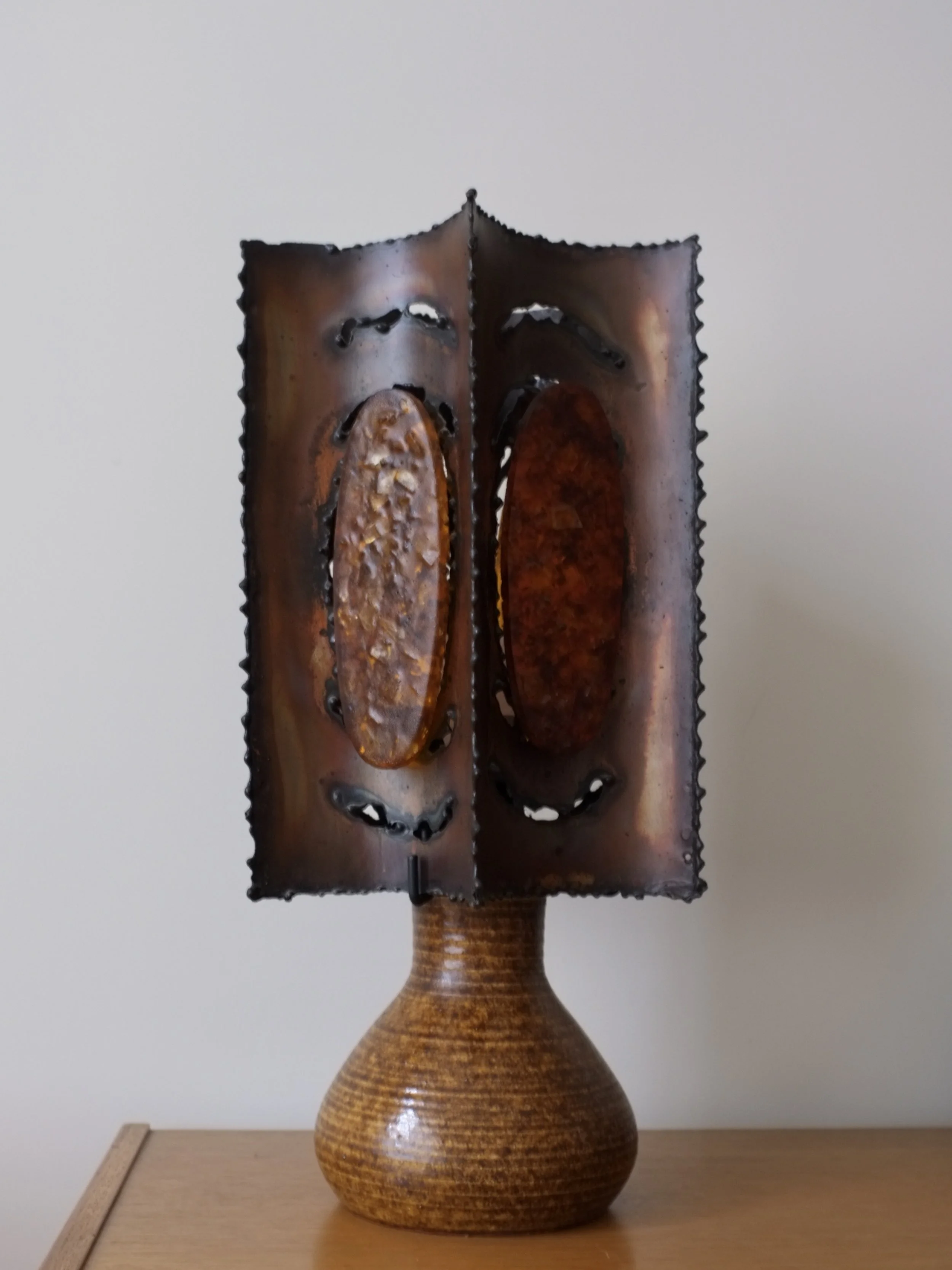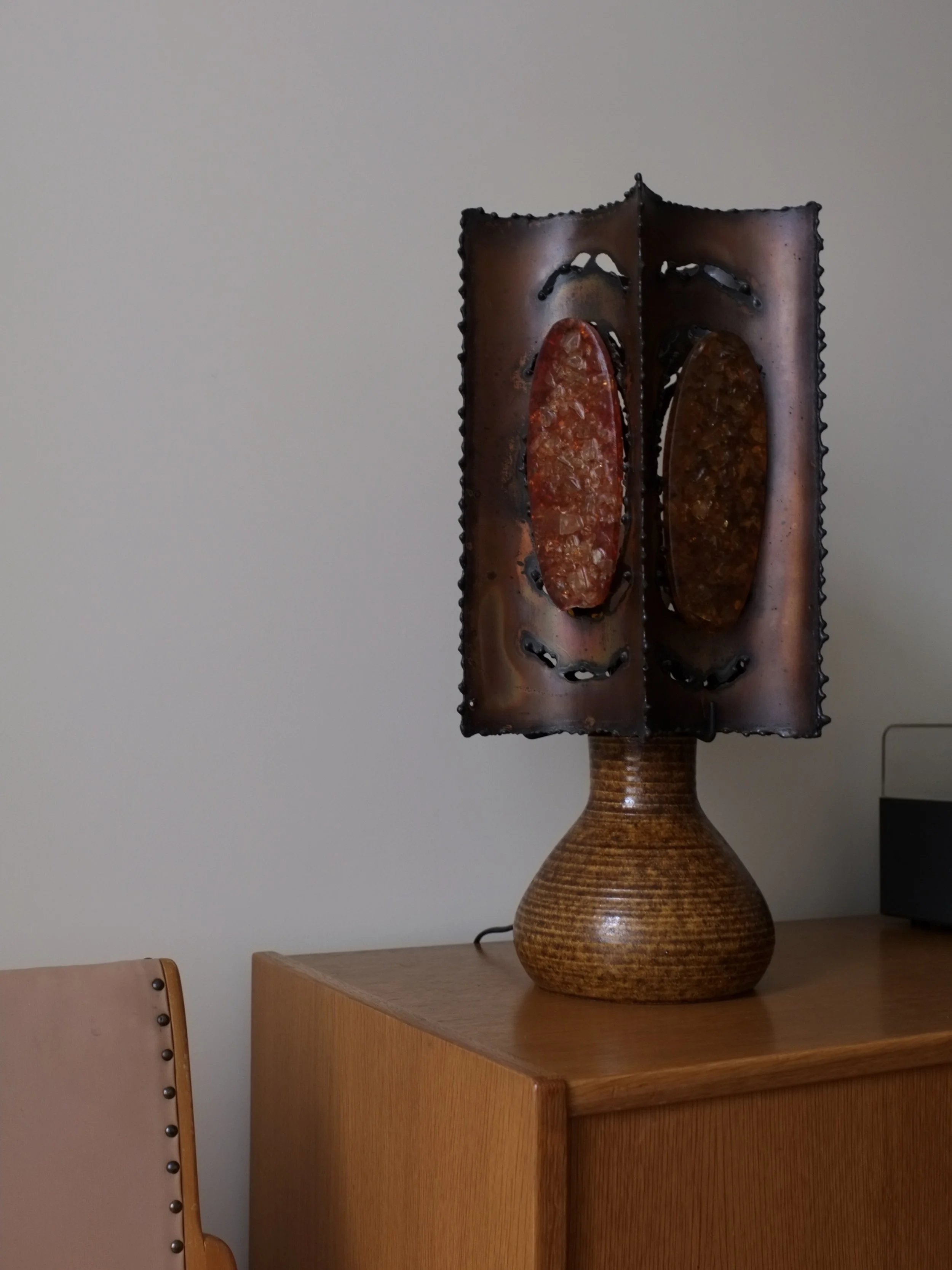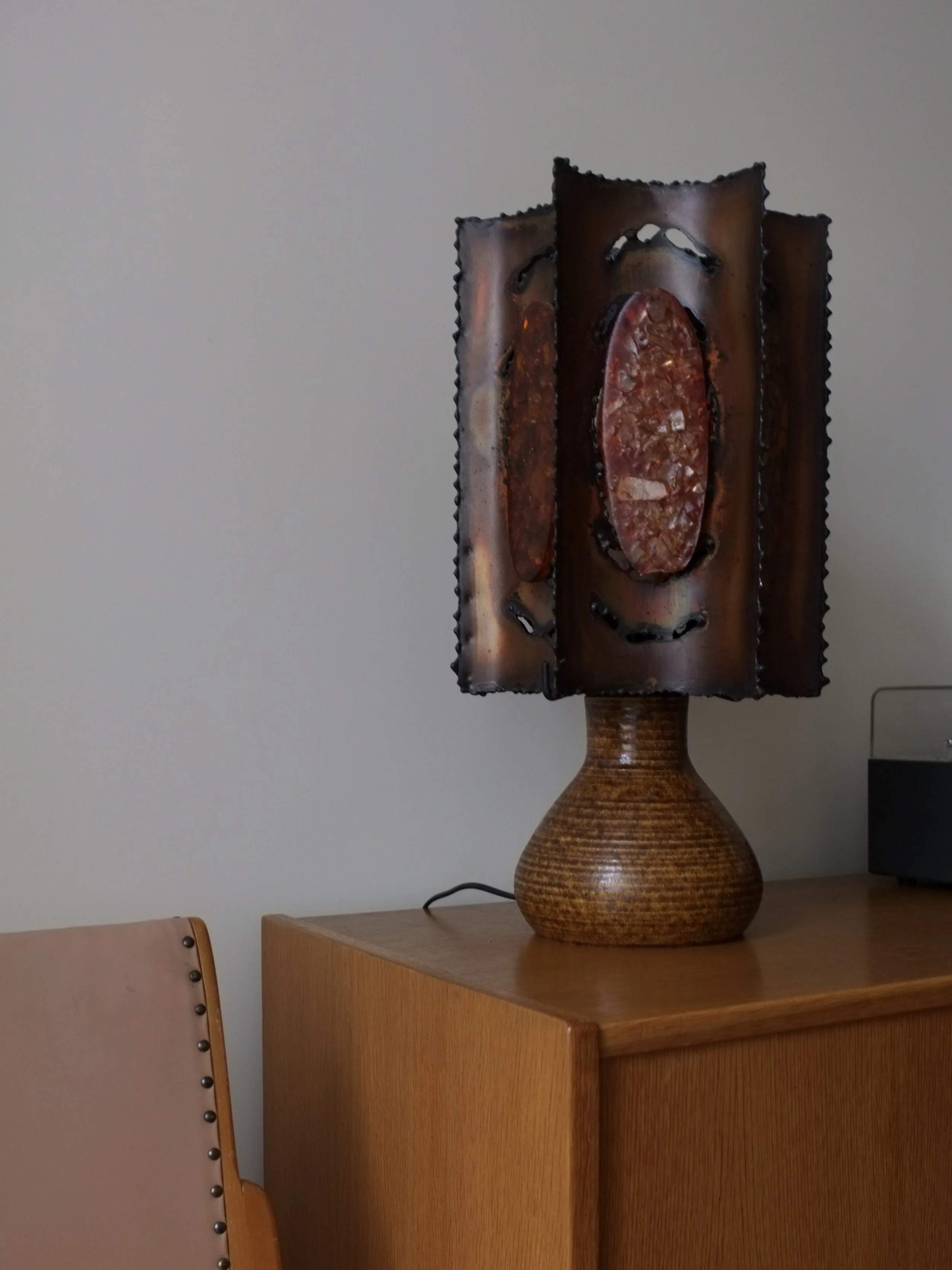 Vintage Accolay brutalist ceramic table lamp with metal shade and amber color resin decorations.