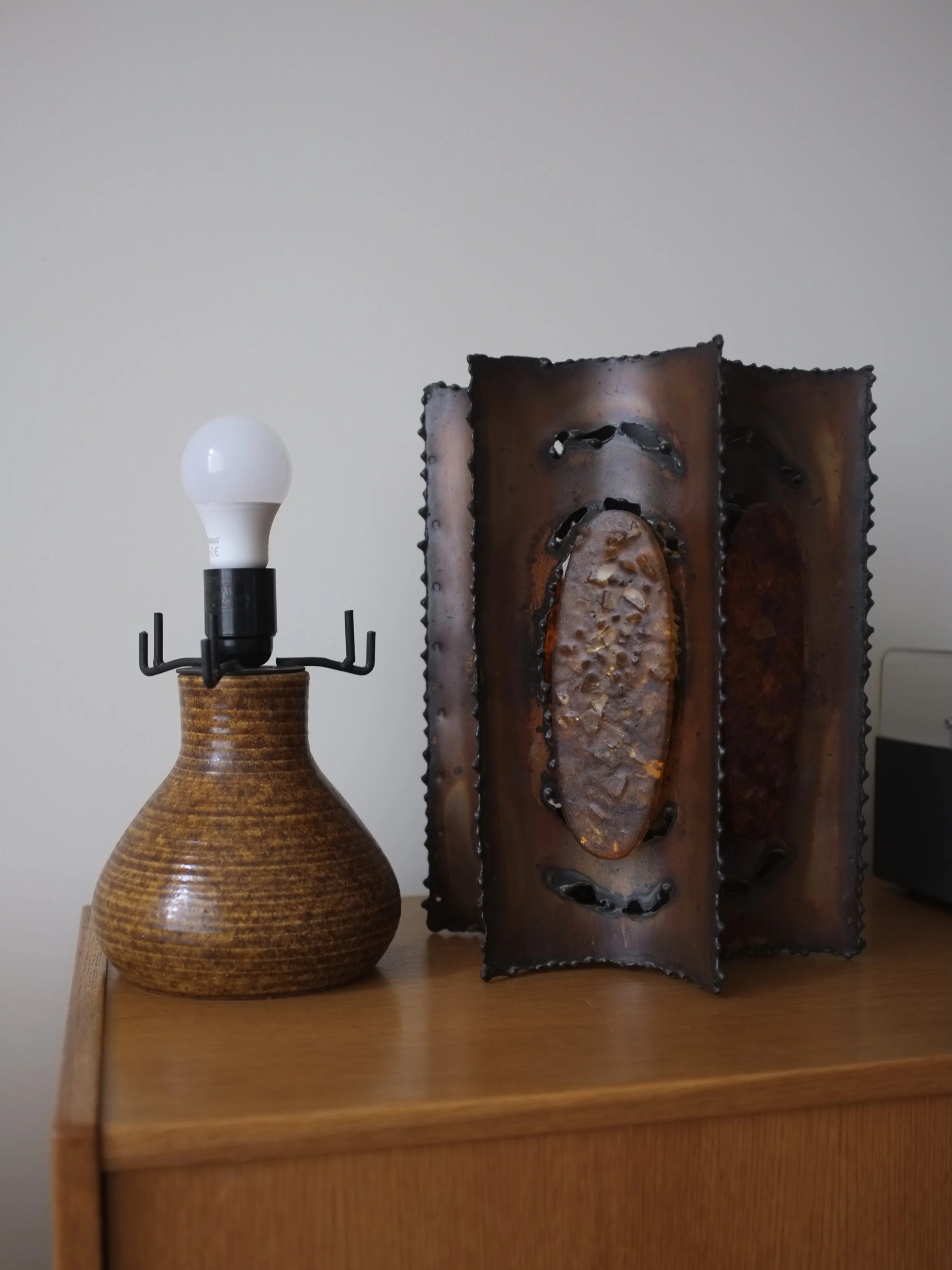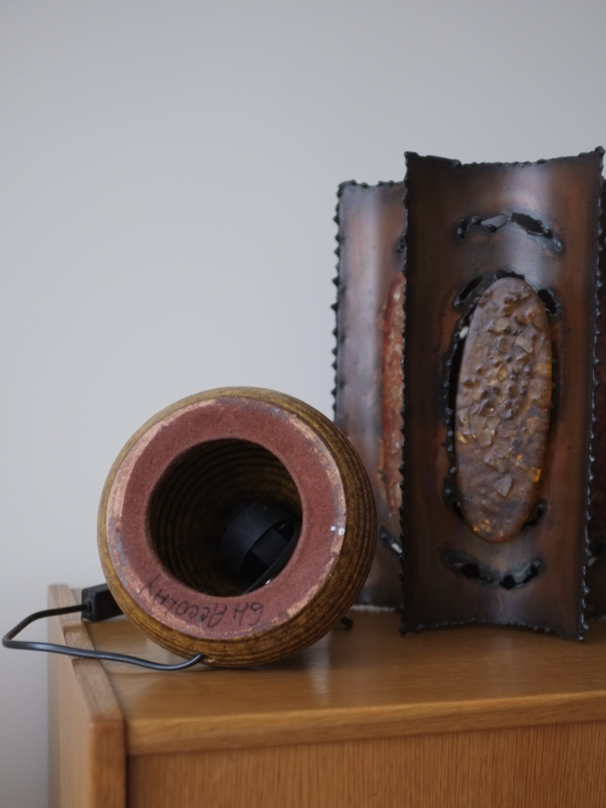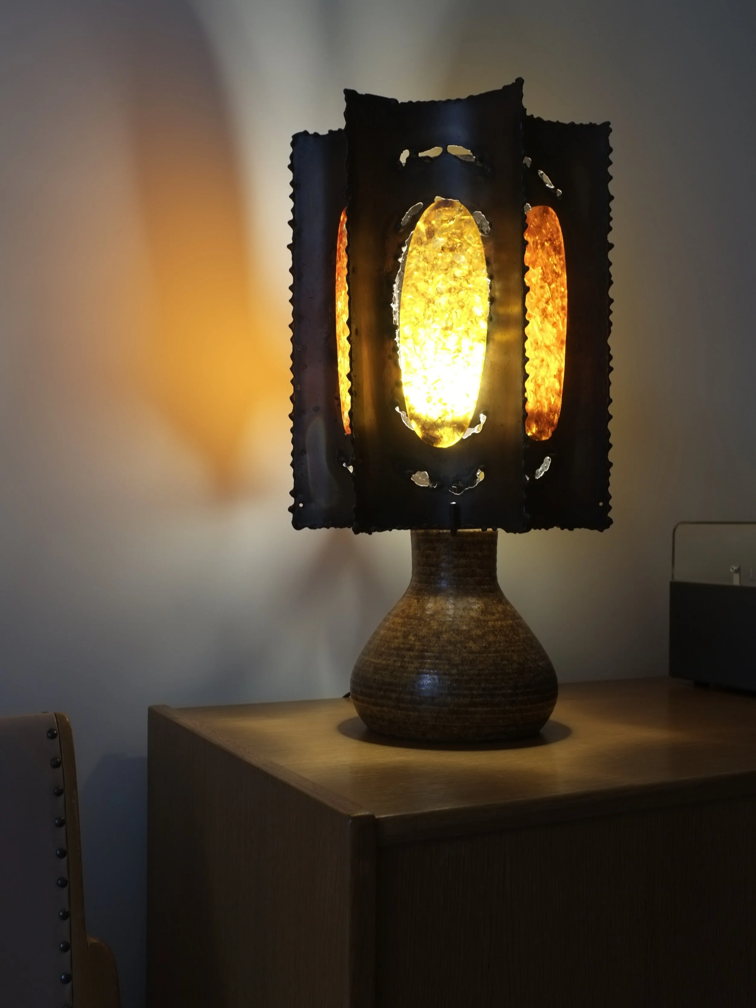 Vintage Accolay brutalist ceramic table lamp with metal shade and amber color resin decorations.