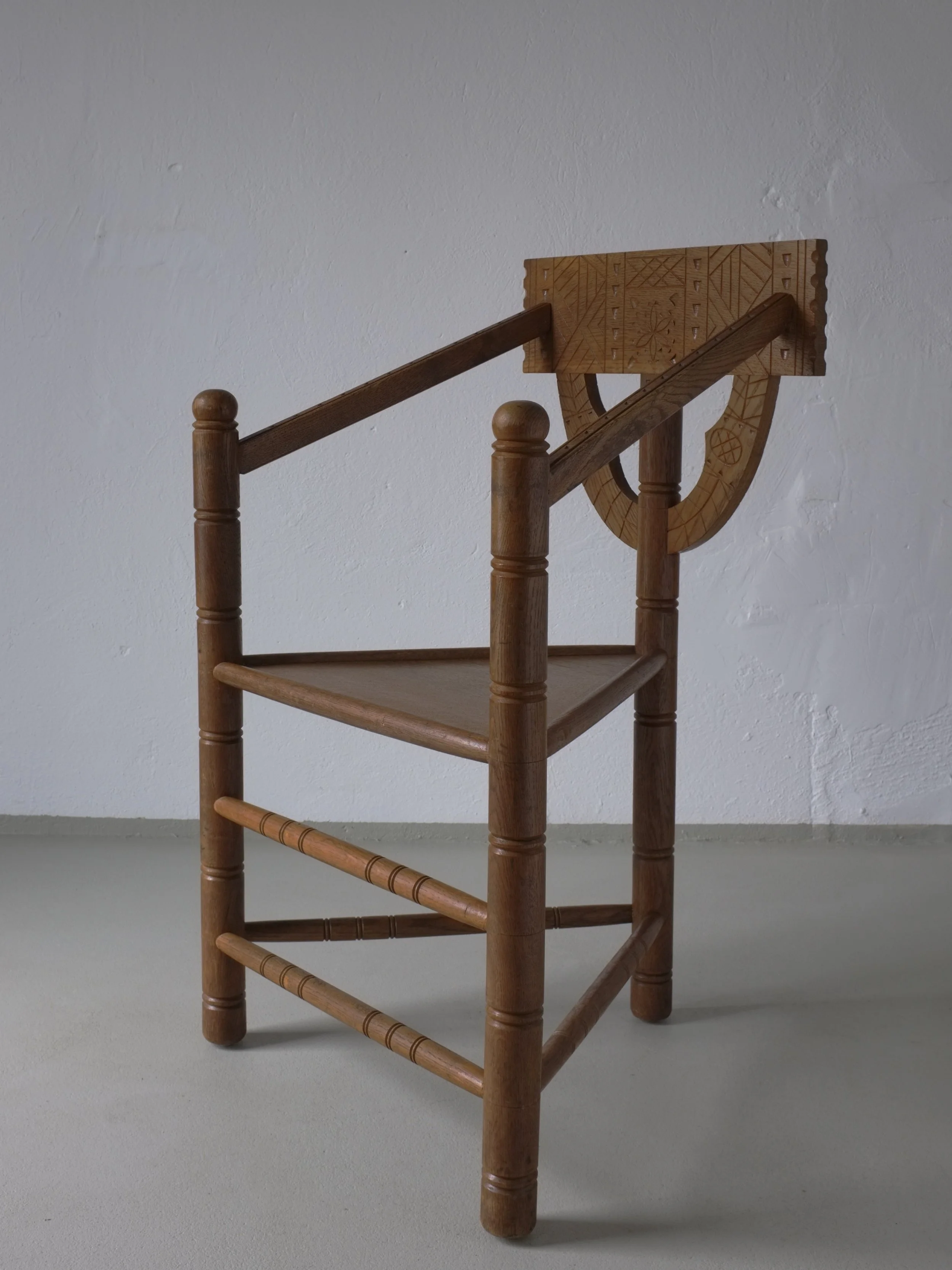 Swedish corner chair from the 1920s, crafted in solid oak with hand-embroidered seat and backrest. The geometric floral embroidery reflects late Art Nouveau influences, combining natural motifs with Nordic simplicity. A sculptural piece with strong decorative and folk character.