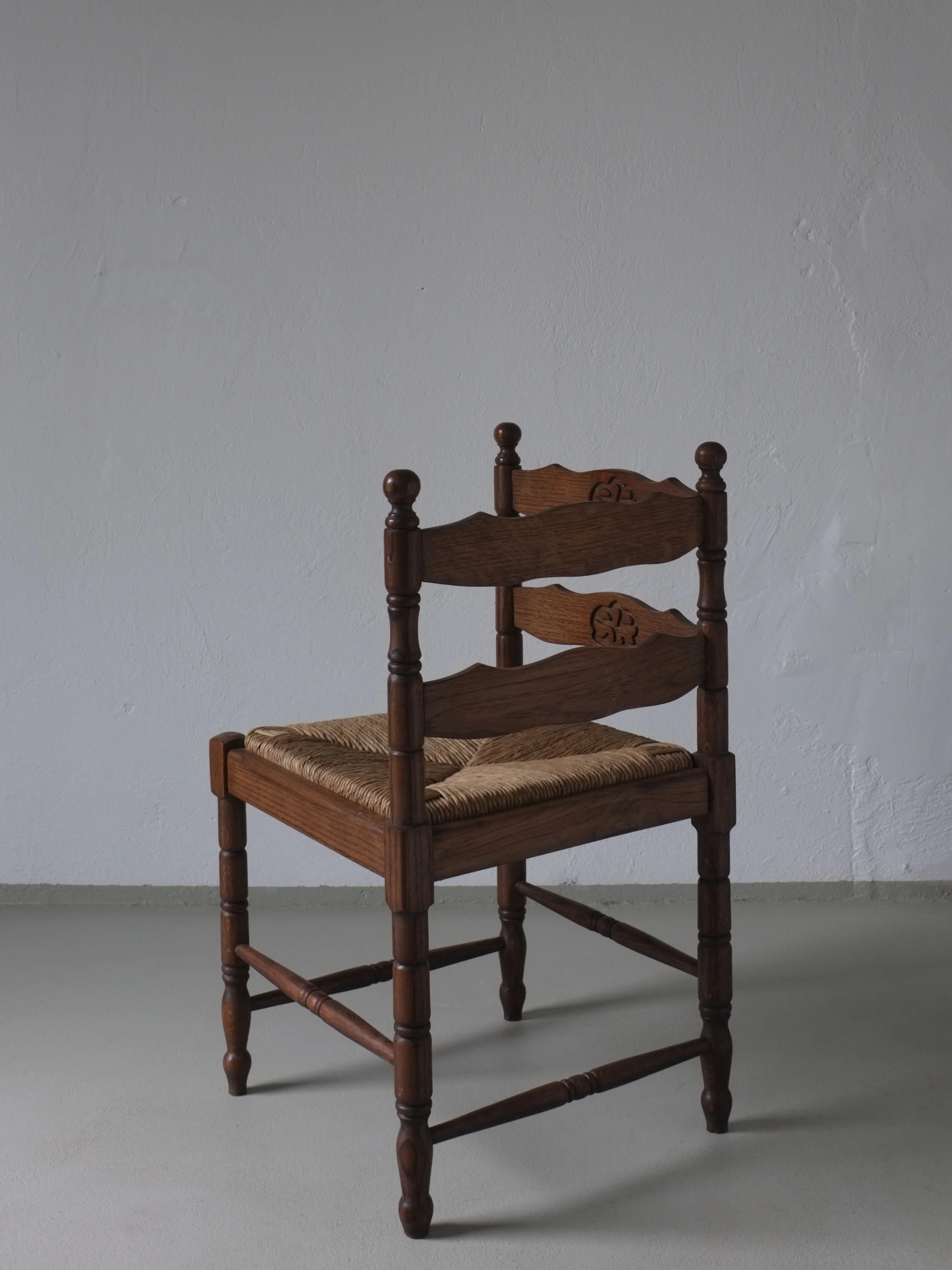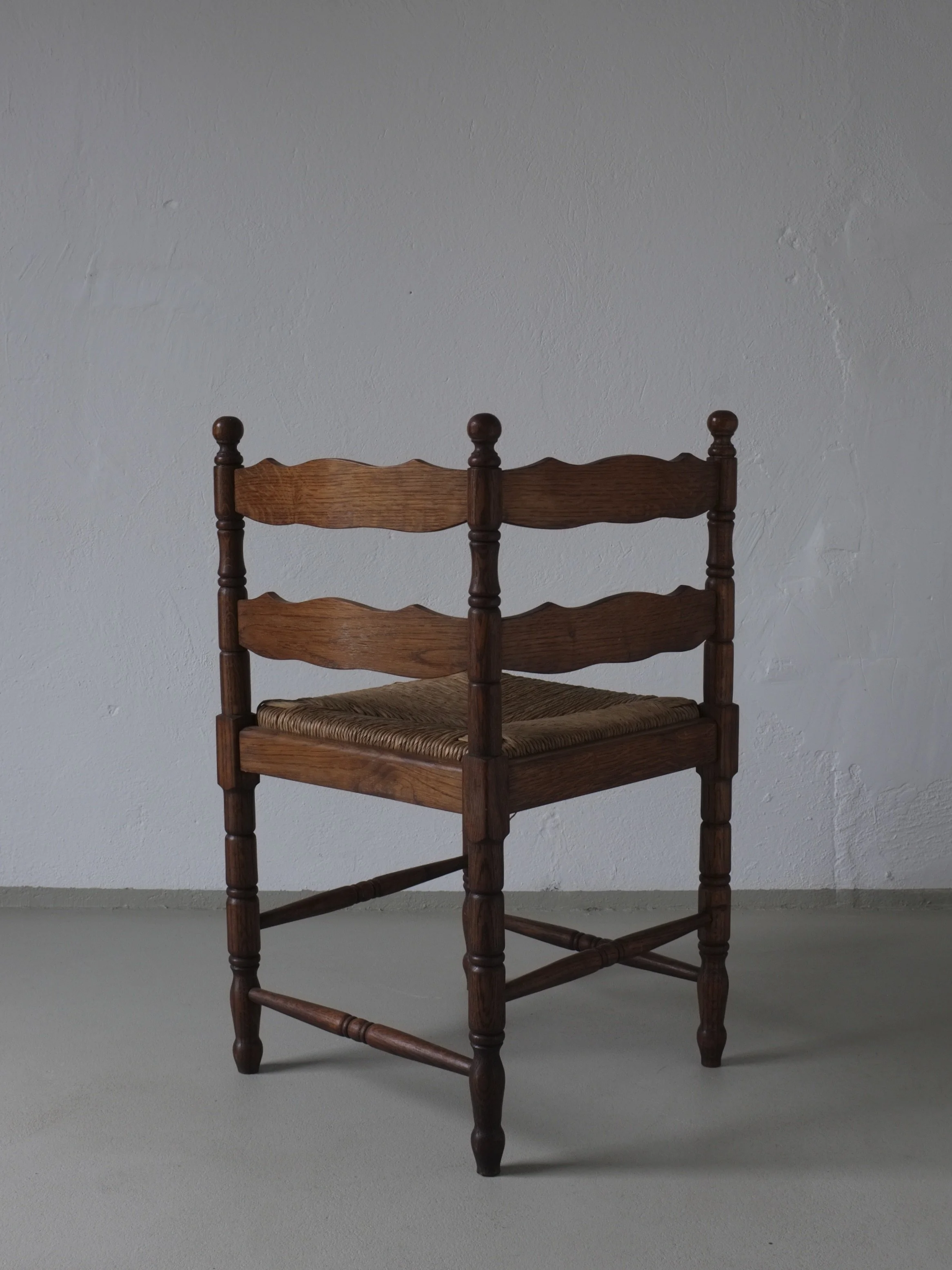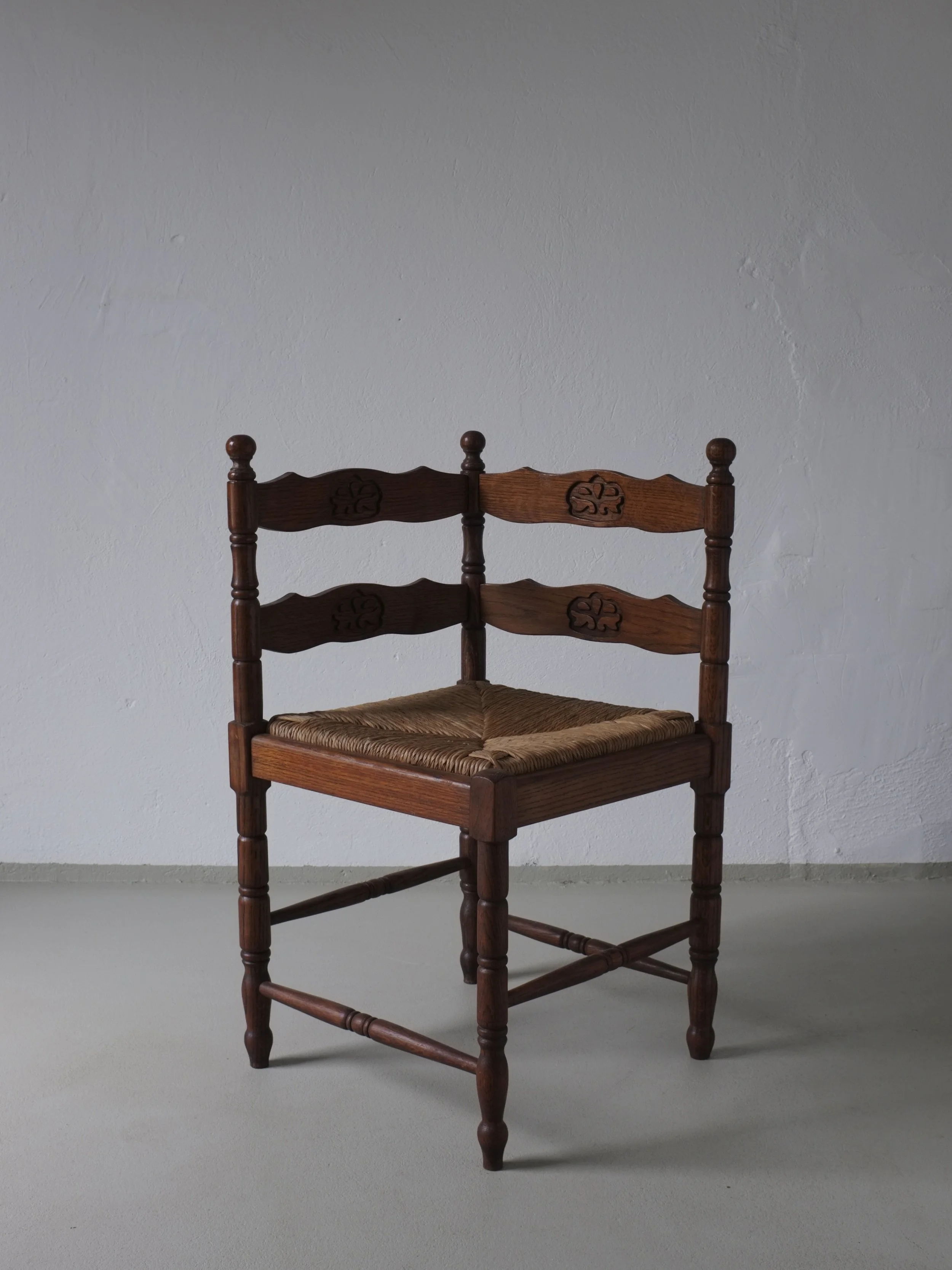 Vintage corner chair crafted in dark-stained oak with turned legs and hand-carved back panels.