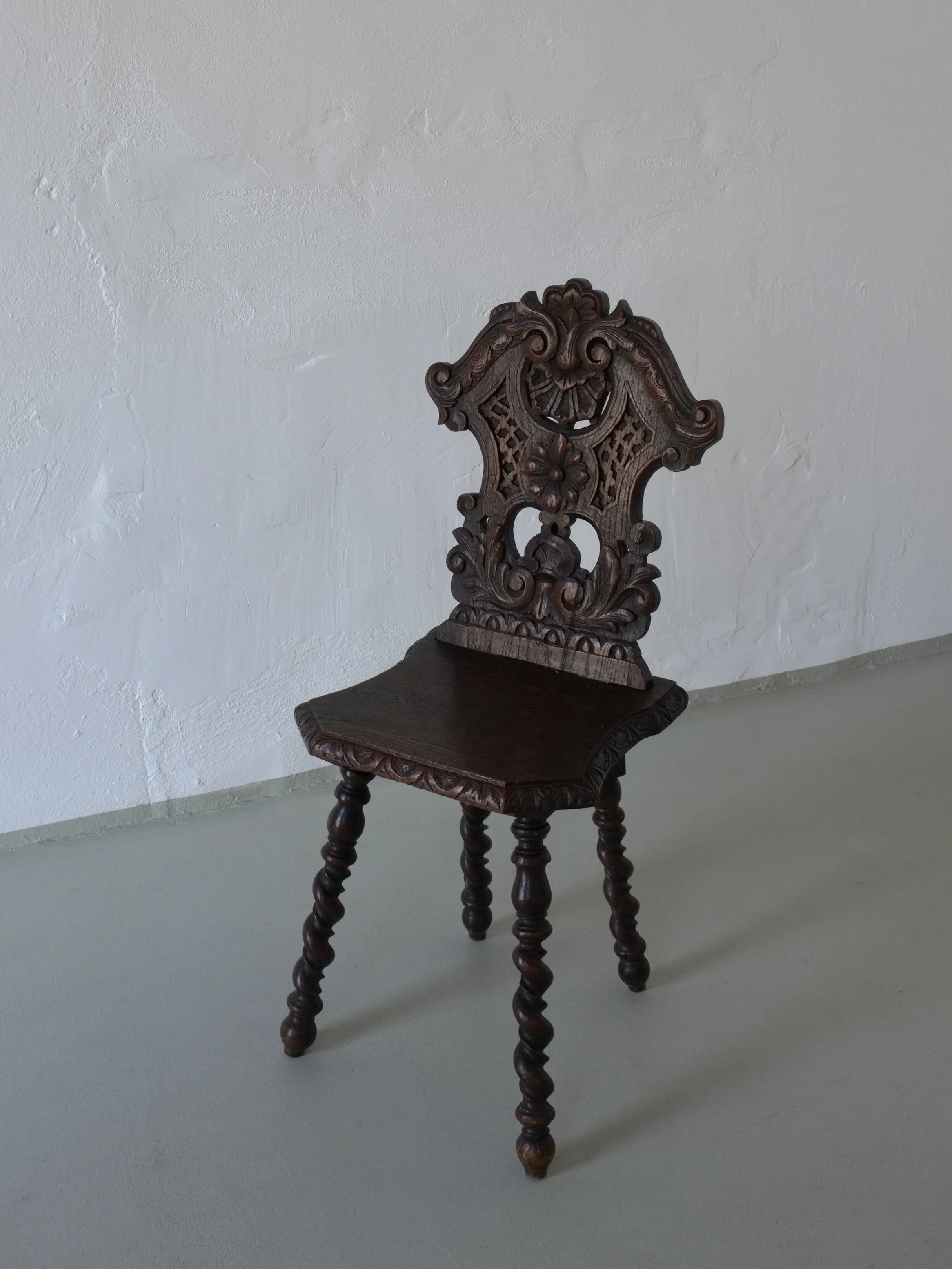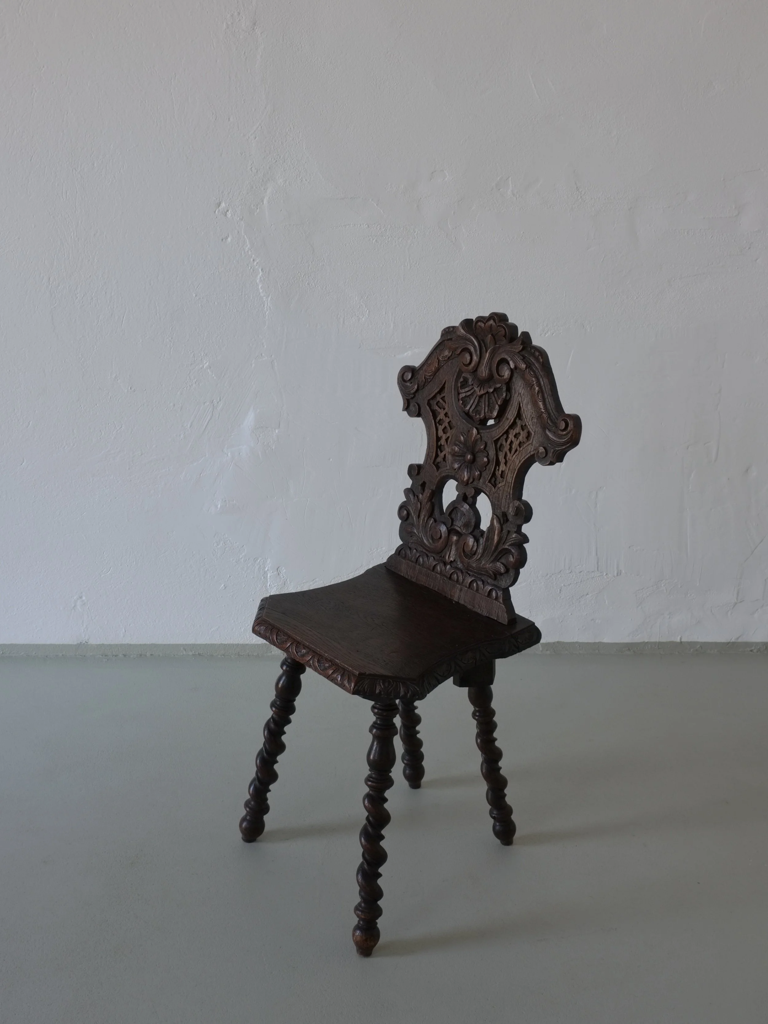 Antique hand-carved oak side chair with a sculptural backrest and turned legs.