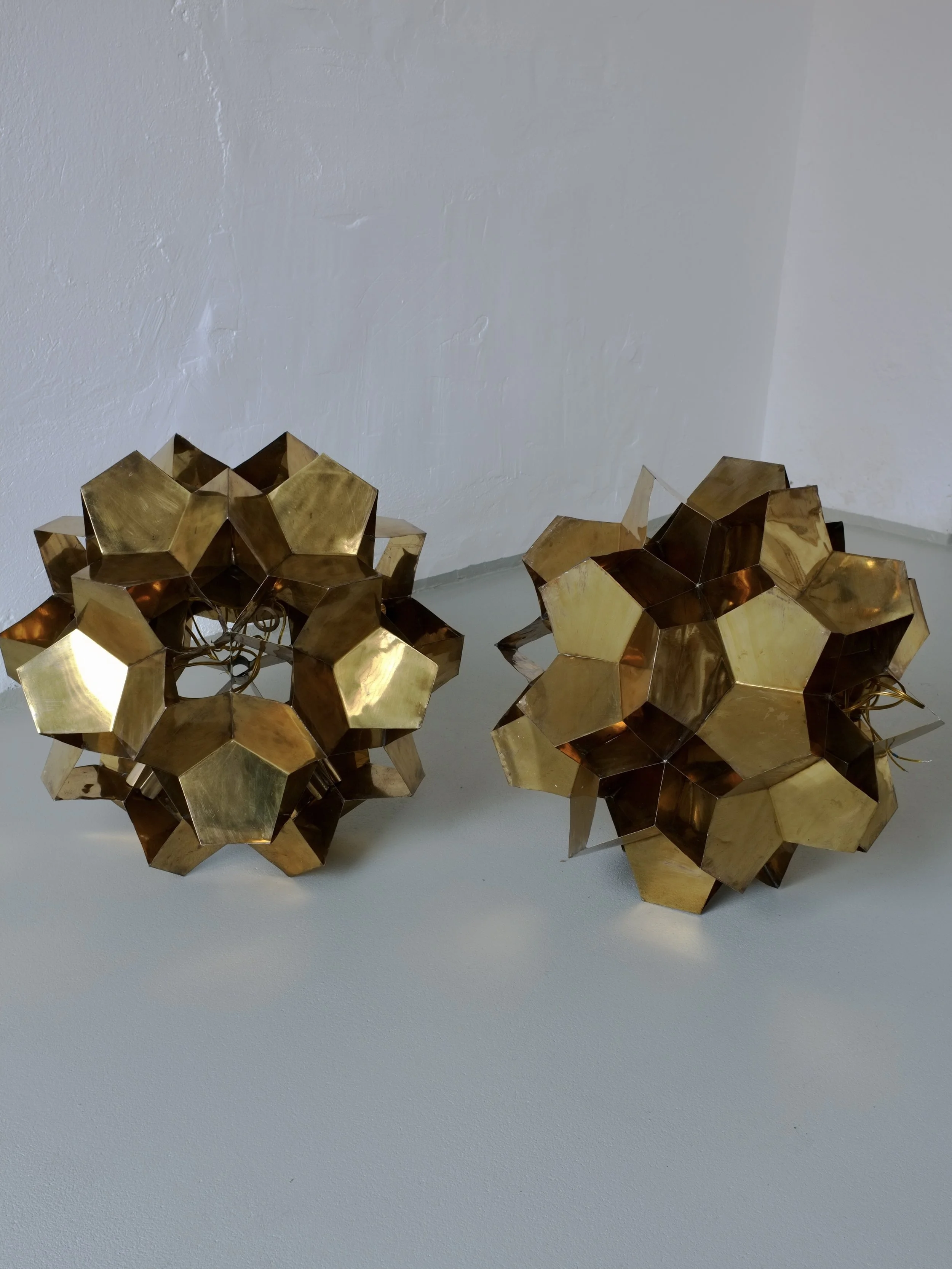 These unique solid brass pendant lamps were designed and handcrafted at the Arts & Crafts Combine in the 1970s, specifically for the local art school’s concert hall. The lamp can be used as a pendant light or as a sculptural lighting piece. Each lamp features five light sources, compatible with E27 bulbs. The lamp will arrive disassembled - the pole and the lamp. 2 lamps are available.