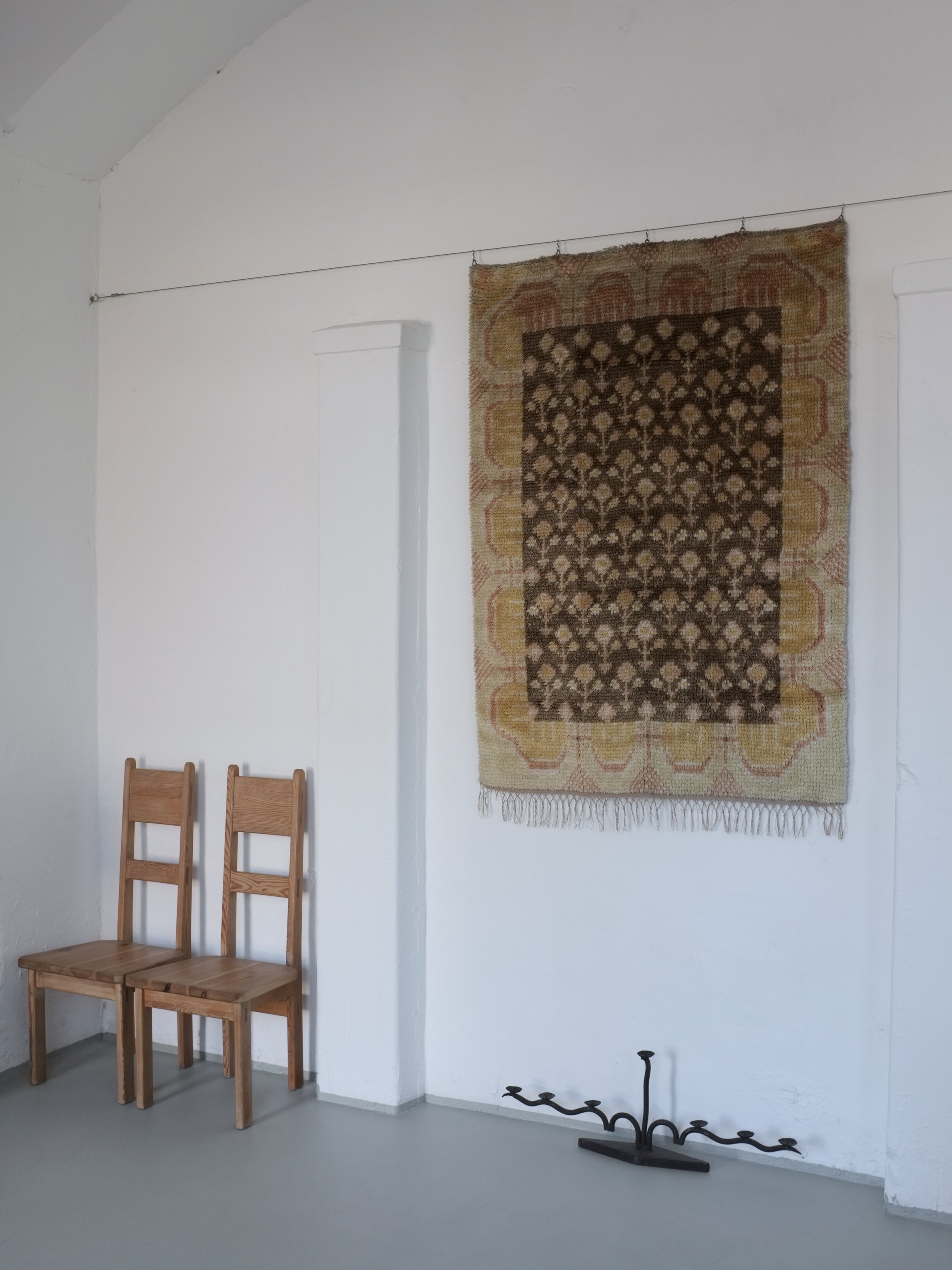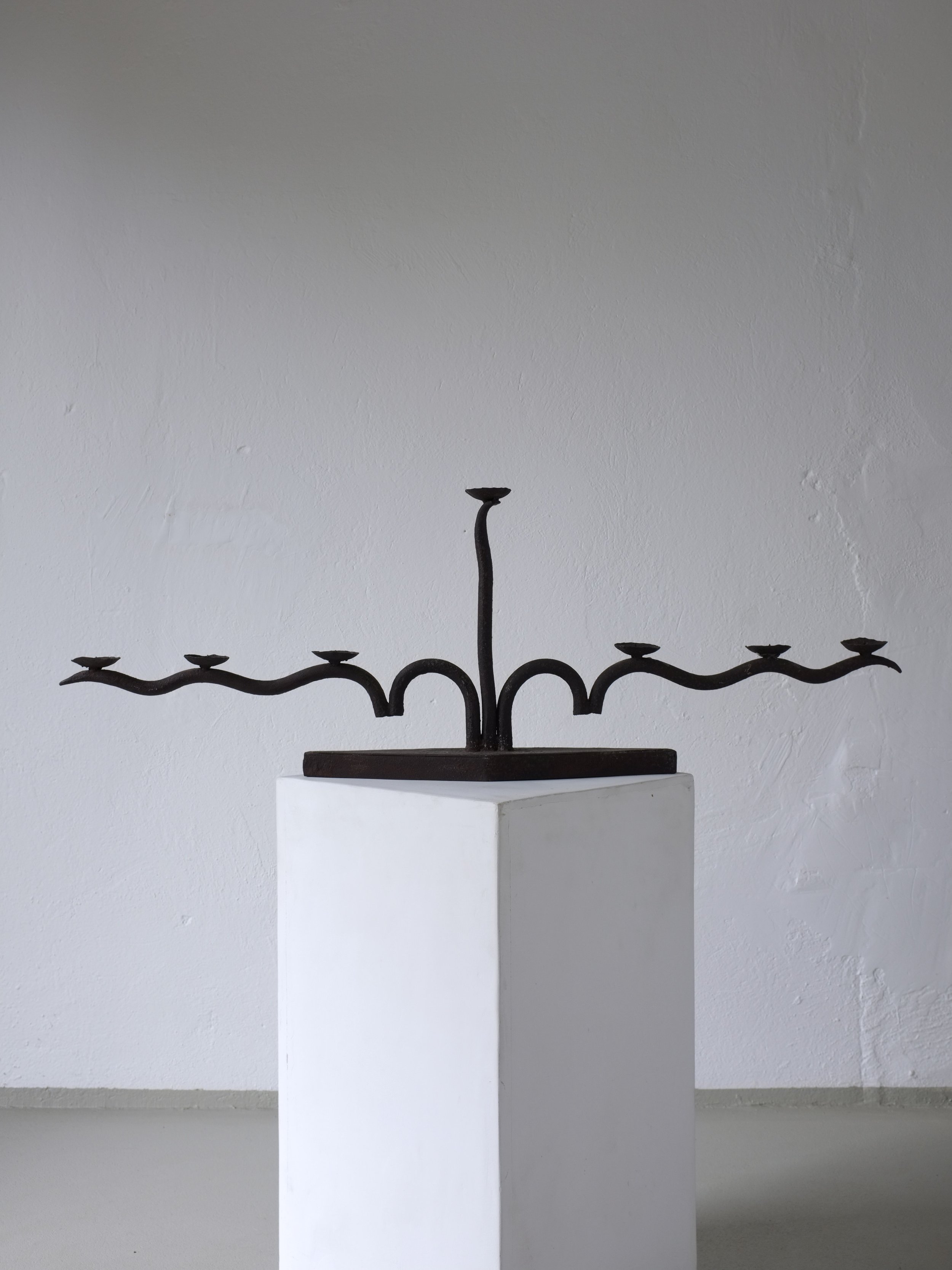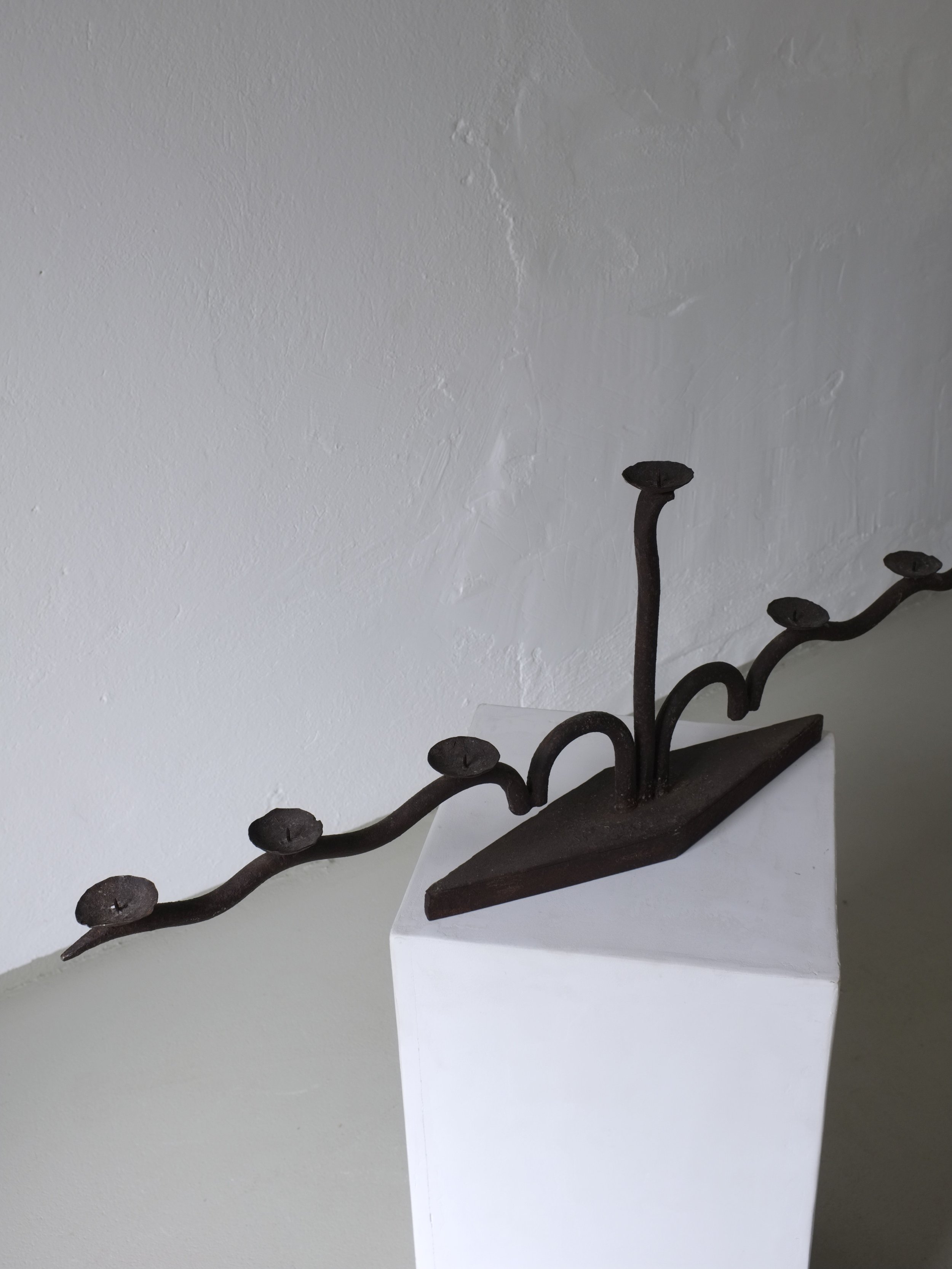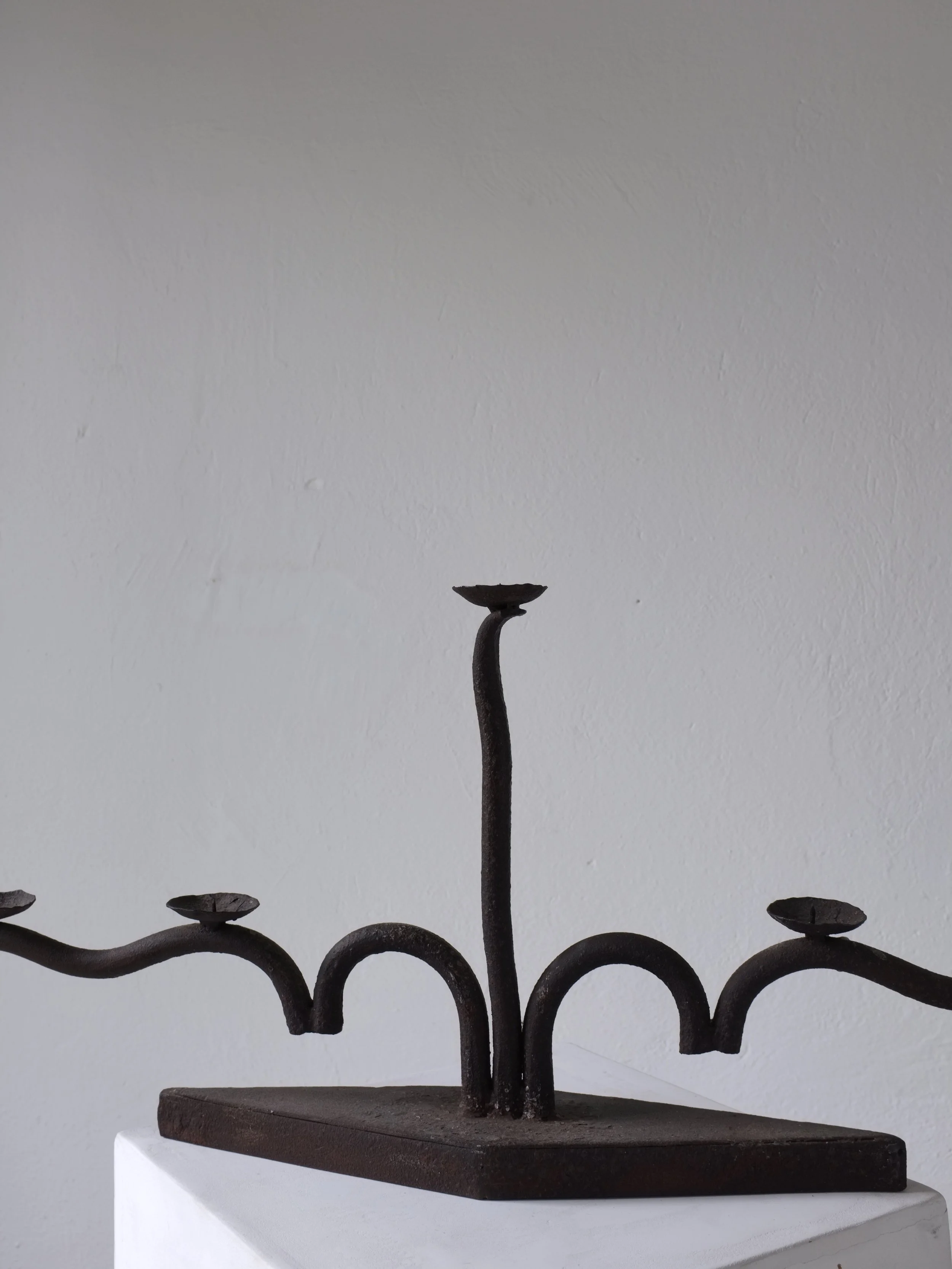 Heavy primitive sculptural candelabra in dark wrought iron with seven candle holders. Handmade, with a rustic texture and solid weight — perfect as a dramatic centerpiece or sculptural accent.