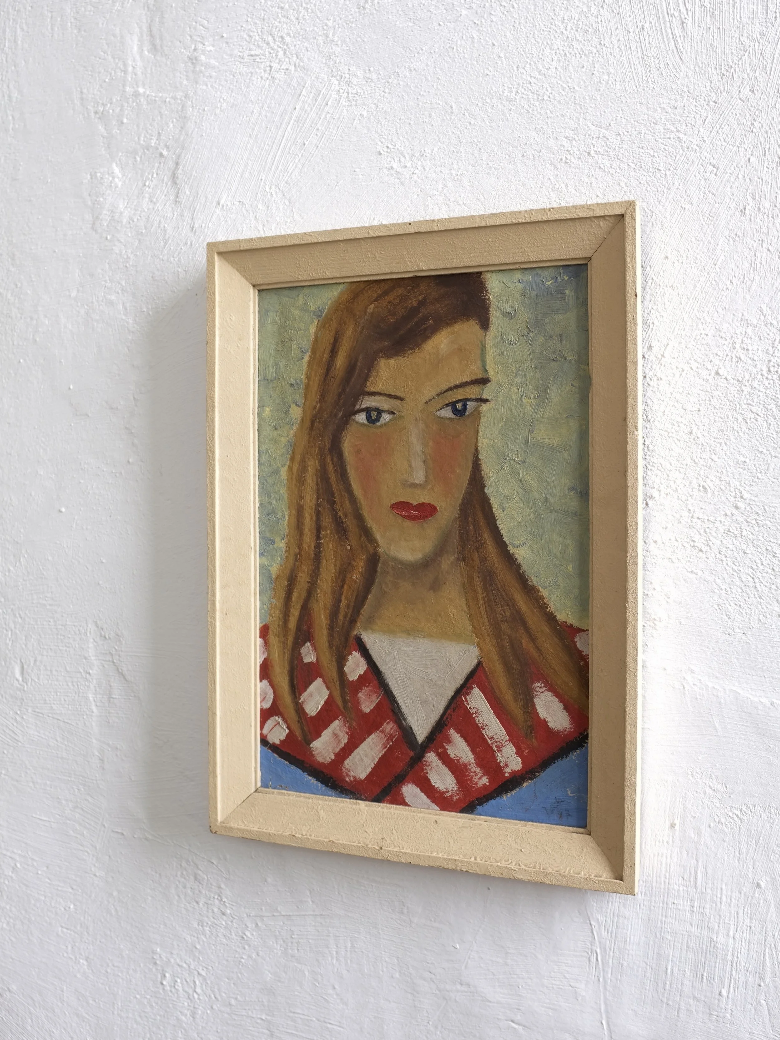 Modernist portrait of a woman painted in oil on board and dated 1947, this work features geometric brushwork, vibrant red and blue accents, and a textured pastel background. A unique example of post-war European modernism with echoes of naive and primitivist styles.