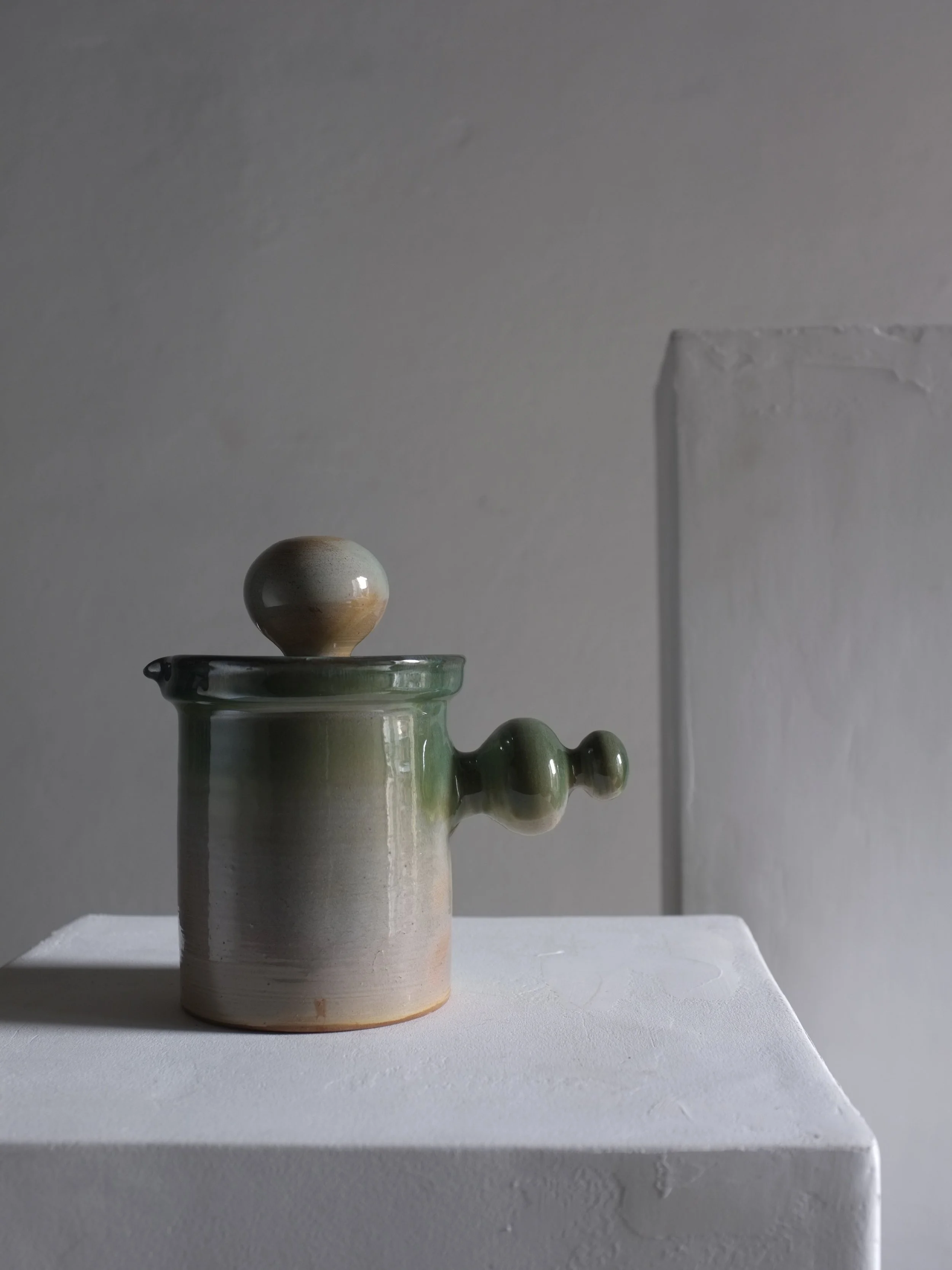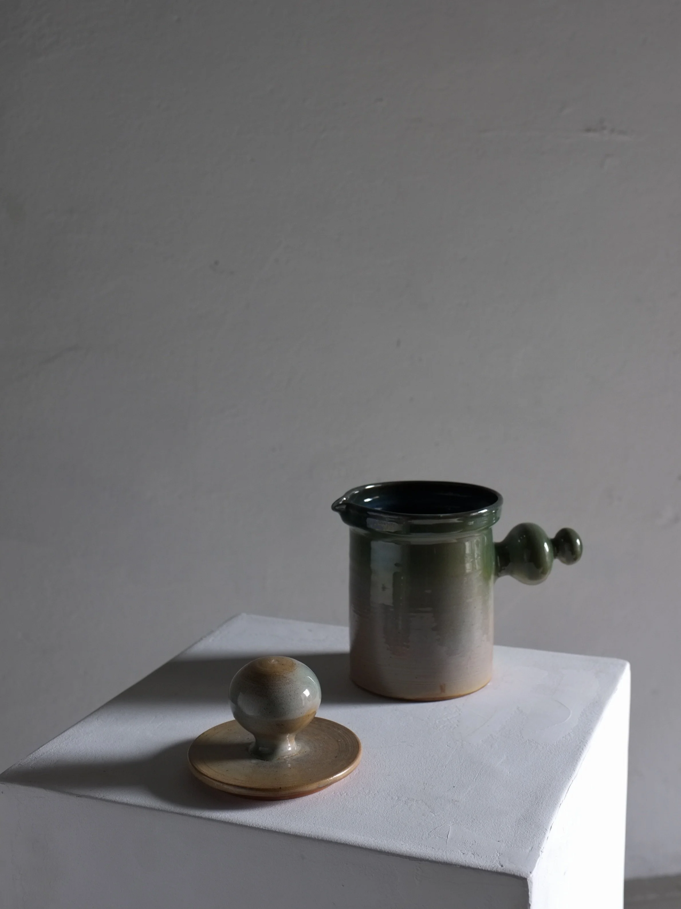 Vintage Latvian ceramic teapot with a sculptural silhouette and triple-bulb handle. Finished in a gradient green and beige glaze with a rounded lid. A unique studio pottery piece from the 1970s, both functional and decorative.