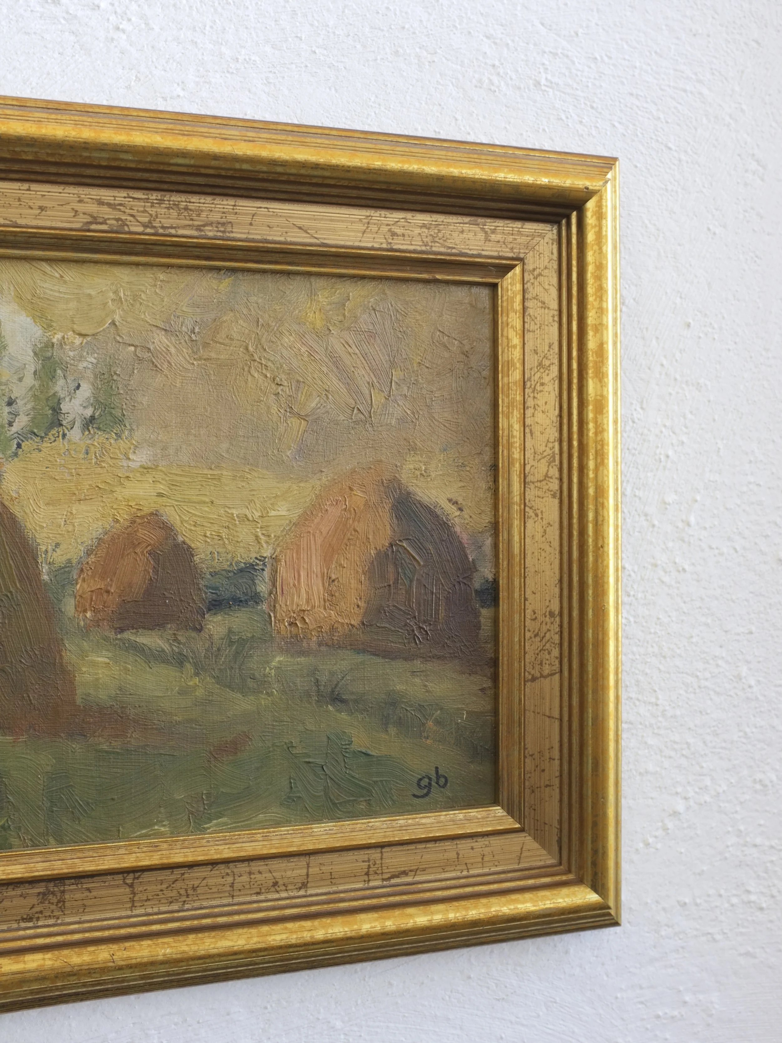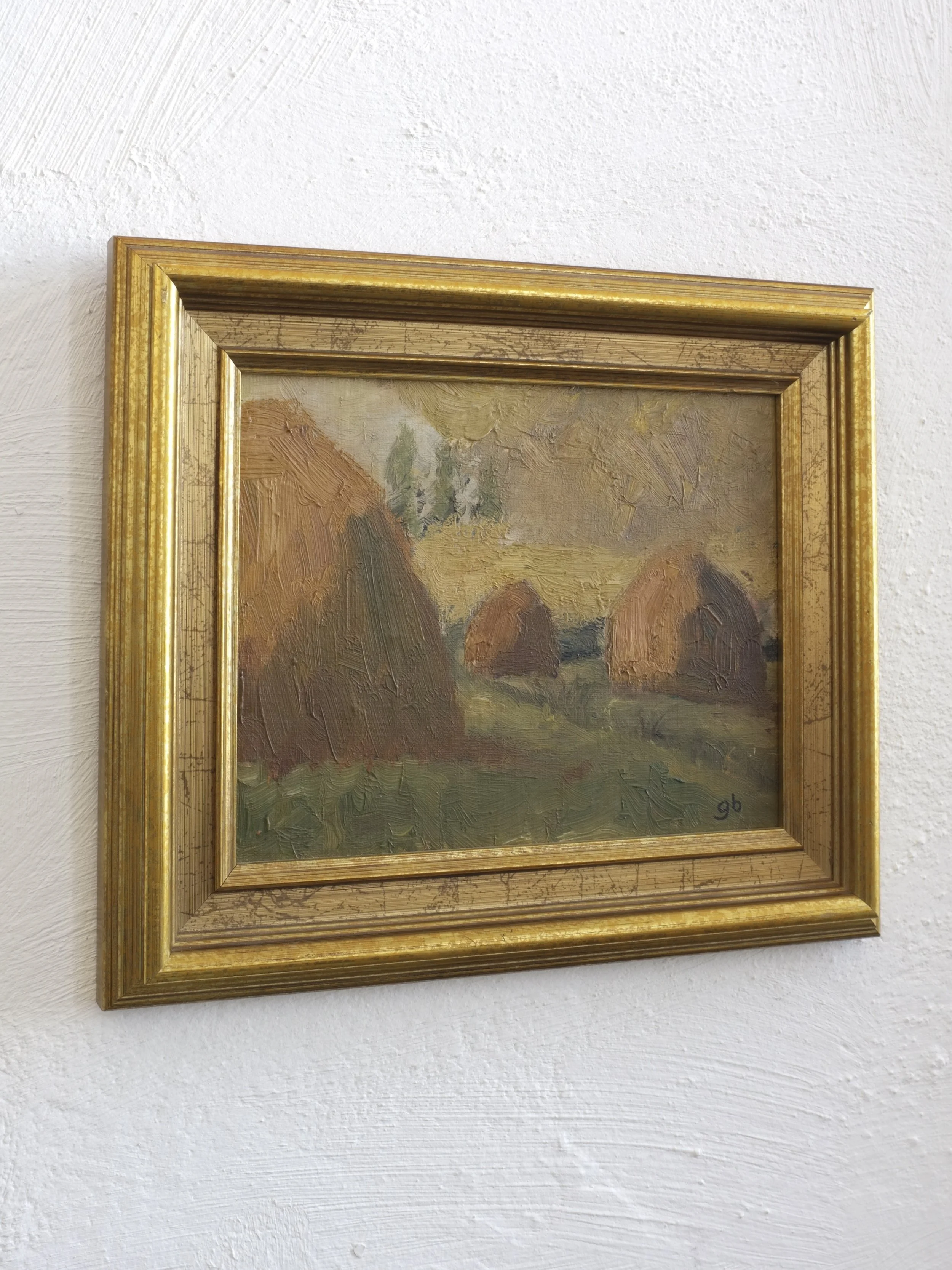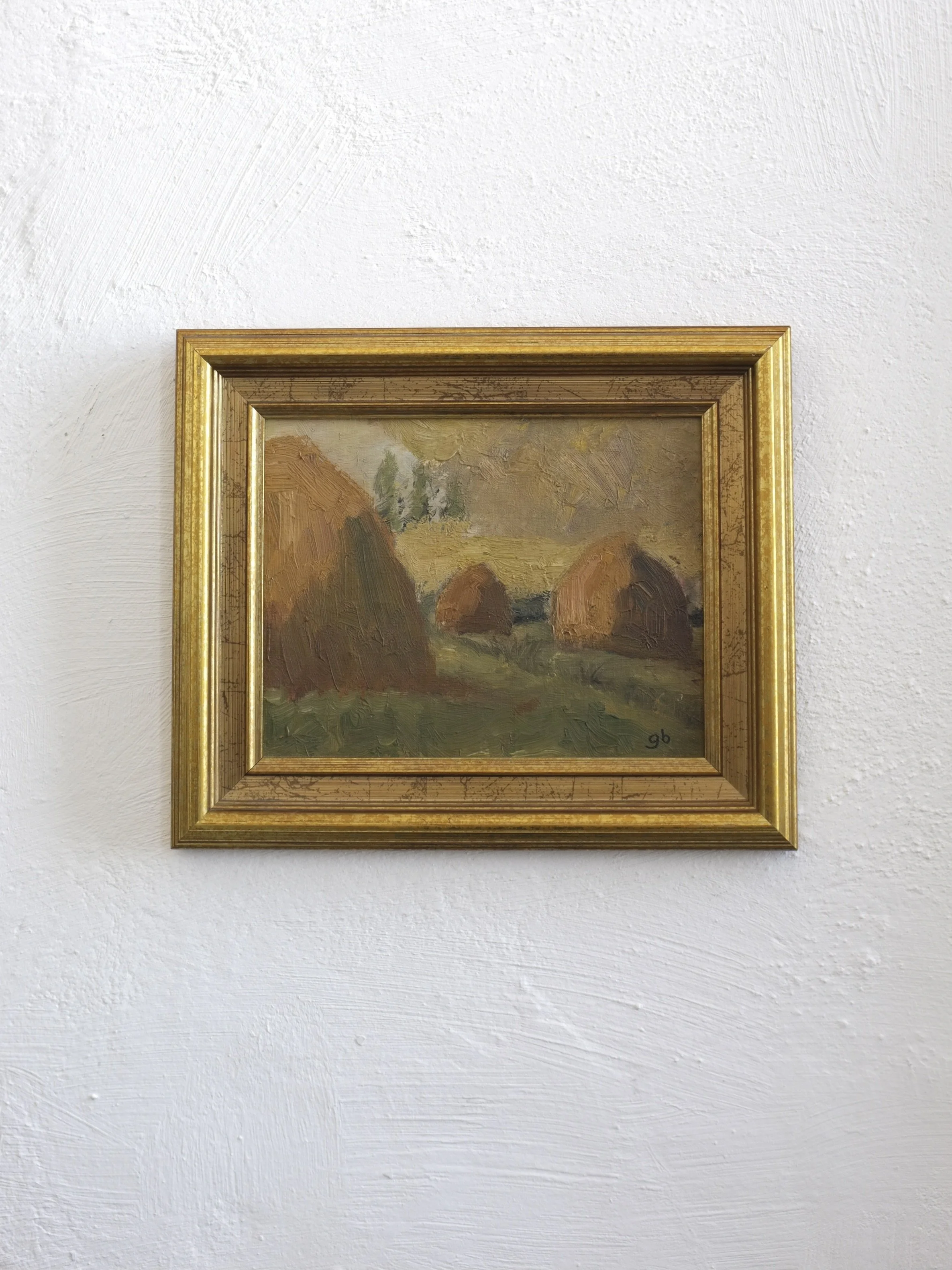 A small landscape oil painting featuring haystacks in warm brown and green tones. It is painted on board with visible brushstrokes and signed with the initials