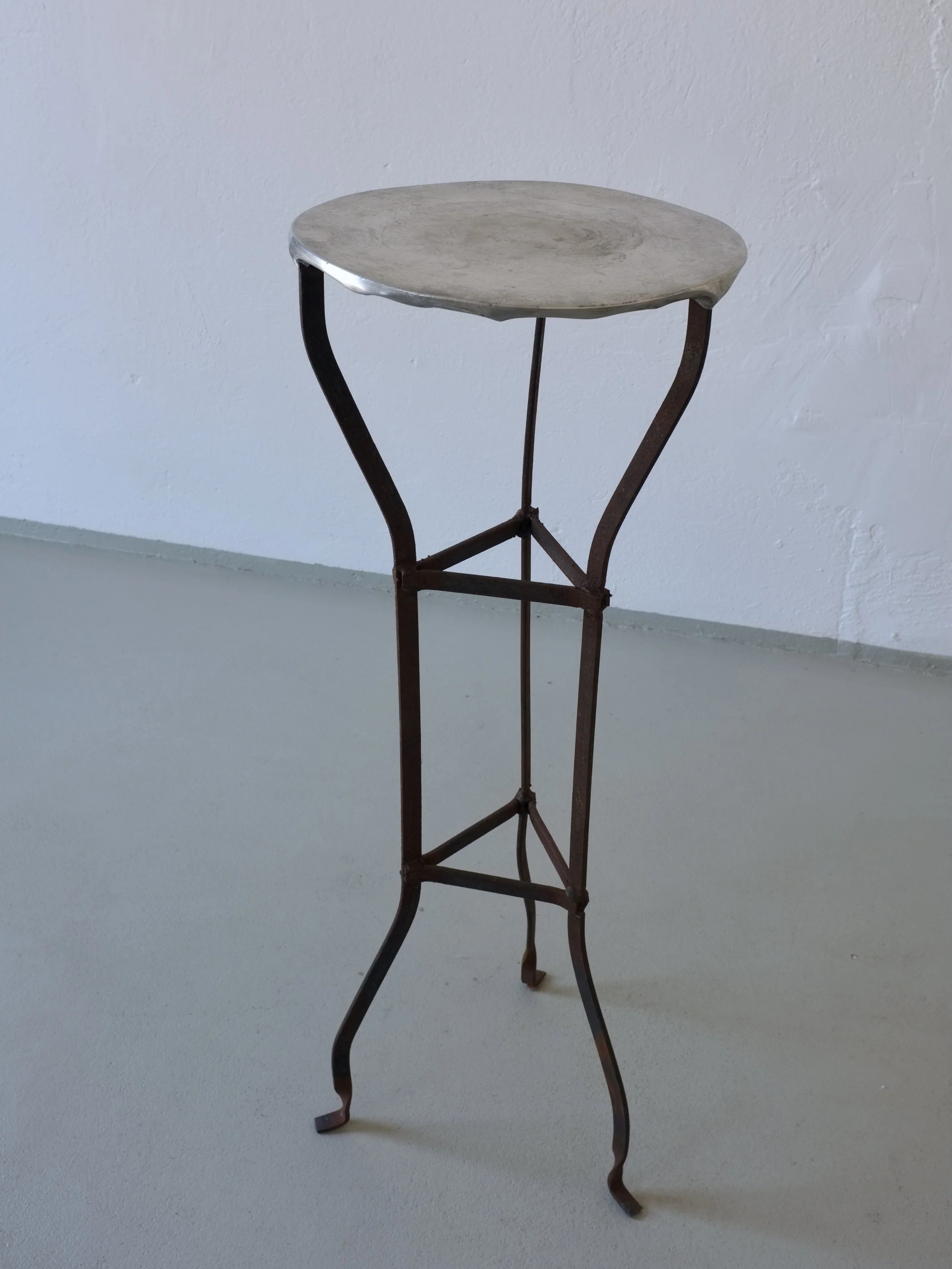 Vintage metal plant stand or side table featuring a round, hand-forged metal top with an organic edge. The slender wrought iron frame has a rusty patina and four splayed legs with geometric crossbars.