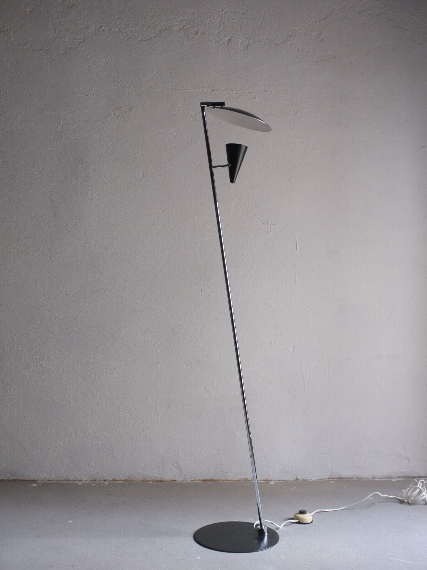 Vintage minimalist floor lamp designed in the 70s. Steel base with a rotatable black-covered metal reflector shade.