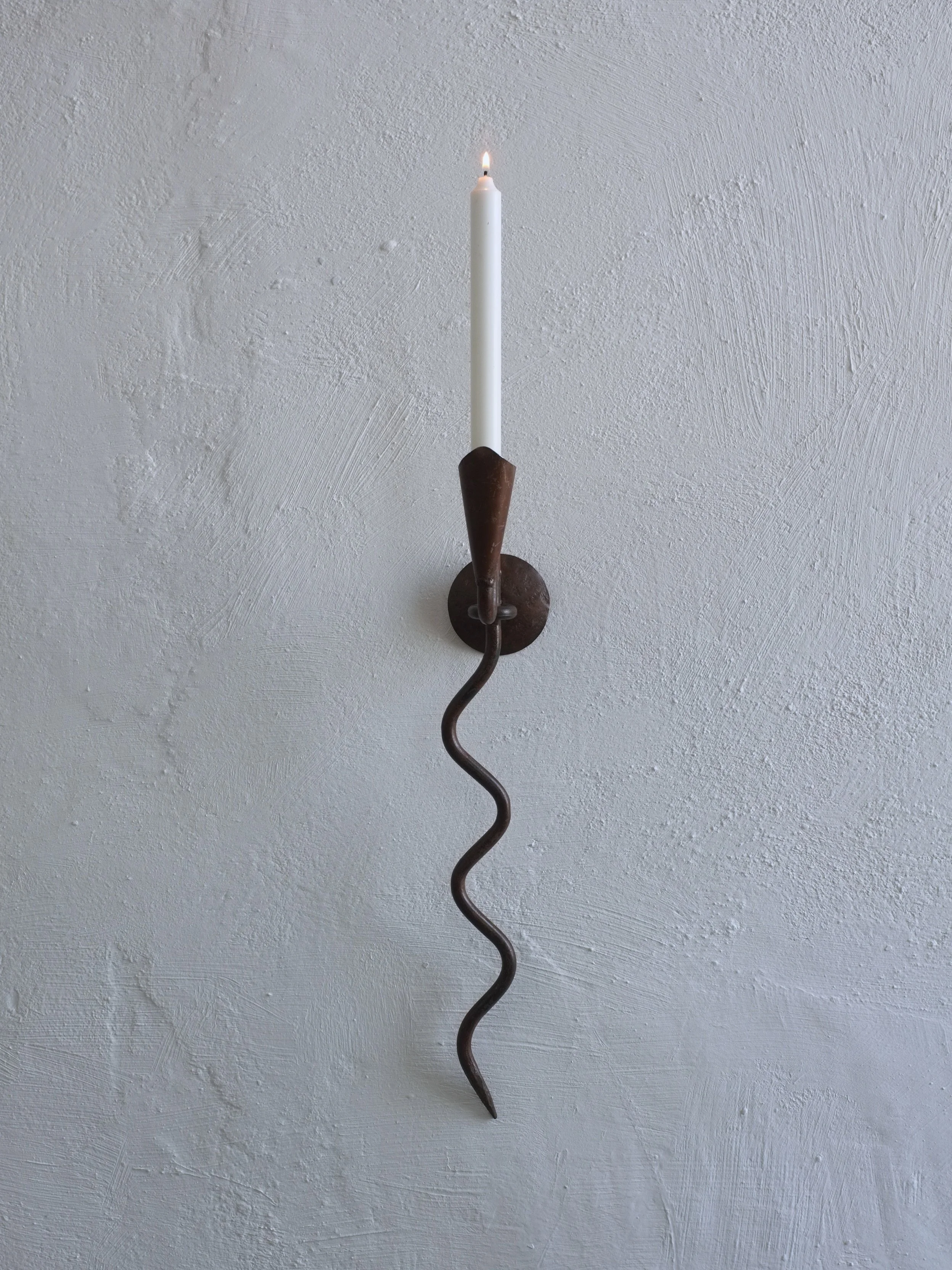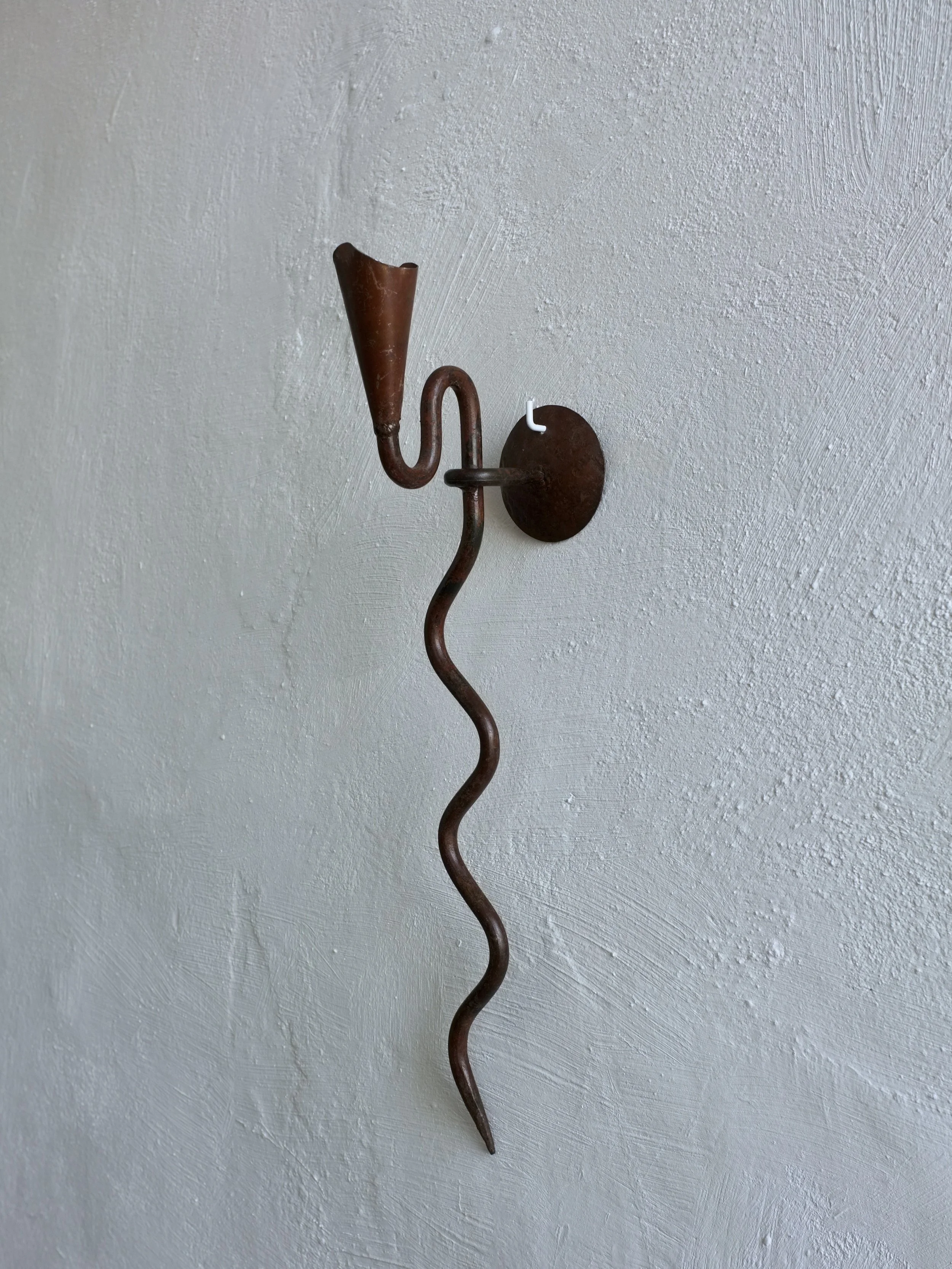Minimalist wall-mounted candle holder in hand-forged iron with a snake-like silhouette. I have one more with black coating.