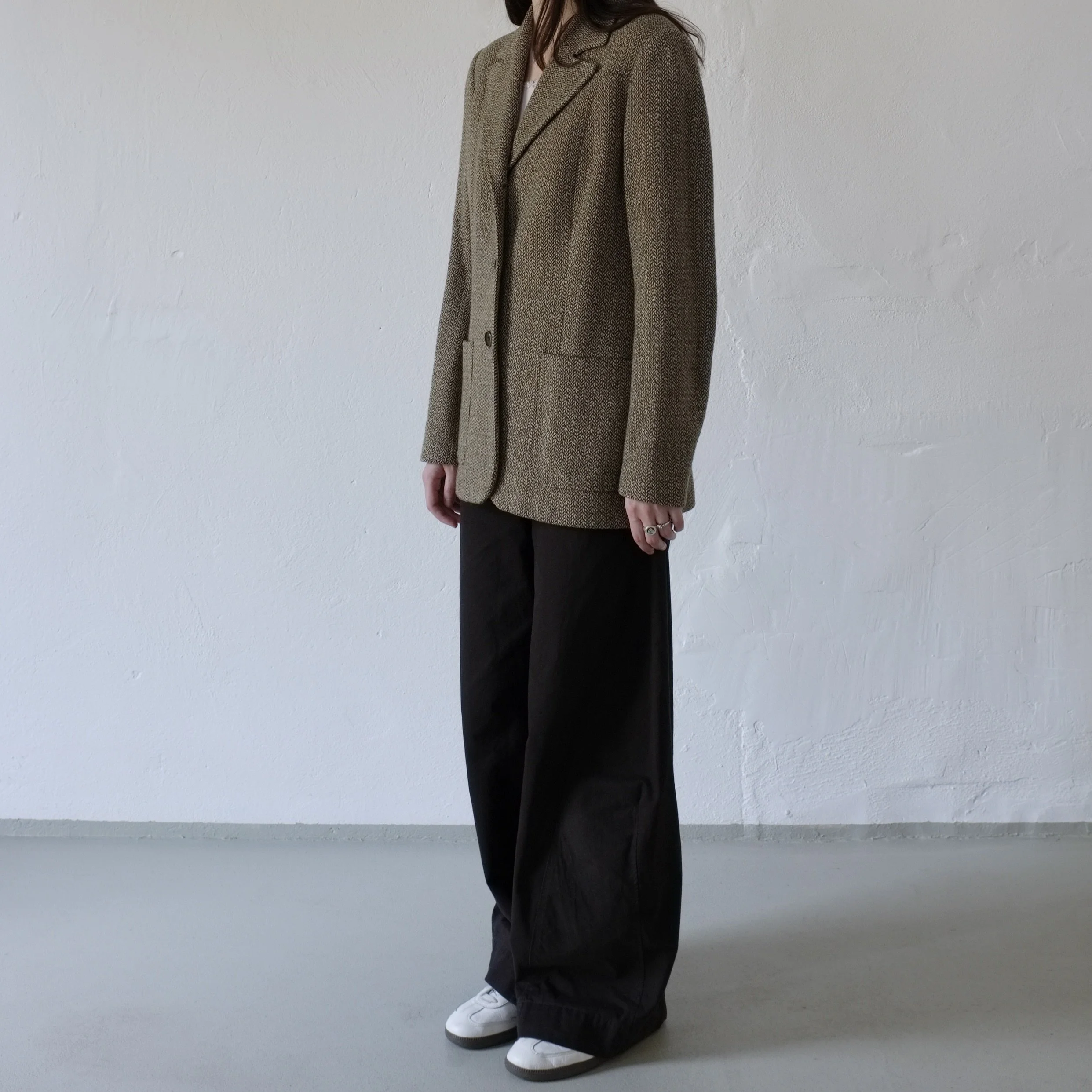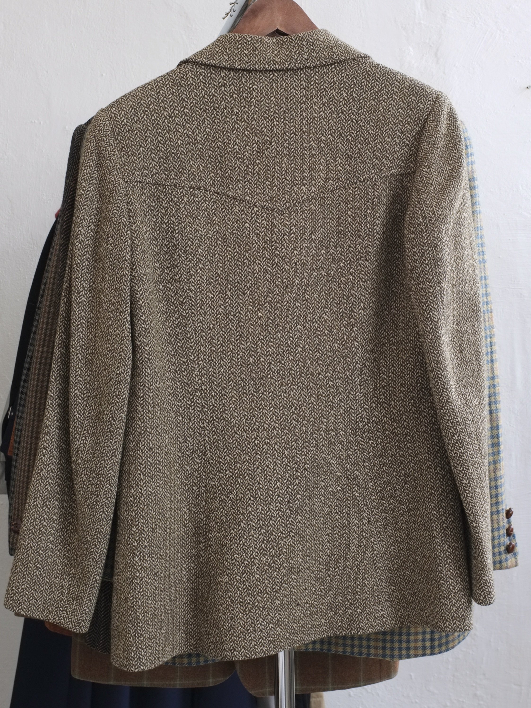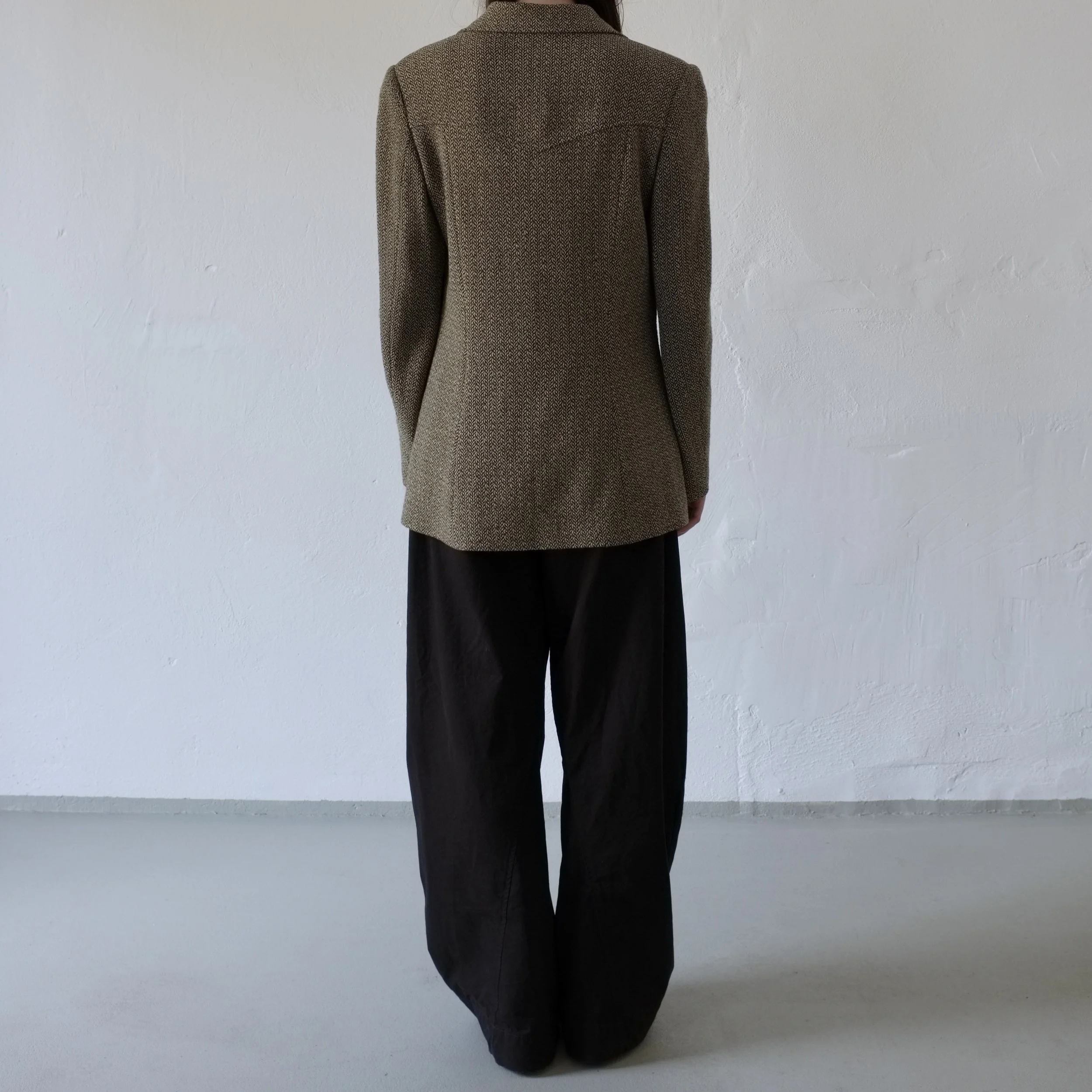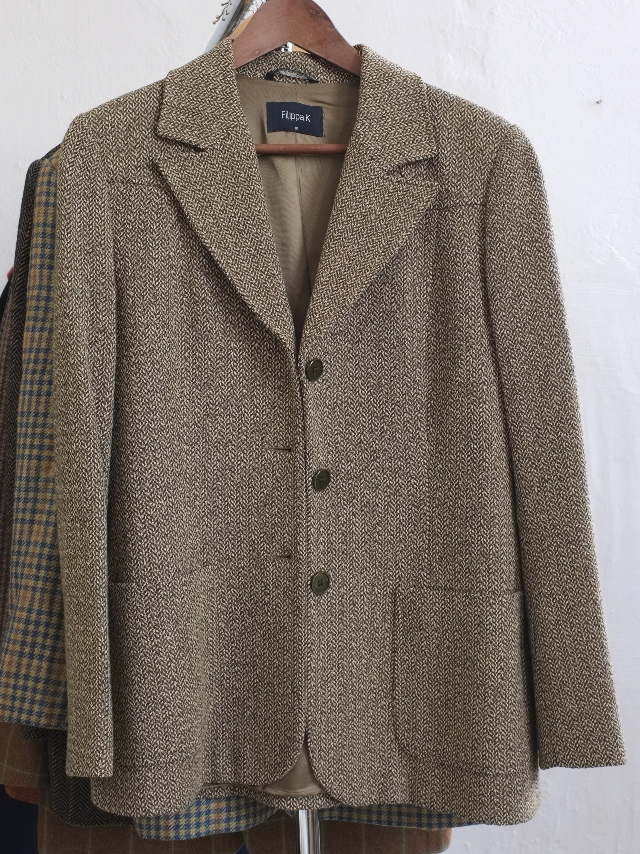 Soft structured olive grey wool blazer by Filippa K, tailored in Italy. Features a soft herringbone weave, patch pockets, full lining, and a lightly contoured silhouette. Extra button inside.