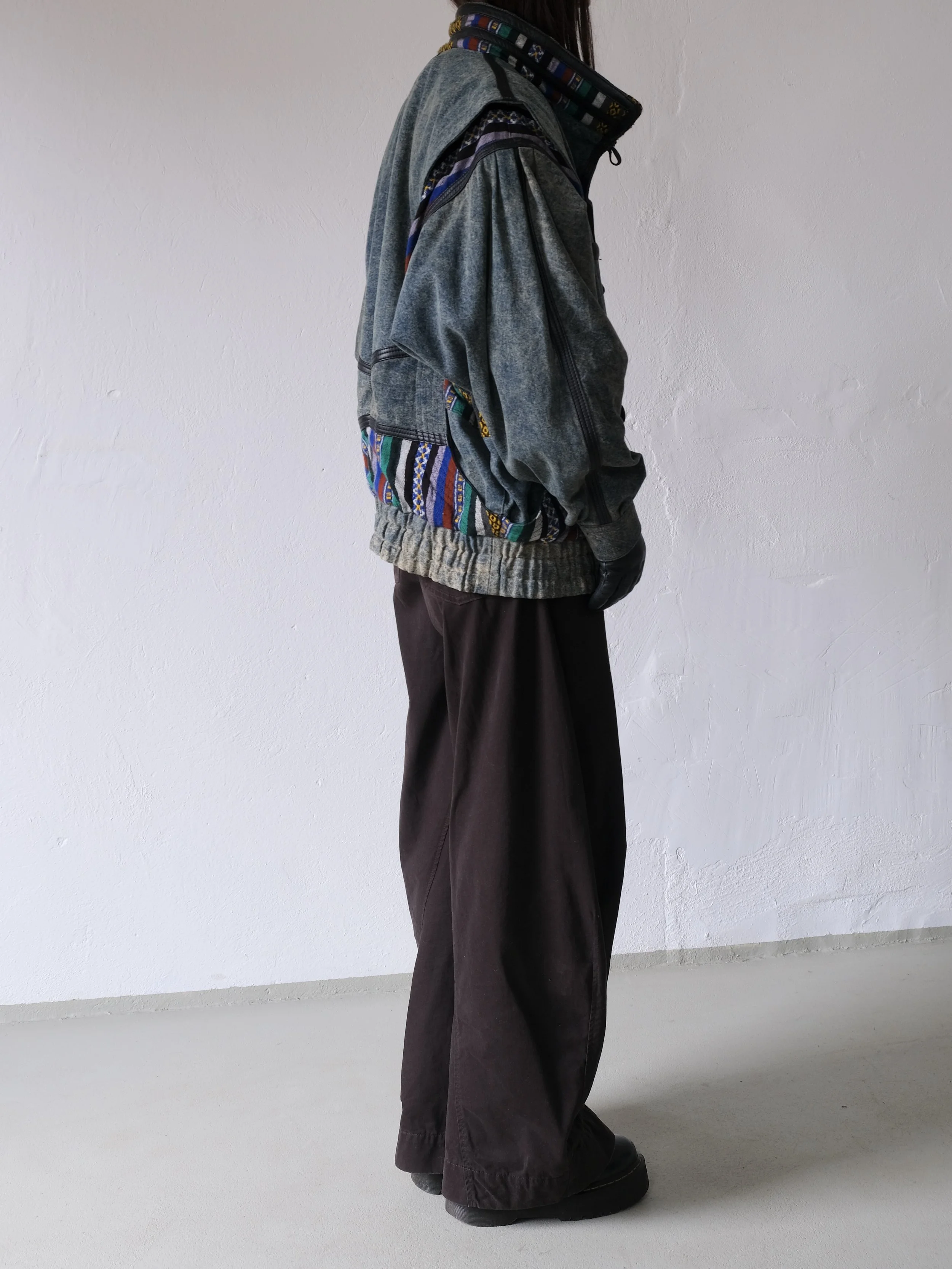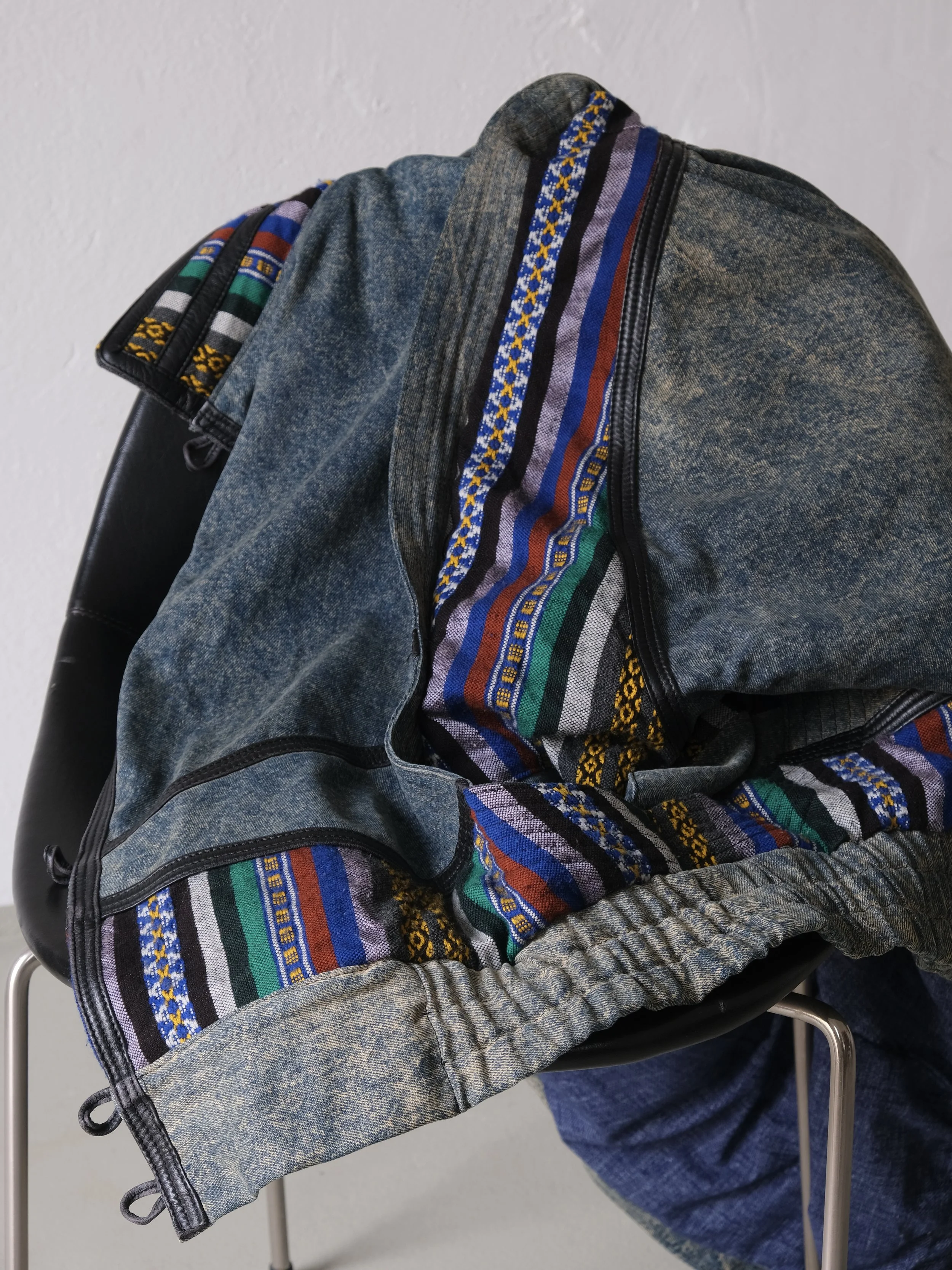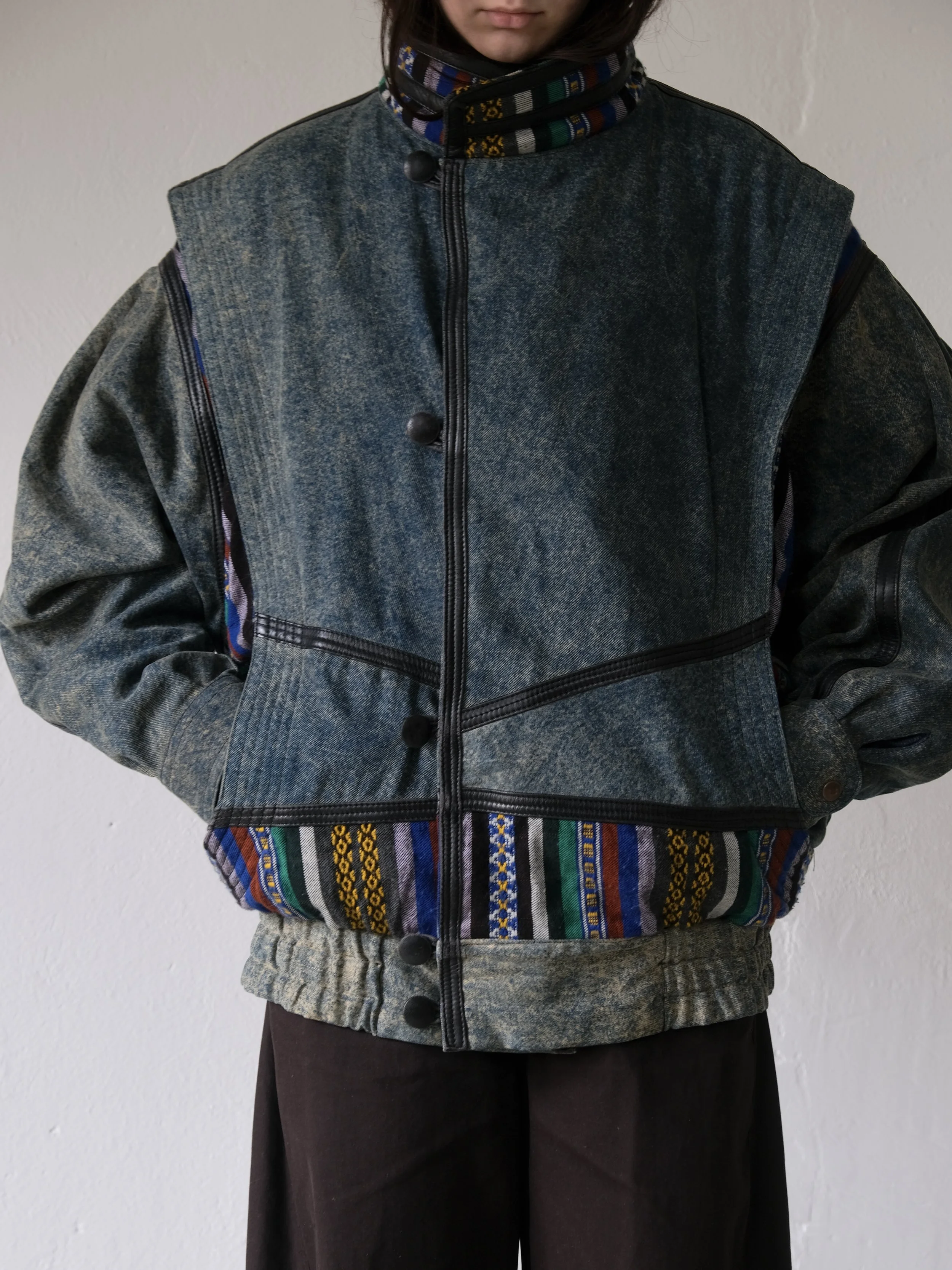 Vintage bomber jacket with batwing sleeves and an exaggerated silhouette. Made from denim fabric with colorful woven ethnic trim and decorative leather seams.
