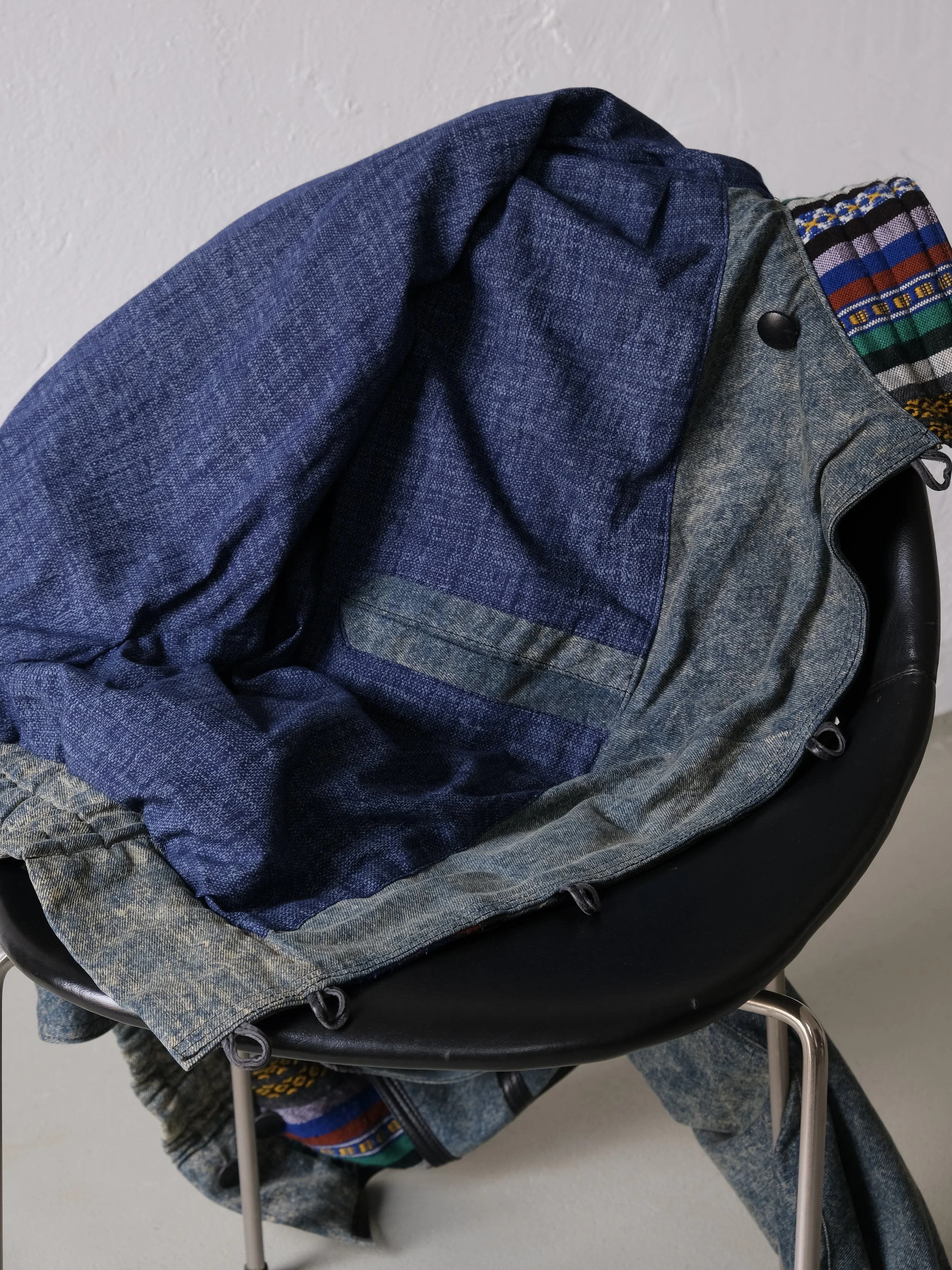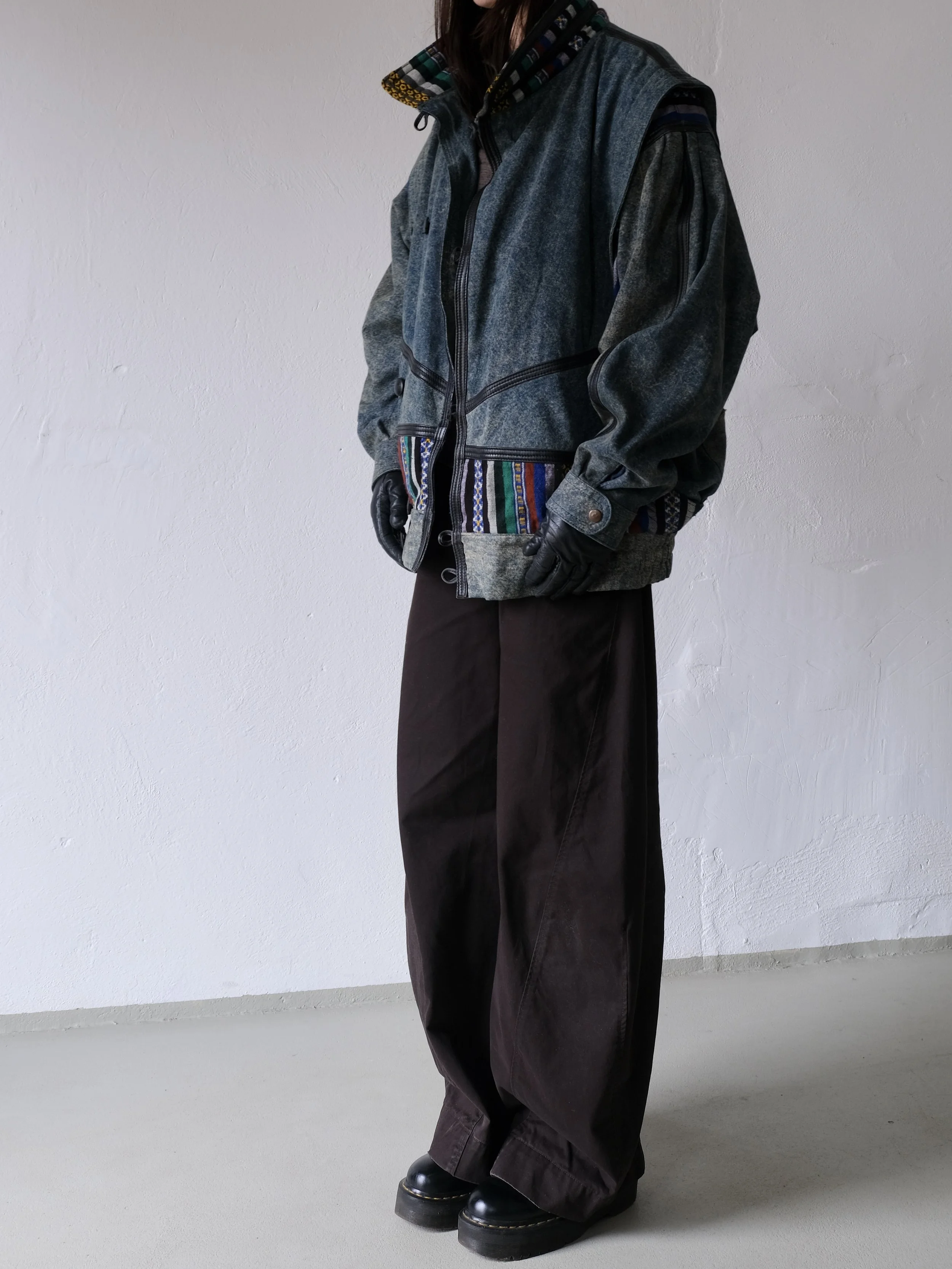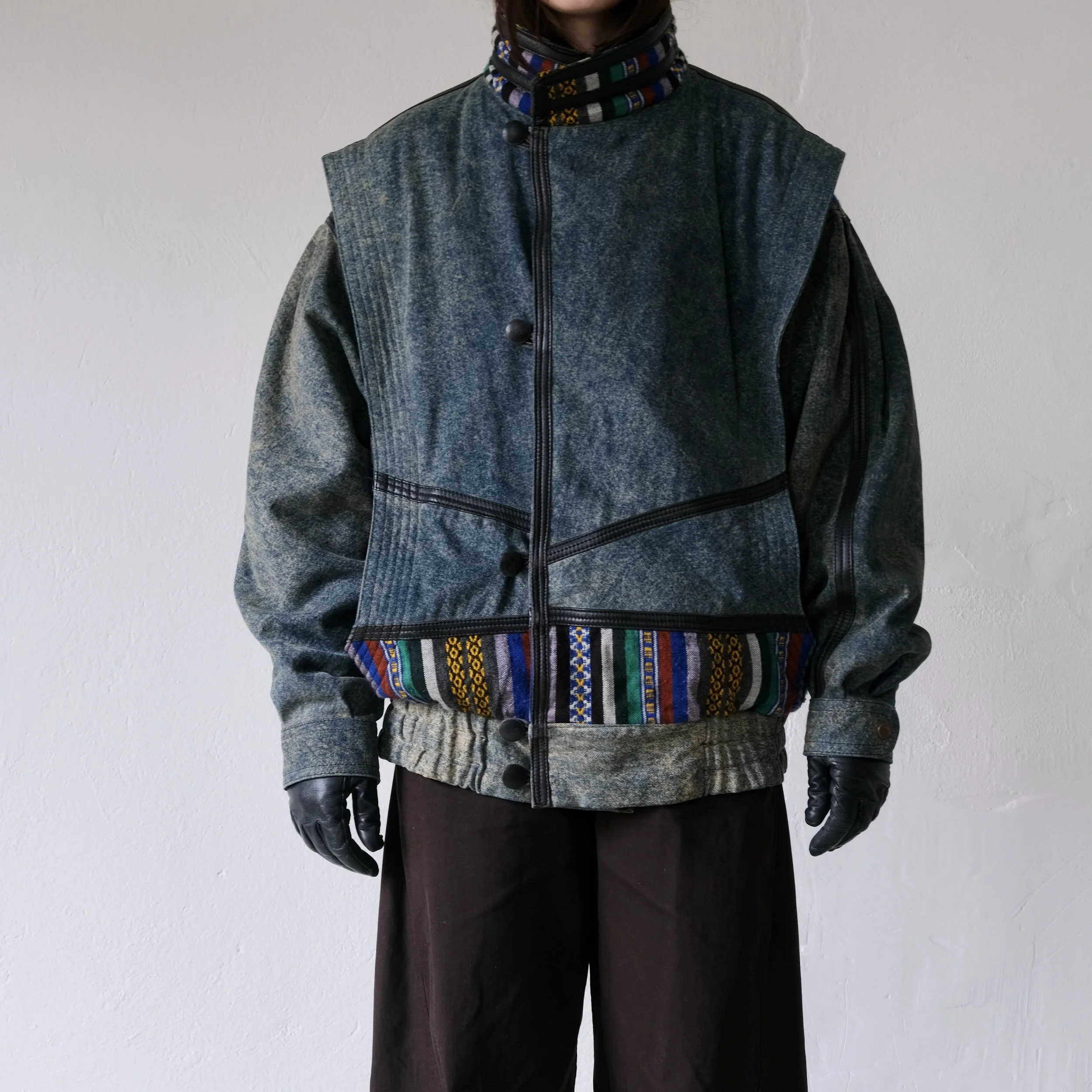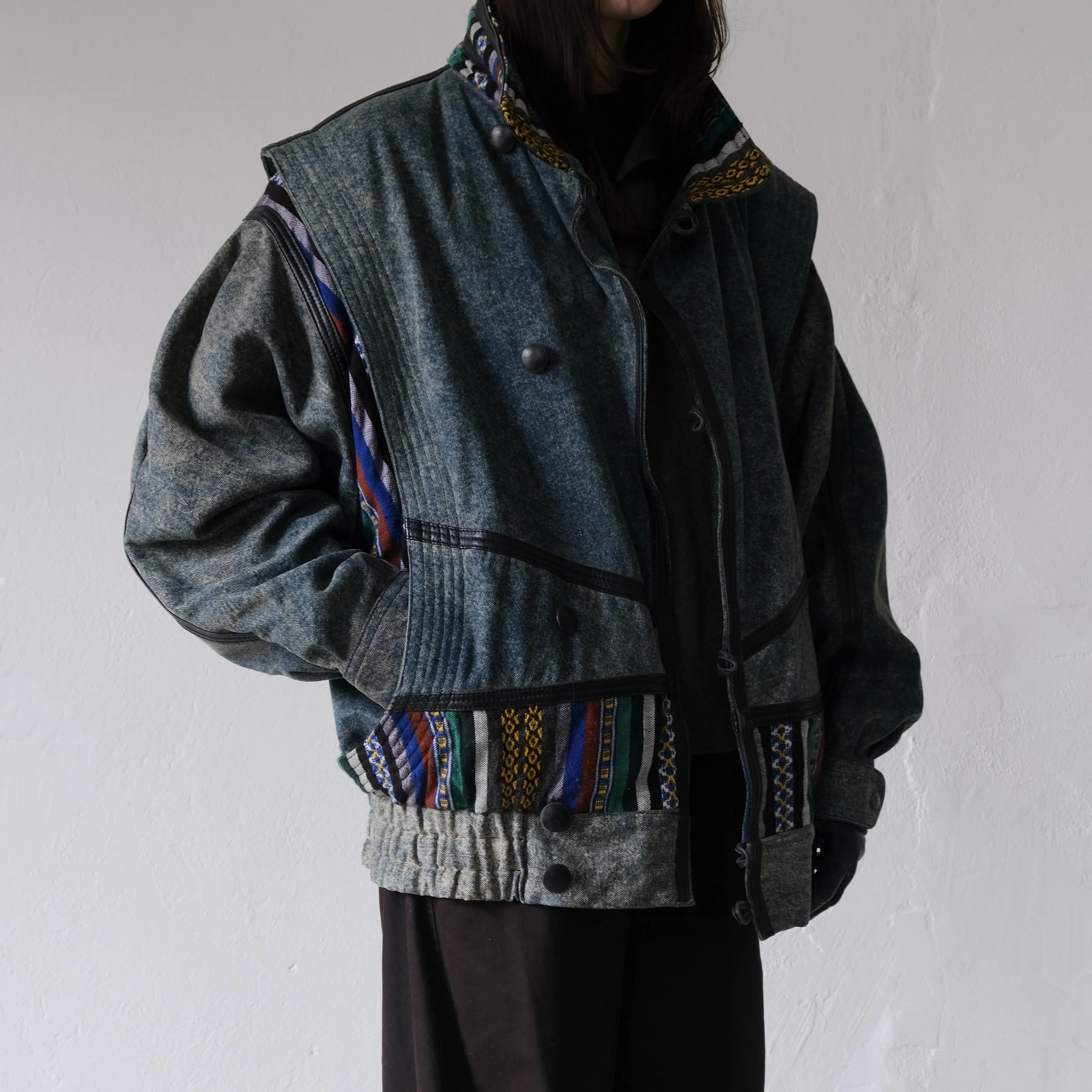 Vintage bomber jacket with batwing sleeves and an exaggerated silhouette. Made from denim fabric with colorful woven ethnic trim and decorative leather seams.