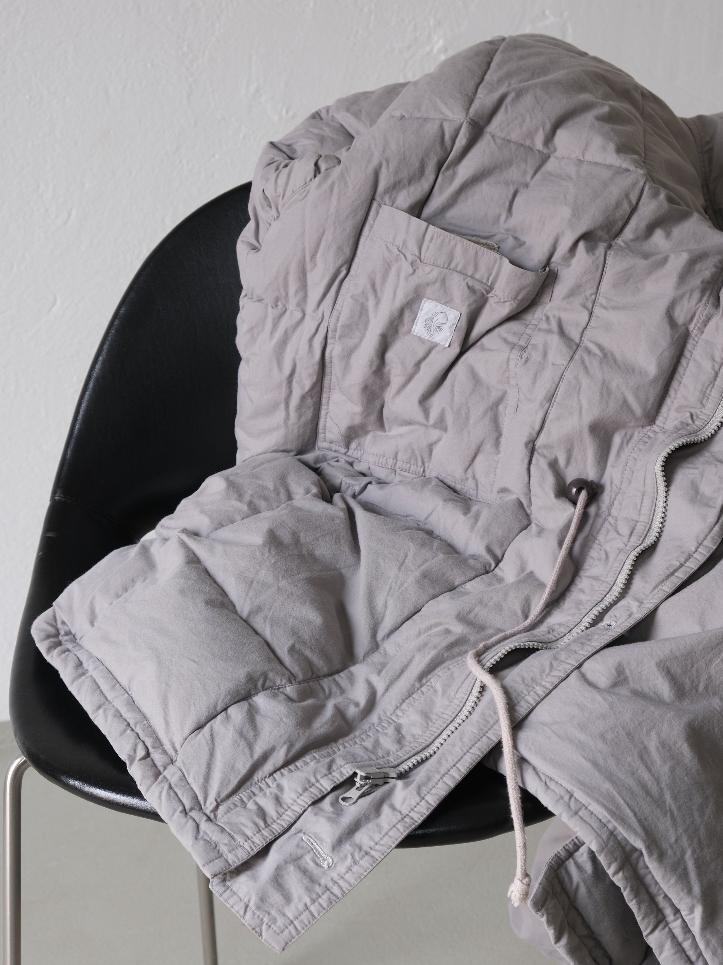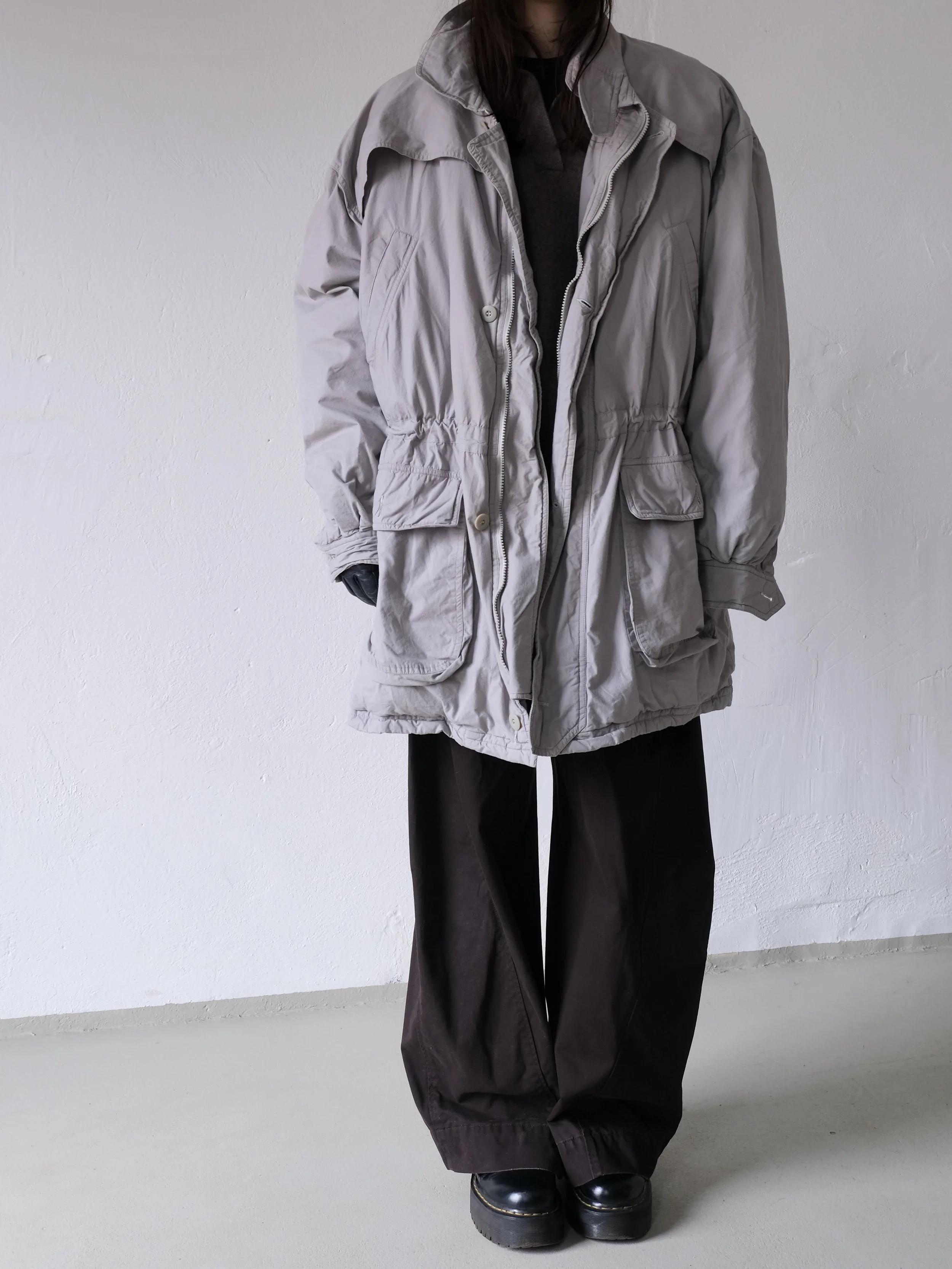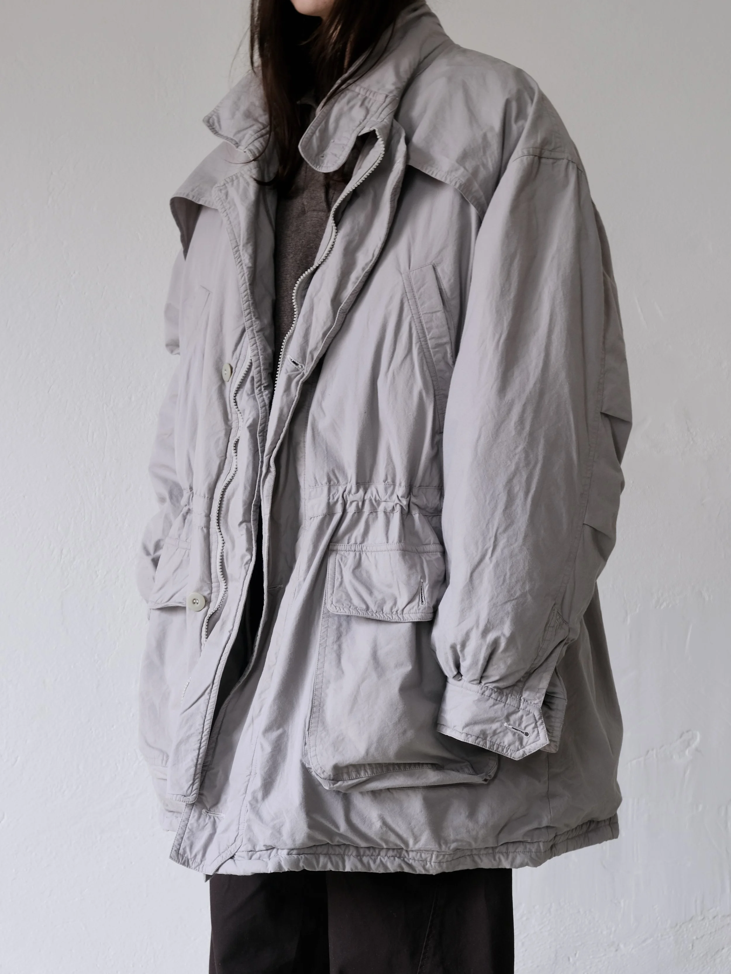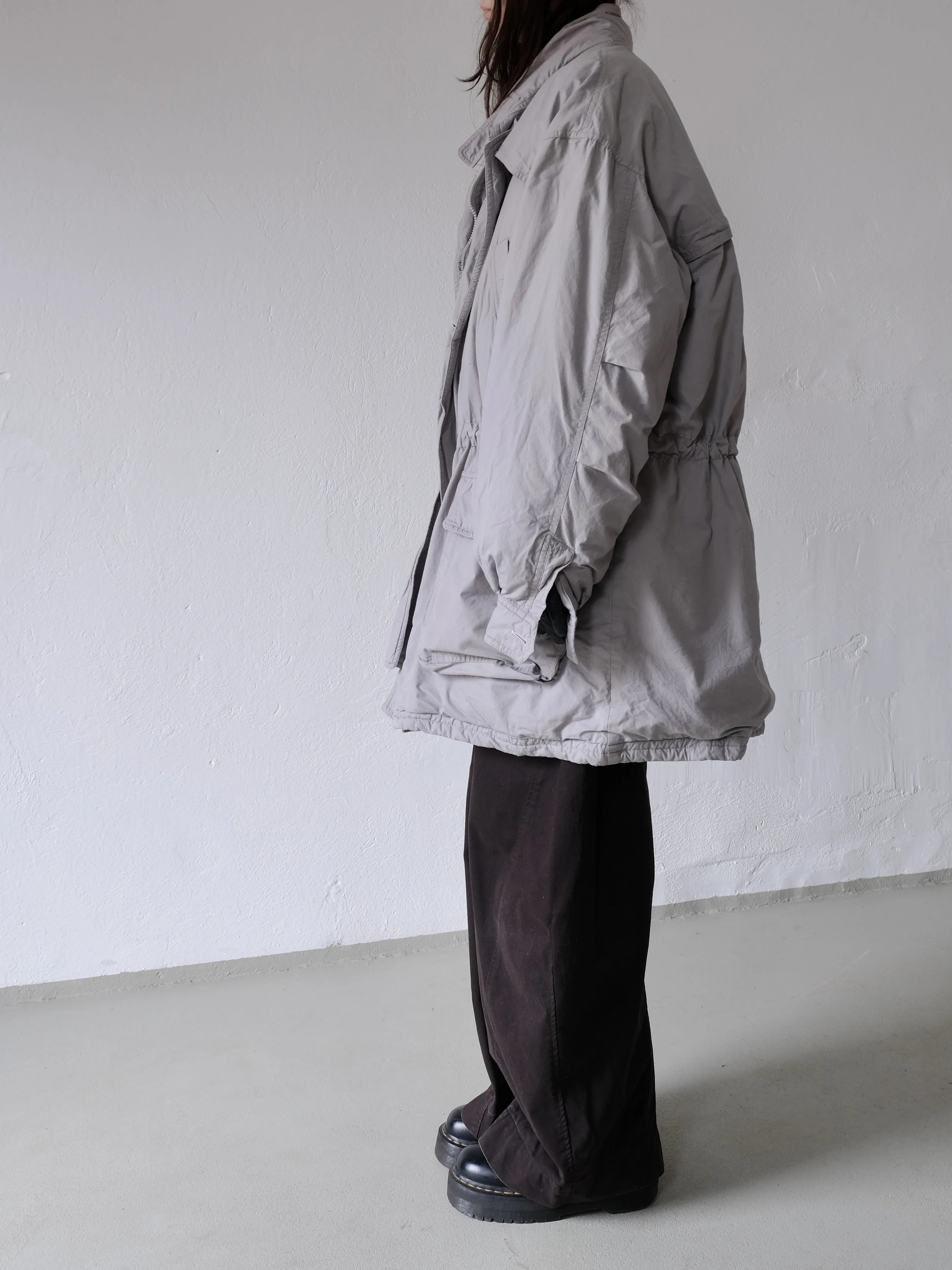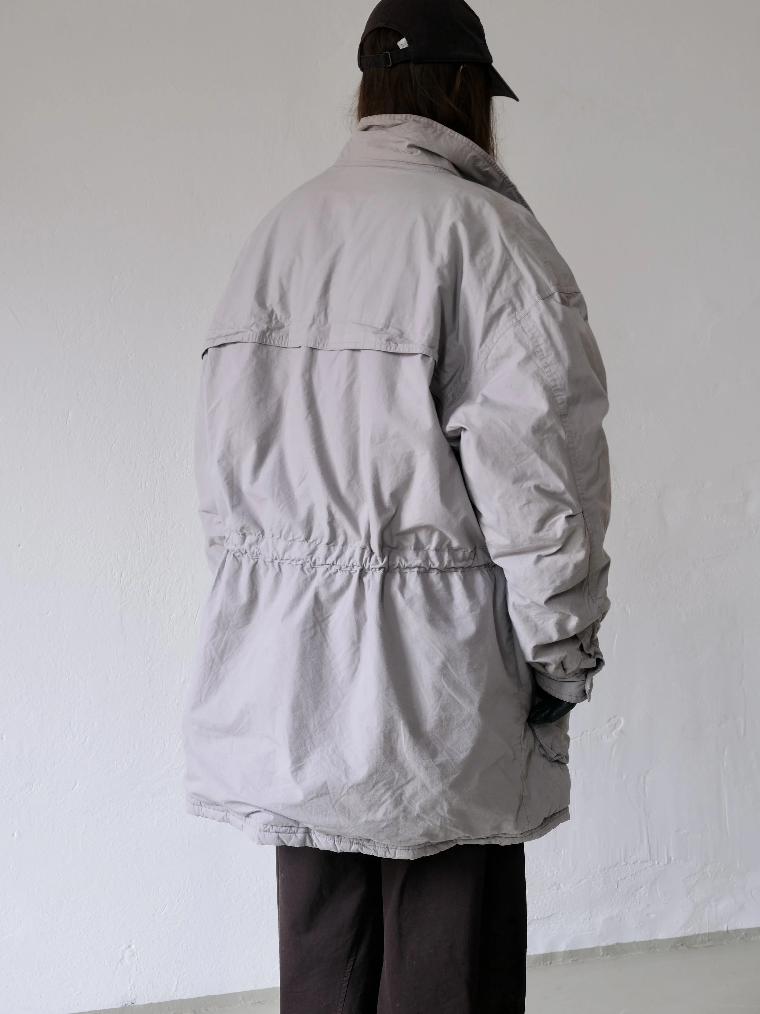 Light grey oversized parka with a drawstring waist, multiple flap and slash pockets, and a high collar with a button front. Generous cut and drop shoulders give it a relaxed, utilitarian look.