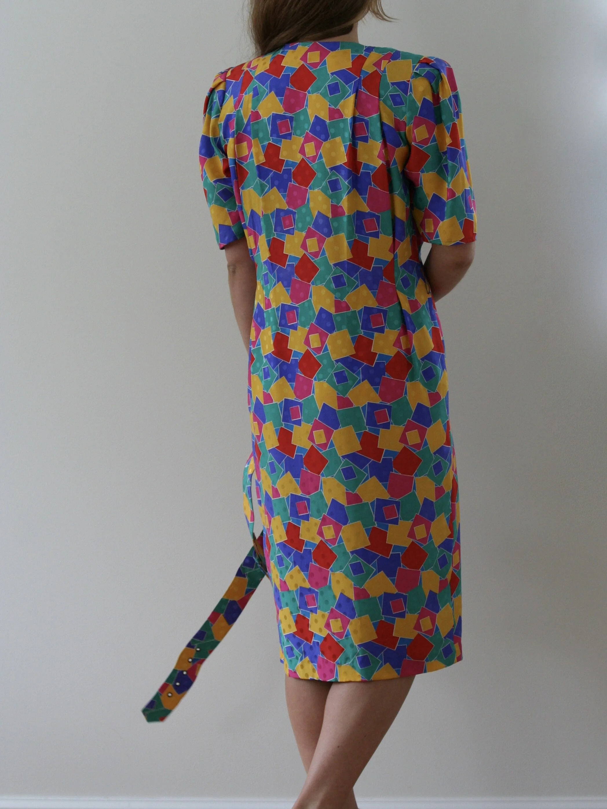 Vintage 80s silk wide-shoulders dress with abstract-print design. Don’t like the quality of the belt, but it looks great without.