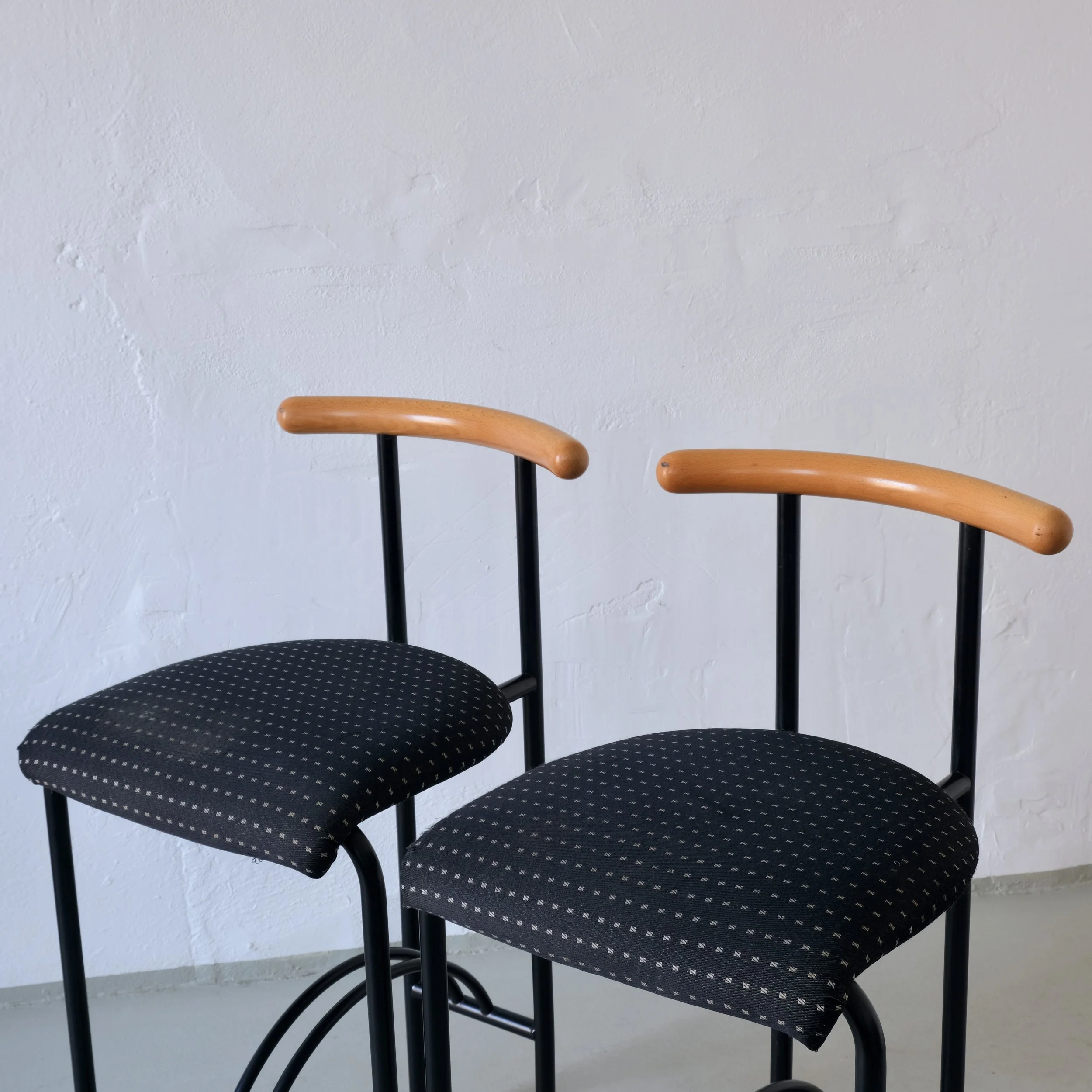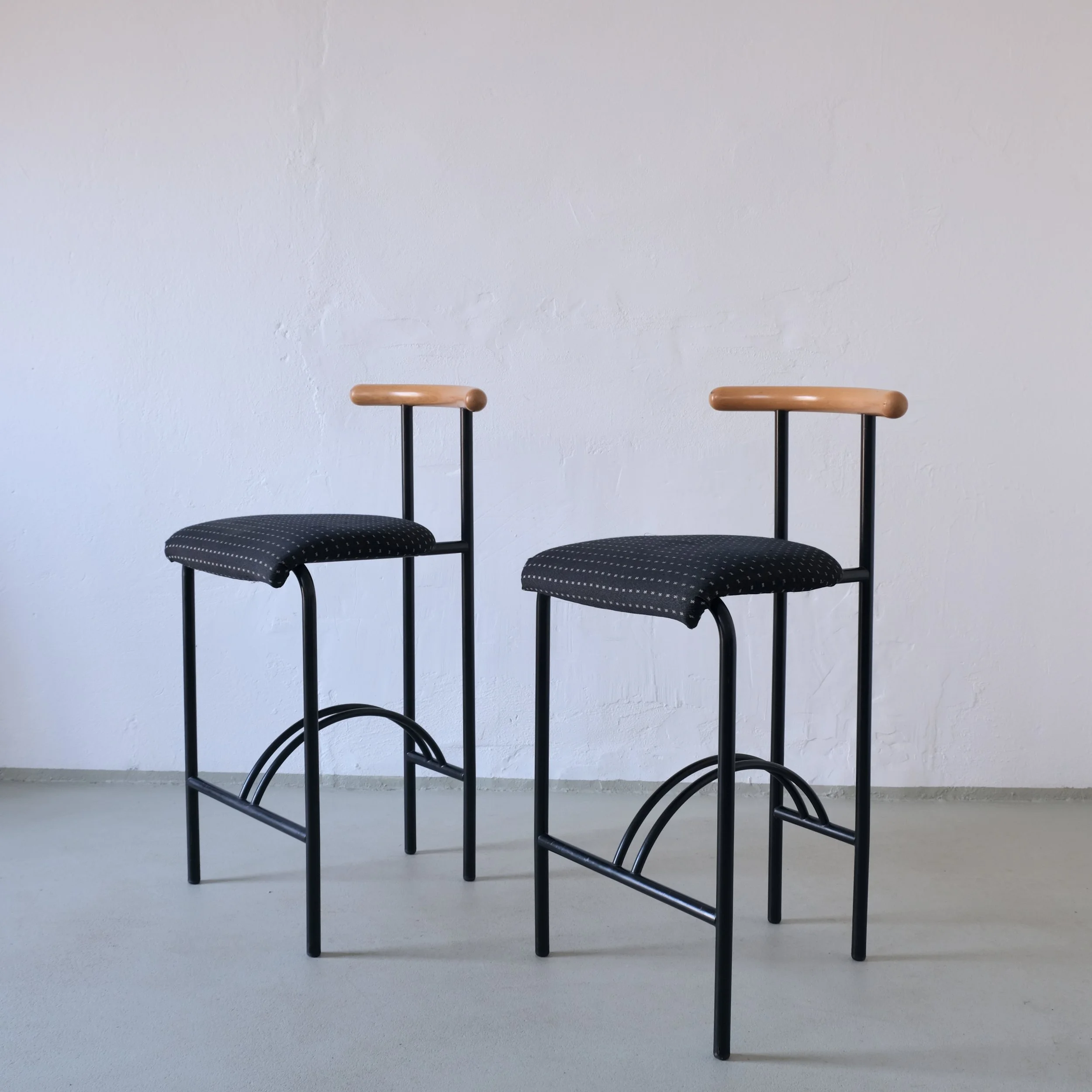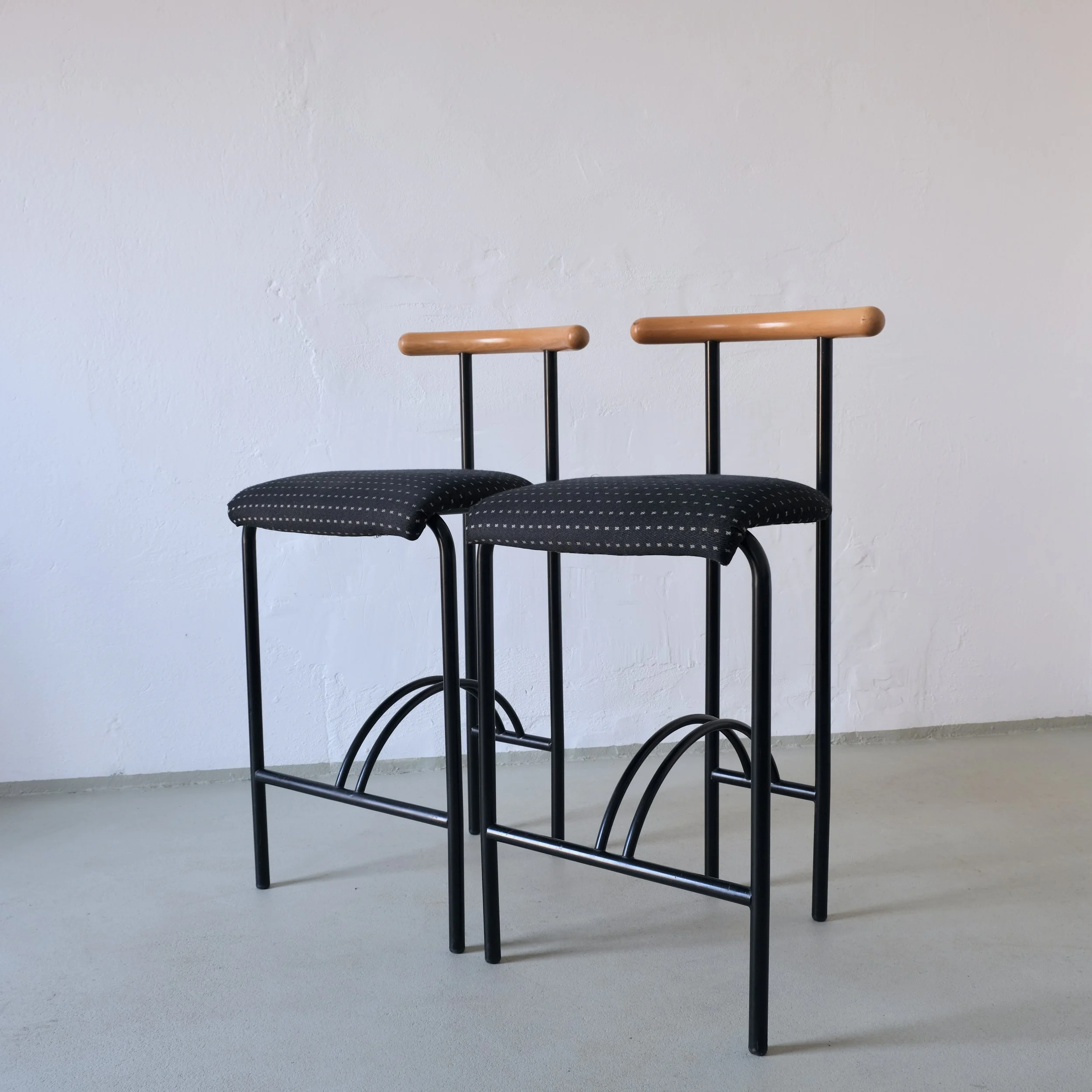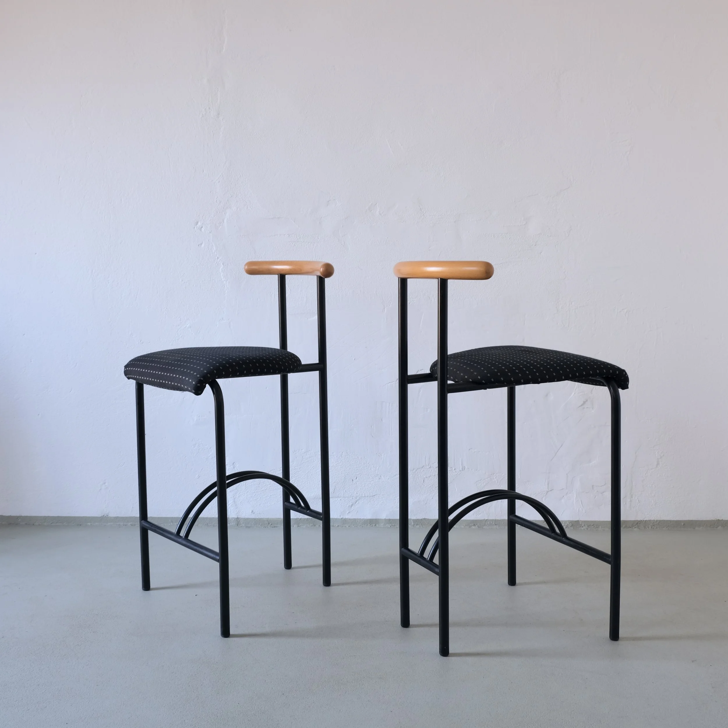 Pair of vintage bar stools featuring a minimalist black metal frame with curved footrests and sculptural wooden backrests. The chairs are similar to "Tokyo" bar stools designed by Rodney Kinsman for Bieffeplast in the 1980s.
