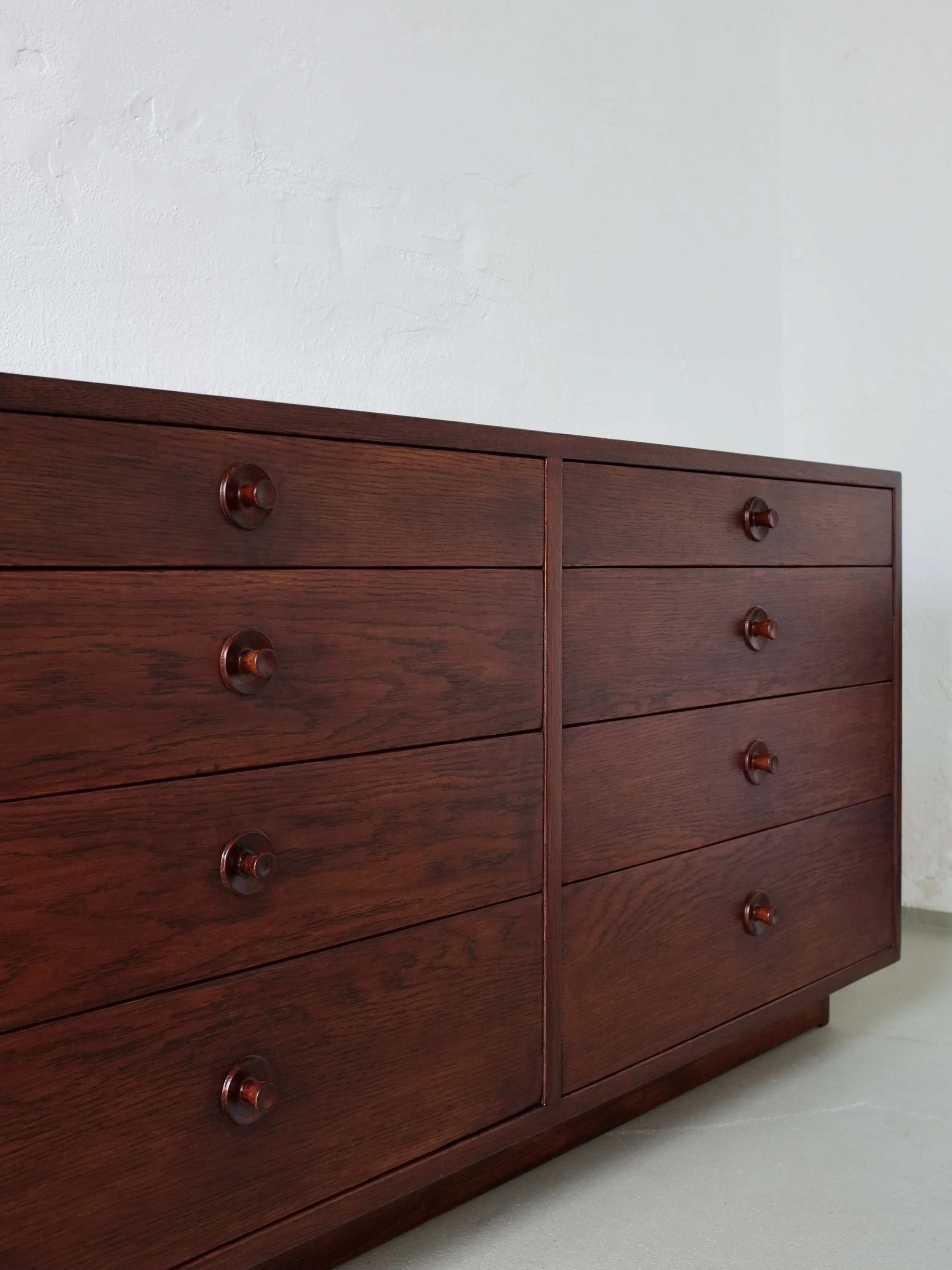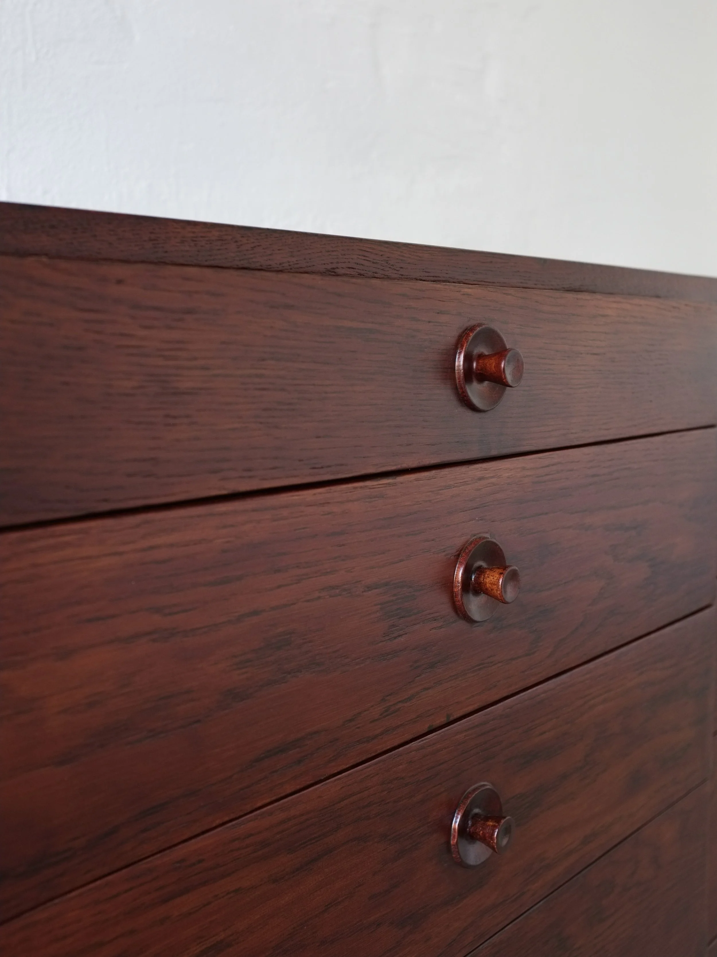 Dark stained wood (rosewood color but seems to be oak veneer) chest of drawers designed by Børge Mogensen in the 1950s for Karl Andersson's.