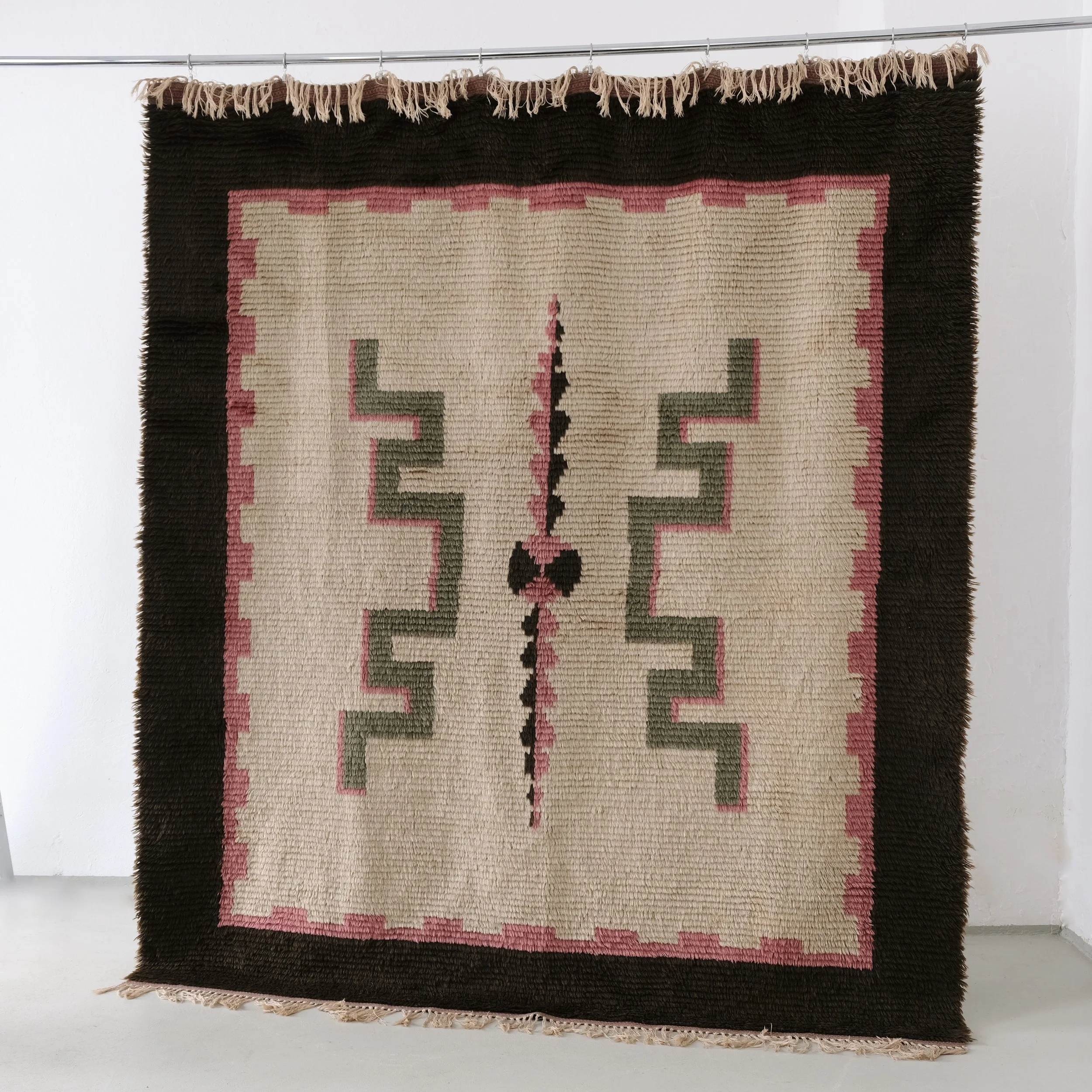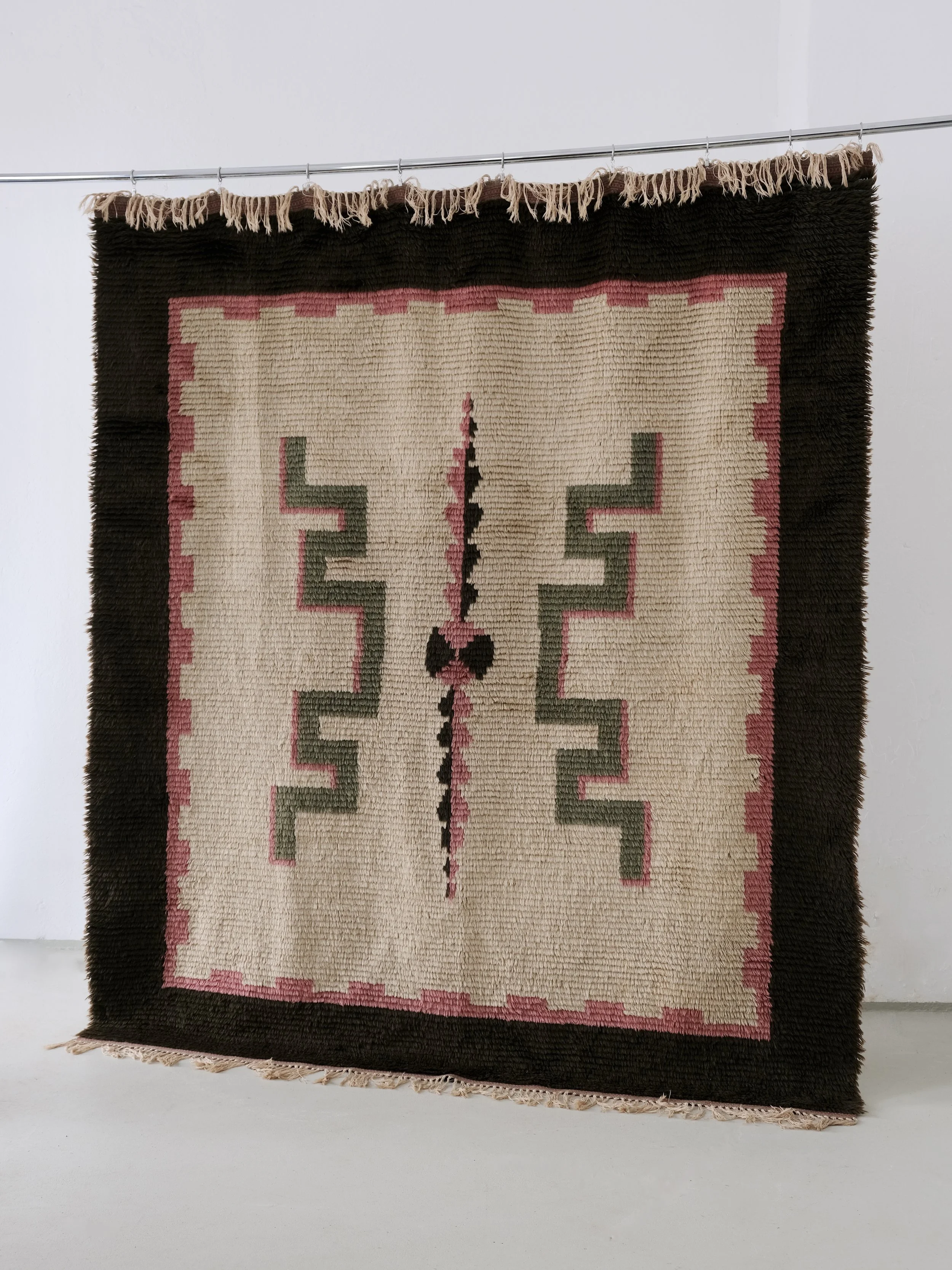 Handwoven Swedish rya rug showcasing a strong Art Deco geometric pattern in cream, brown, rose, and green tones. A substantial textile suitable for use as a floor rug or as a striking wall hanging. Very soft wool with a silky touch feeling.