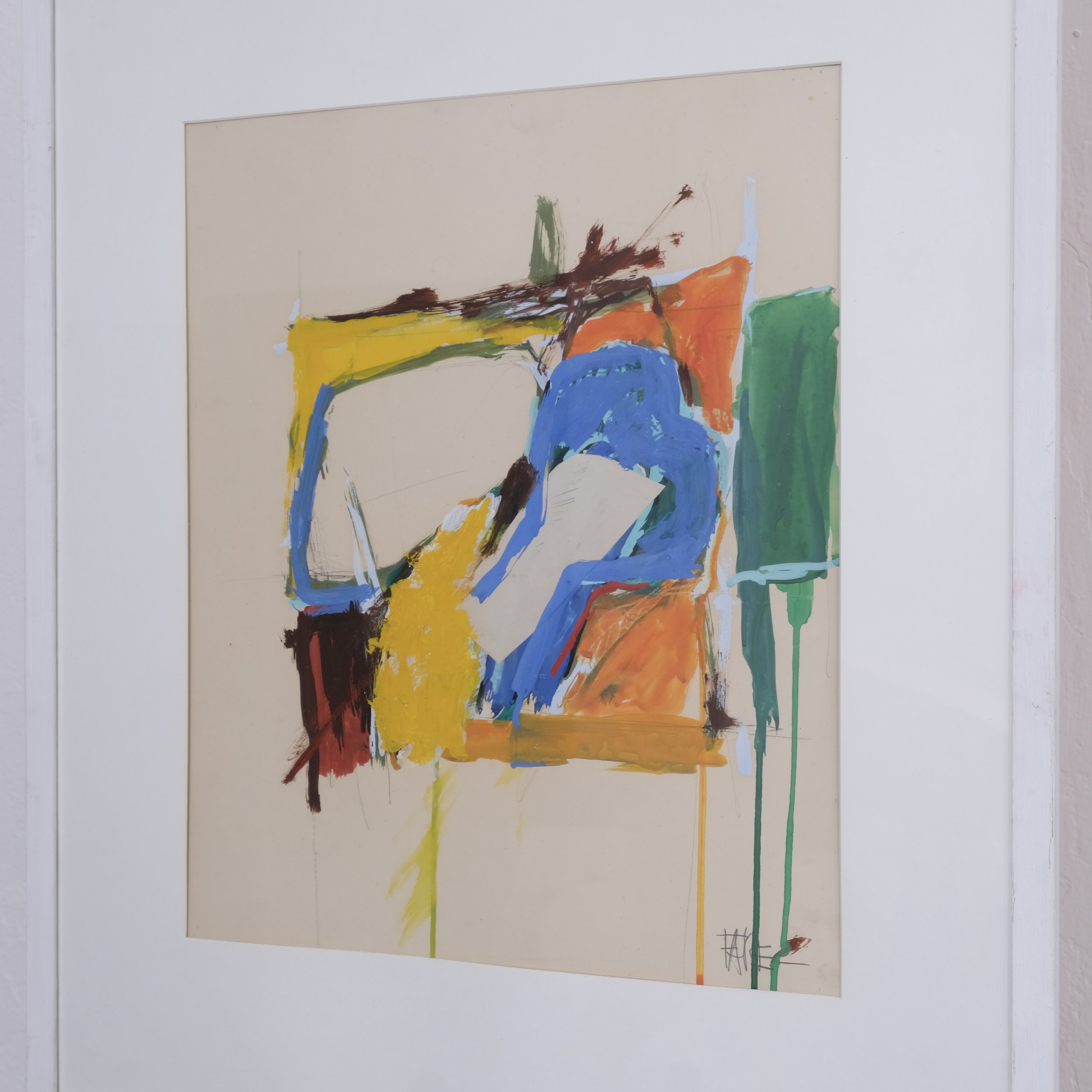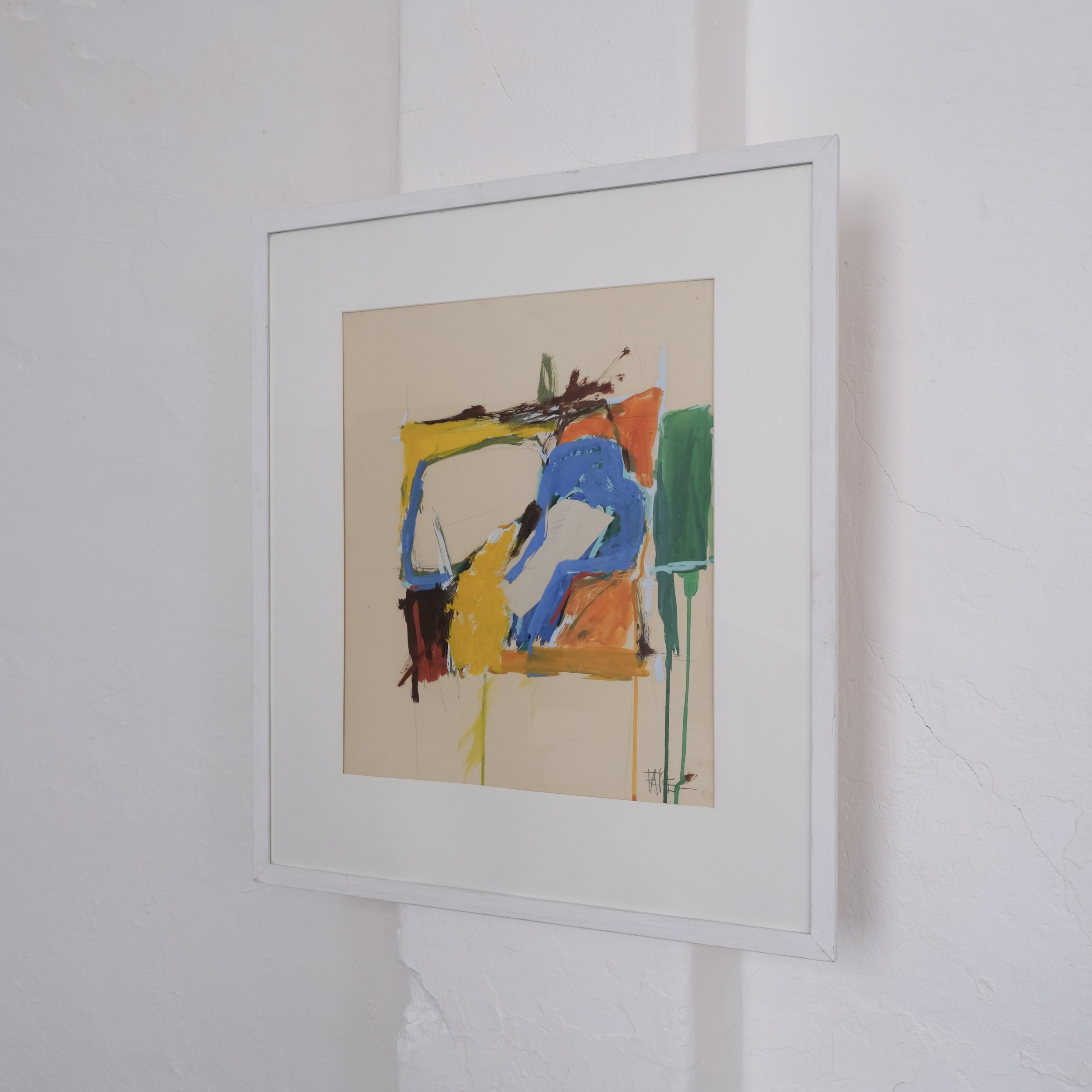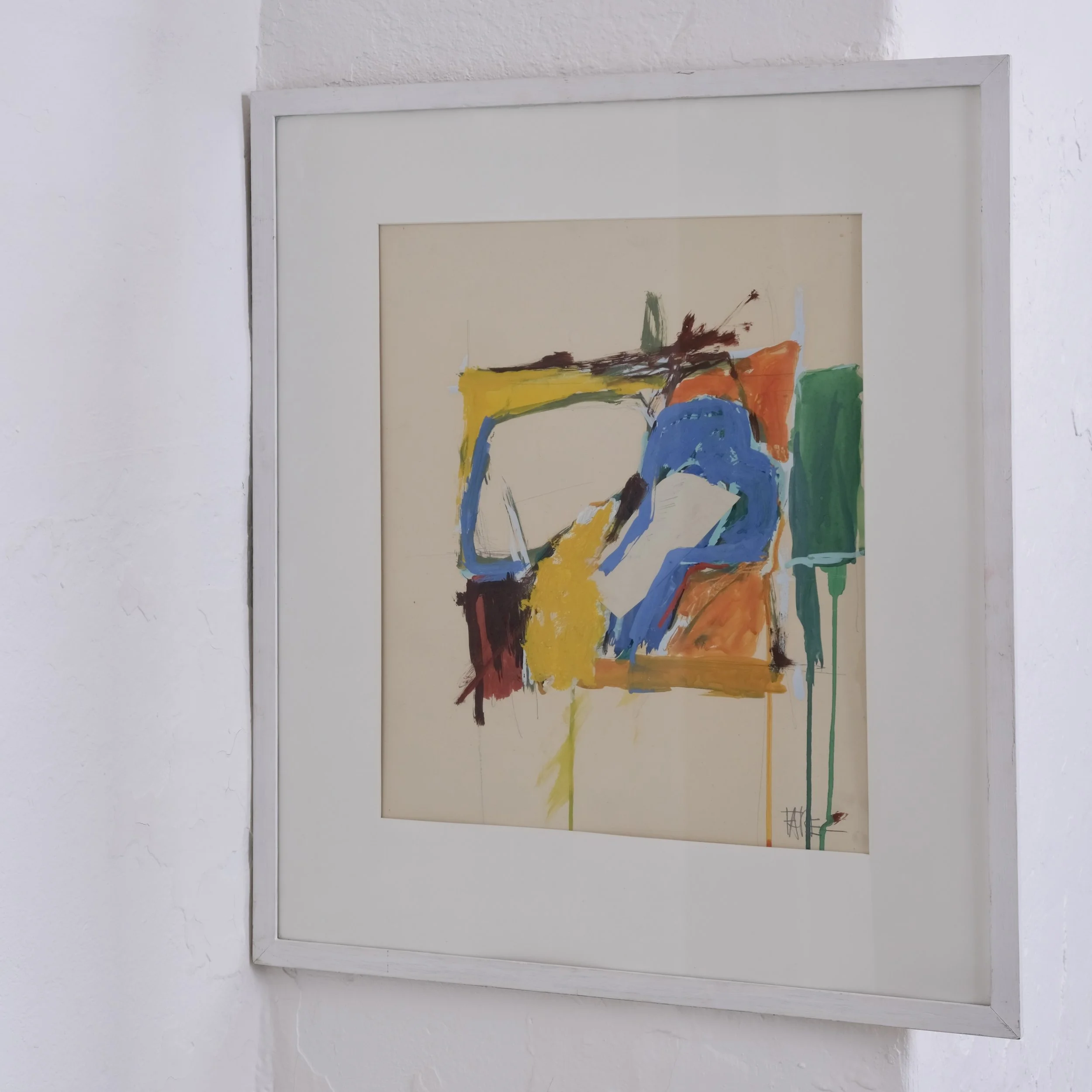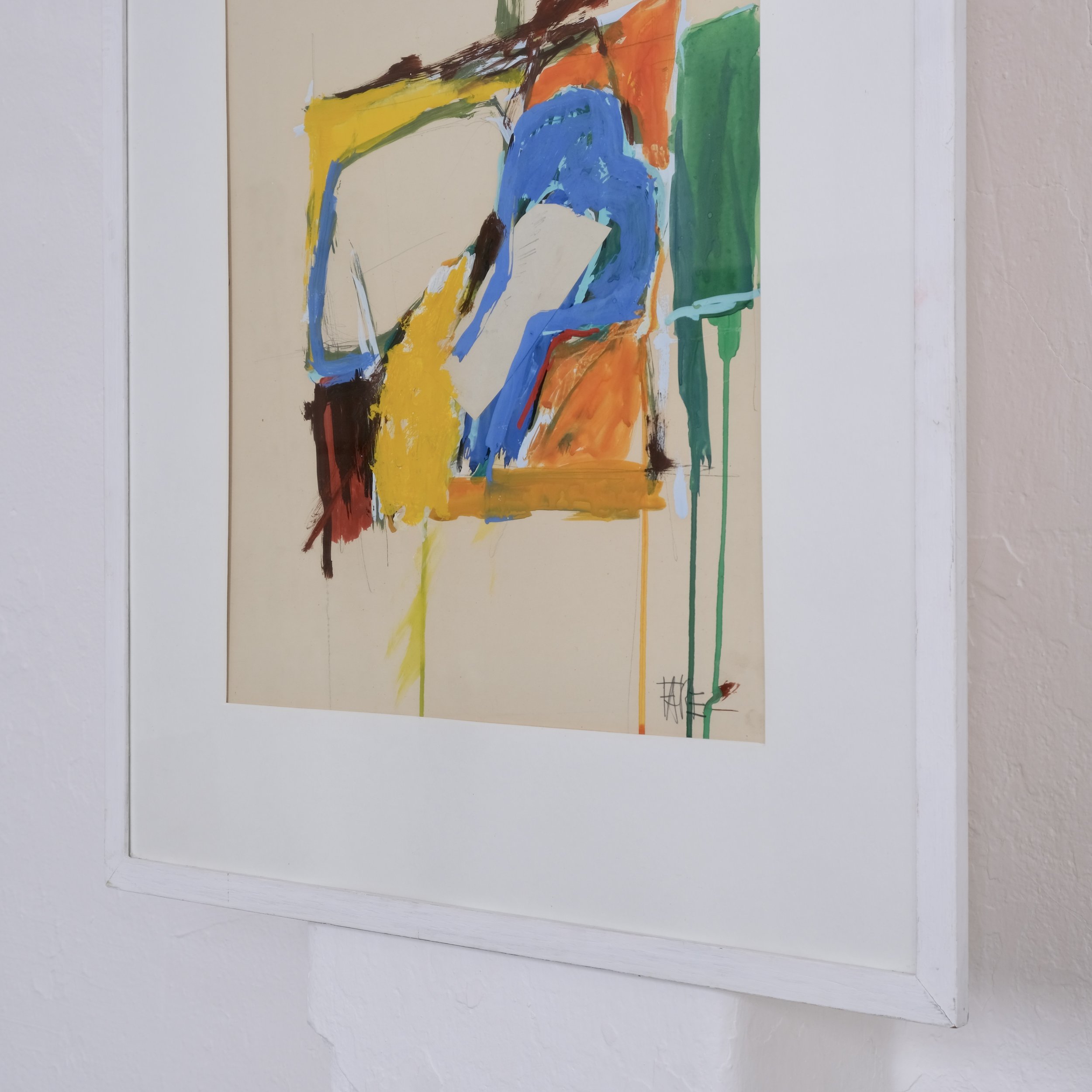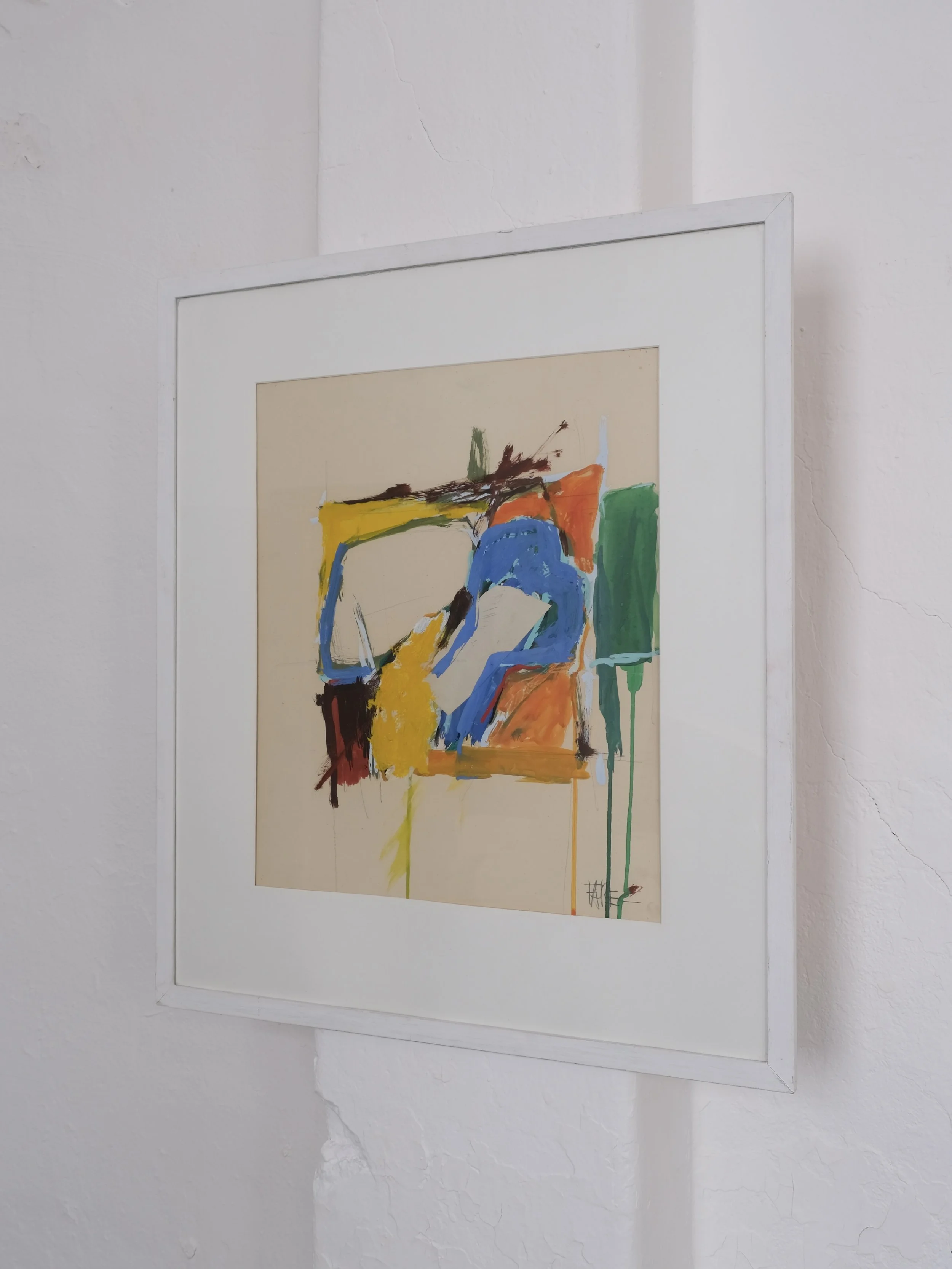 Vibrant mid-century gouache painting by Swedish artist Leopold Fare, dated 1964. The composition features dynamic abstract forms in bold blue, yellow, green, and umber tones, showcasing Fare’s expressive, gestural style.