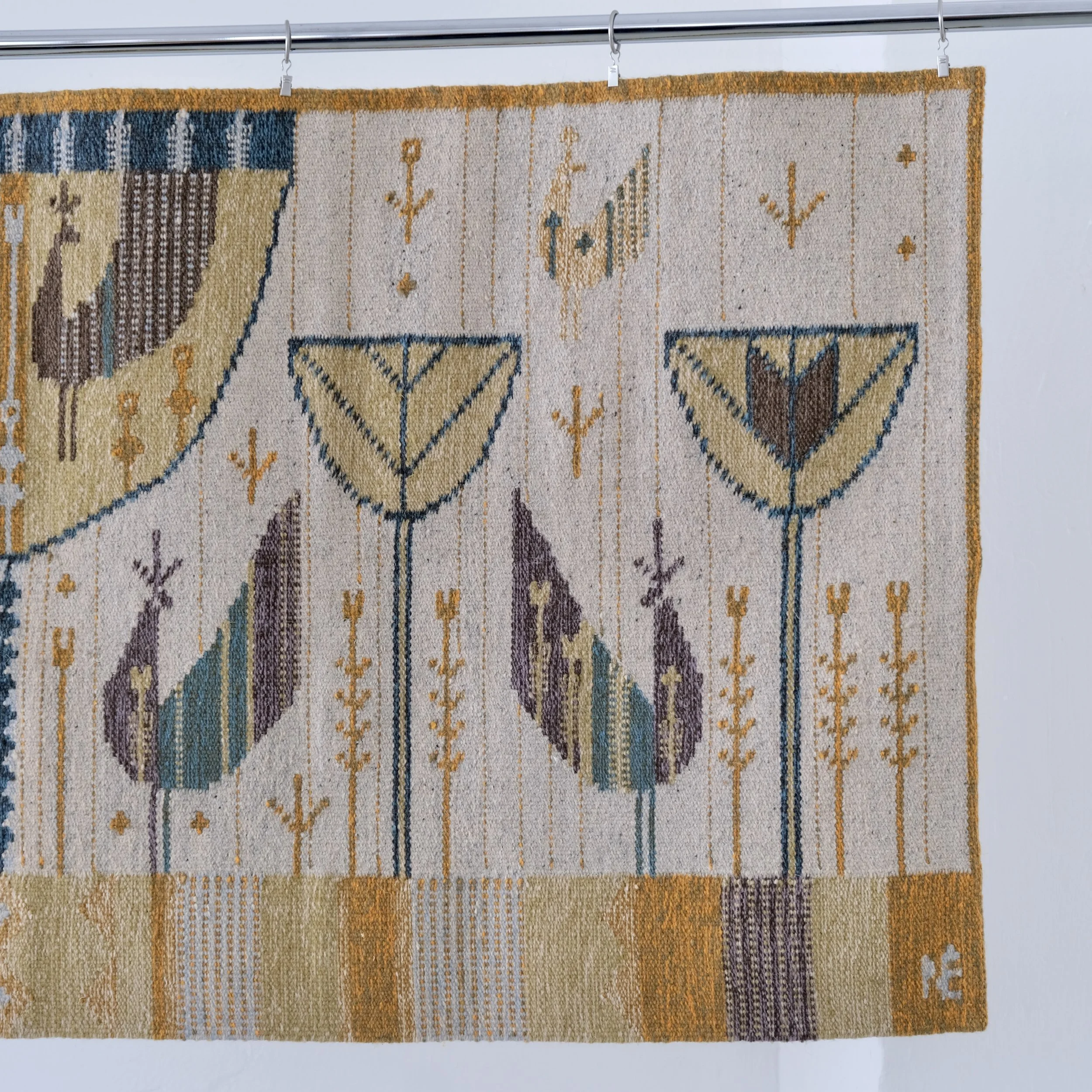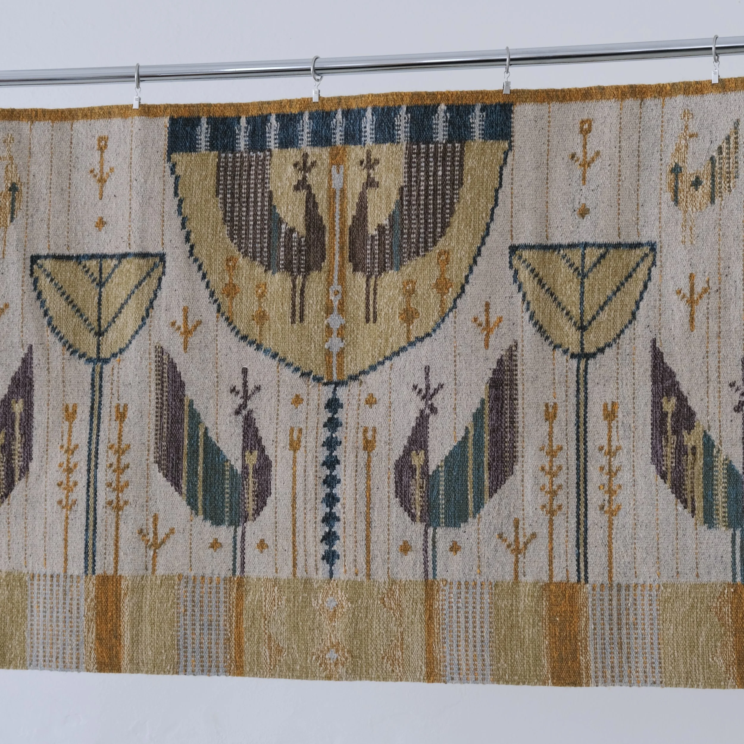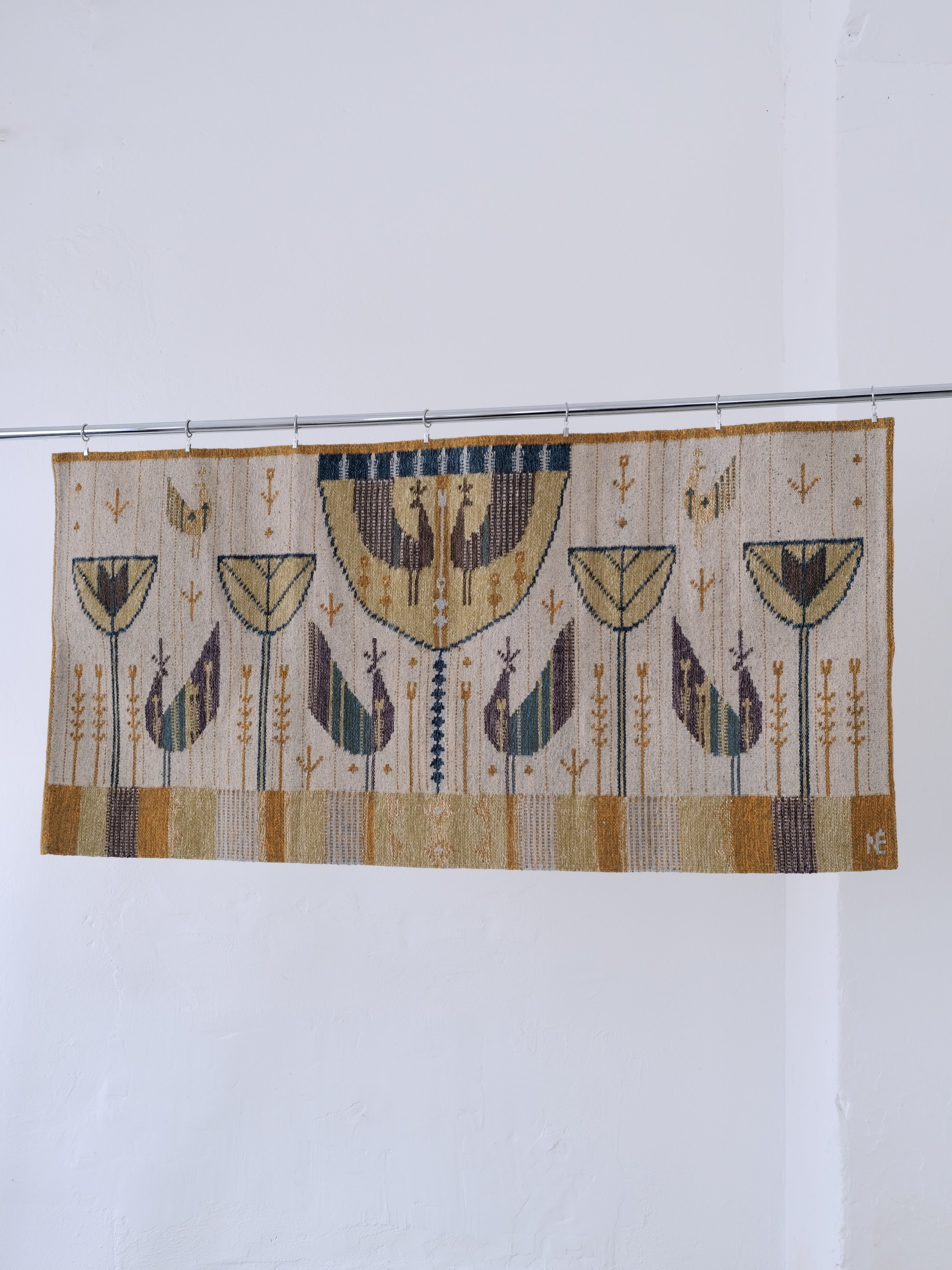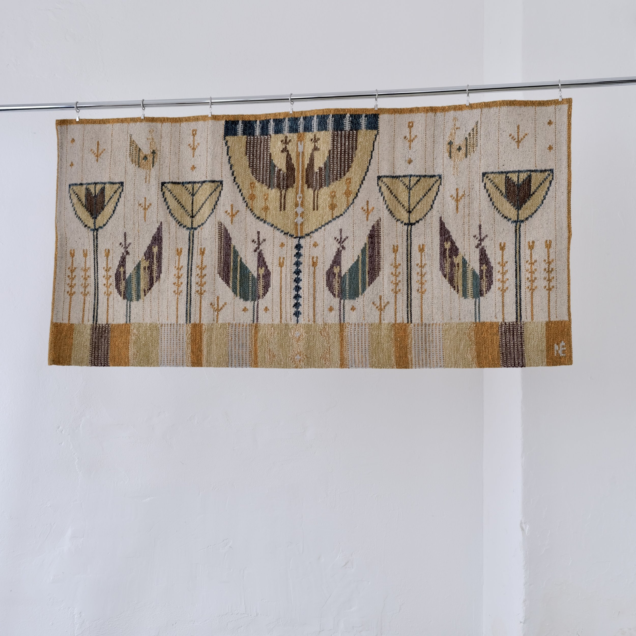 Mid-century Hungarian wool horizontal tapestry by Éva Németh, featuring a symmetrical folk-inspired composition with stylized birds, floral stems, and vessel-like geometric forms. The rug has been produced in Hungary for Illums Bolighus Copenhagen.
