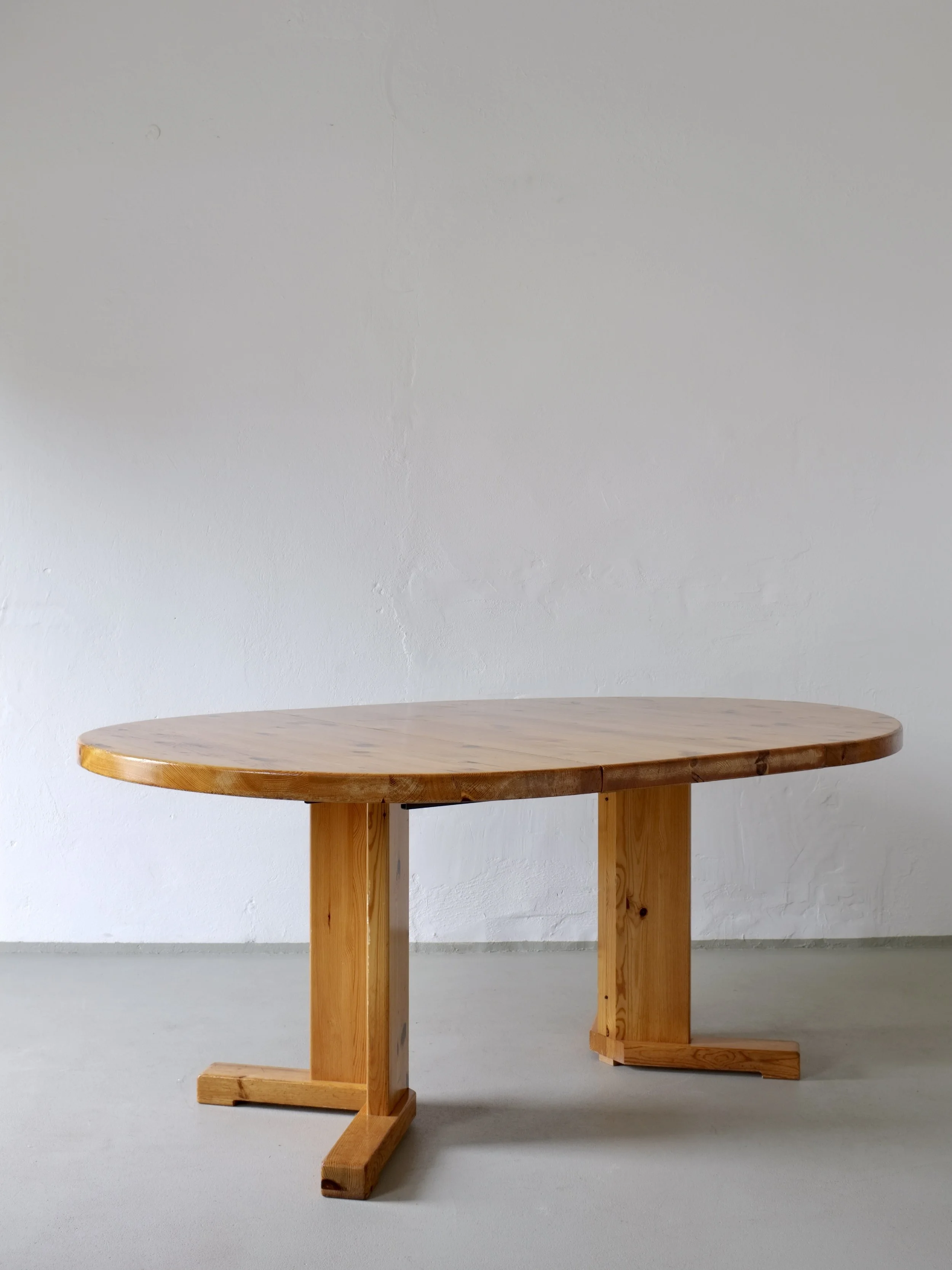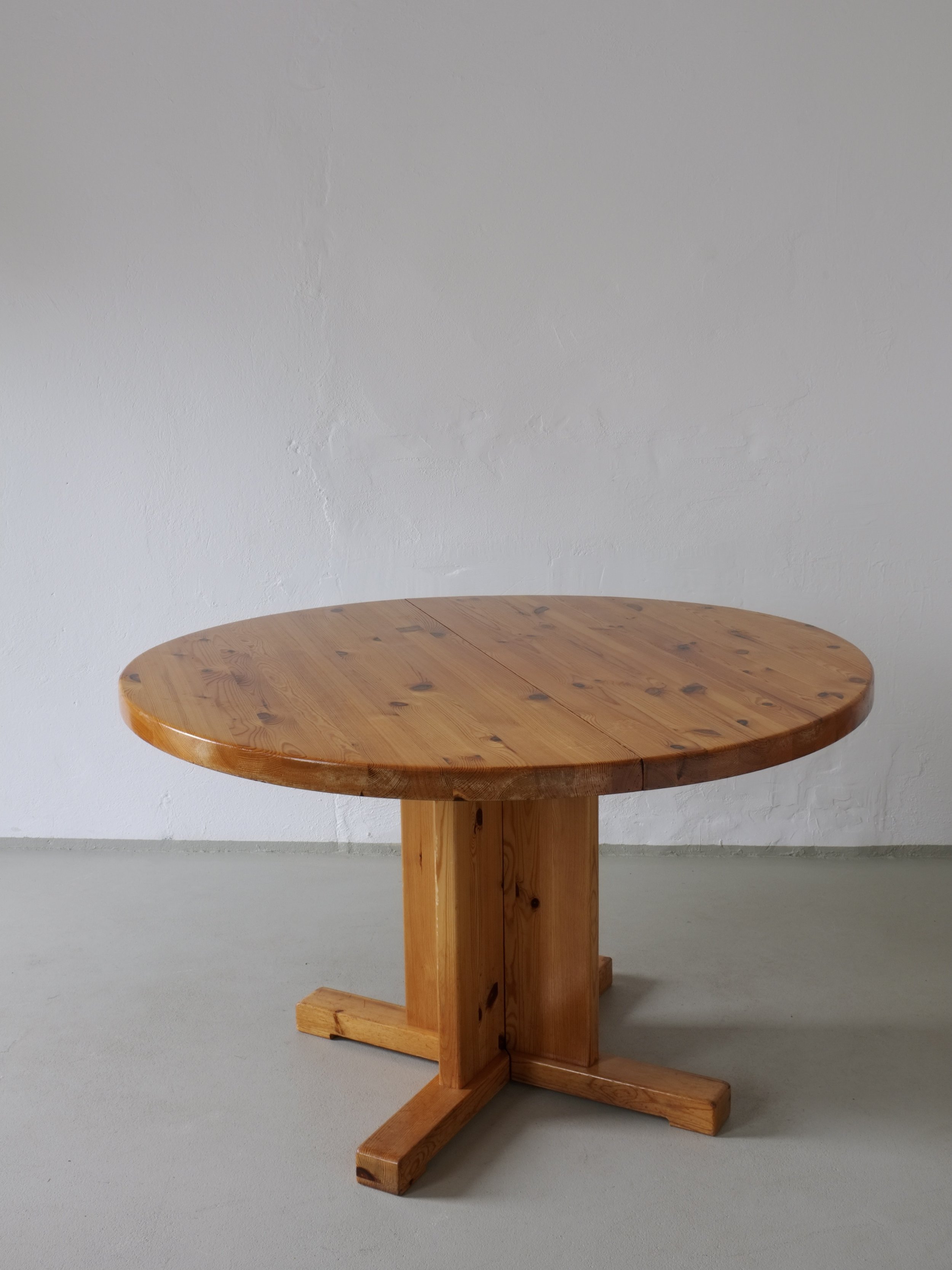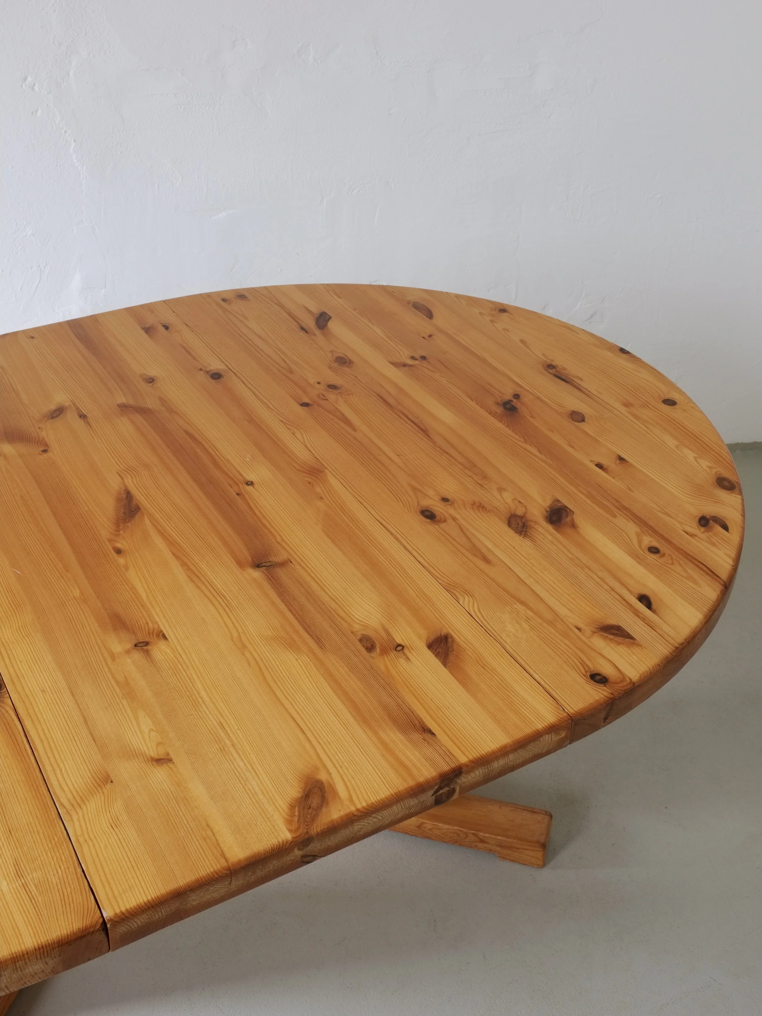 Vintage extendable dining table made from solid pine with warm golden tones. Features a round top that extends into an oval shape, supported by two sturdy cross-shaped pedestal legs.