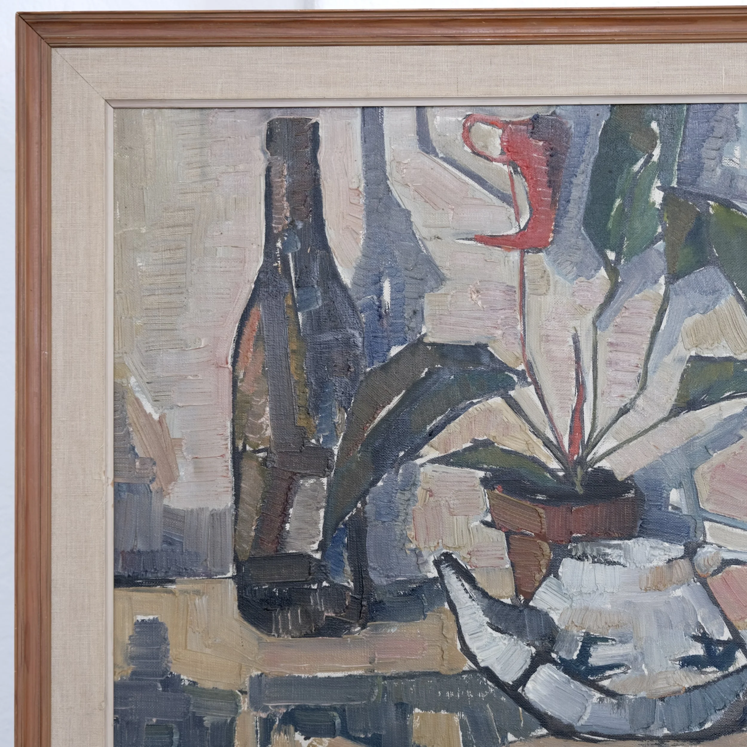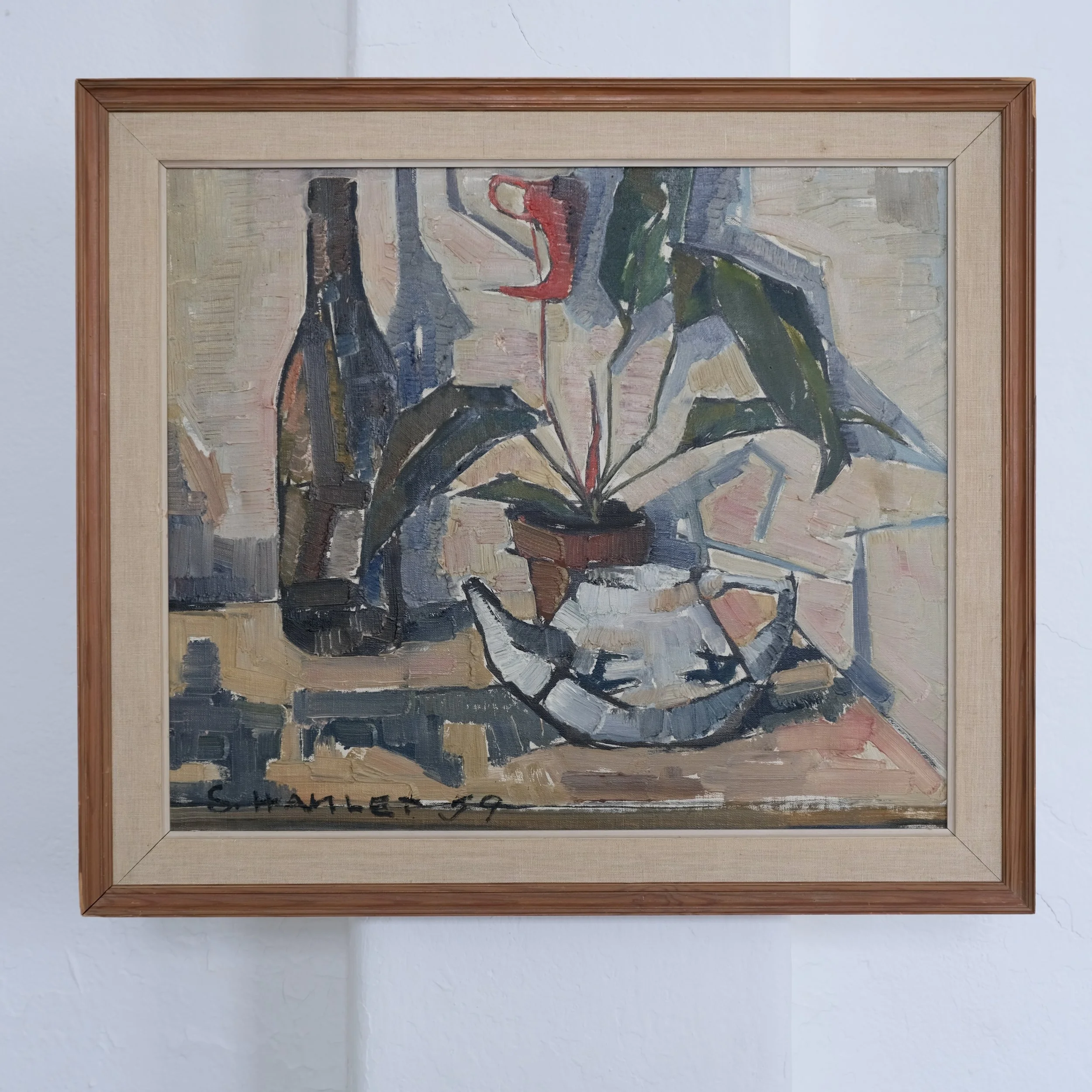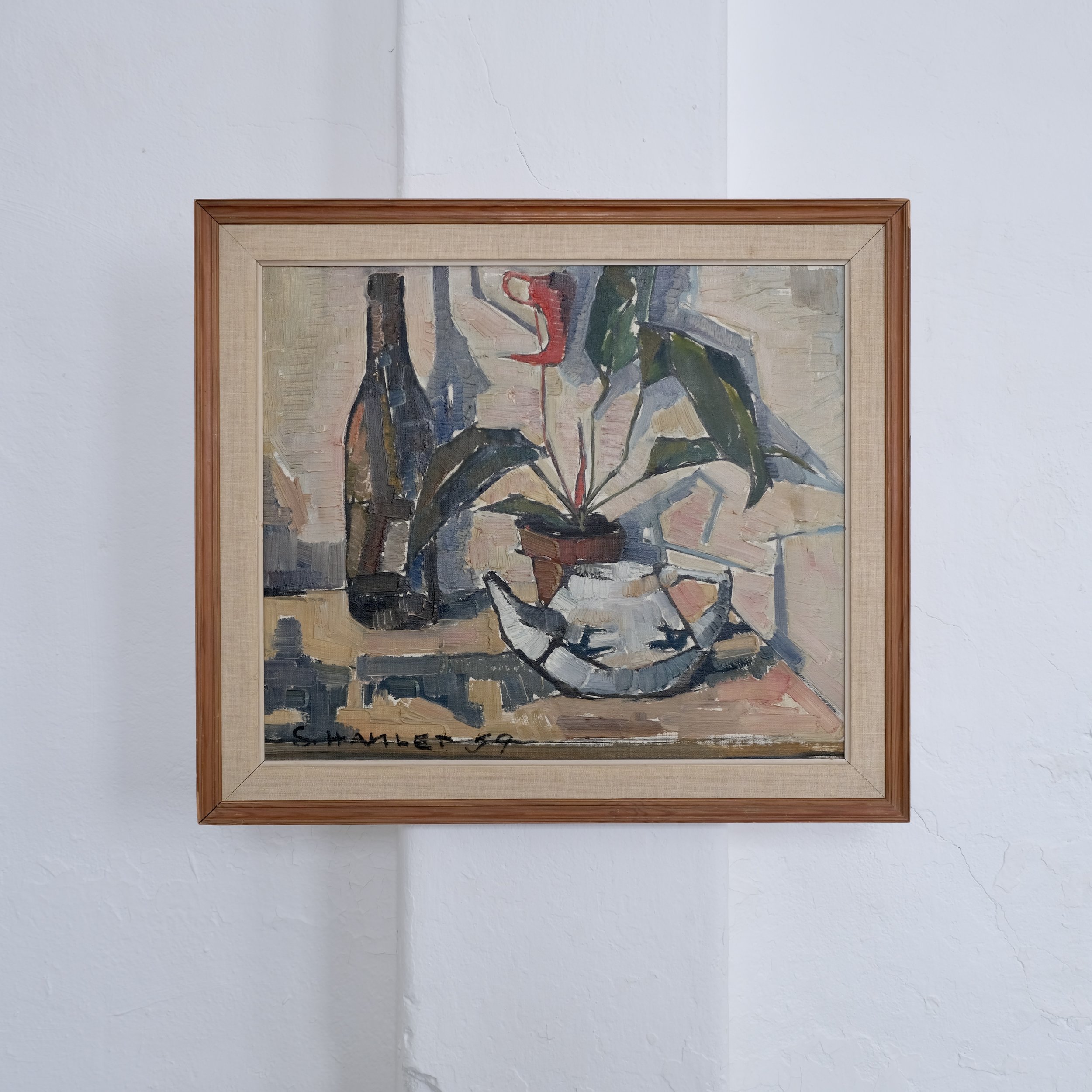 Original oil on canvas still life by Swedish artist Sven-Olof Hamlet (1922–2002), dated 1959. The composition features a potted plant with a red bloom, bottle, and metal vessel arranged in angular planes and rendered with expressive brushwork and muted mid-century tones. One more artwork is available - check the photos.