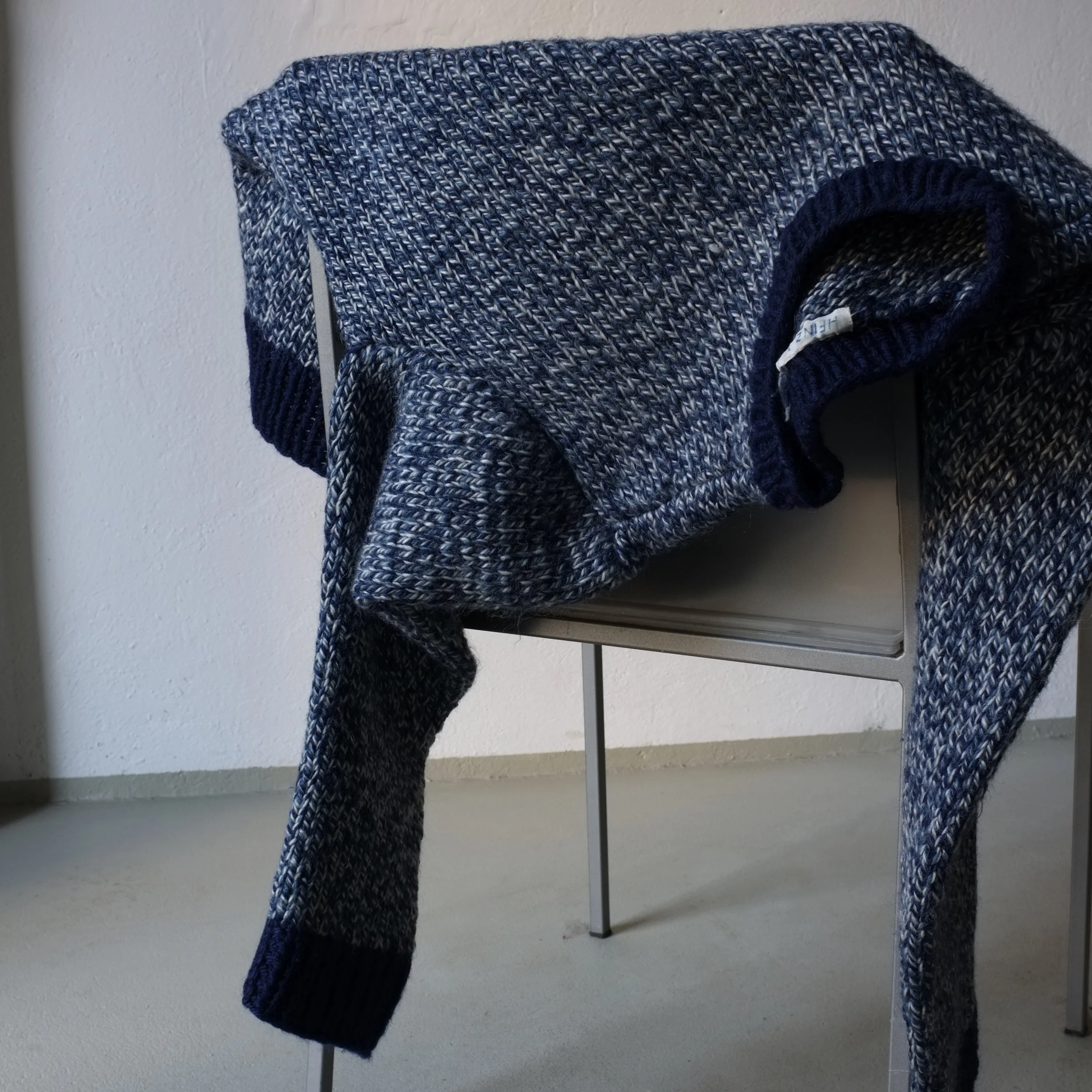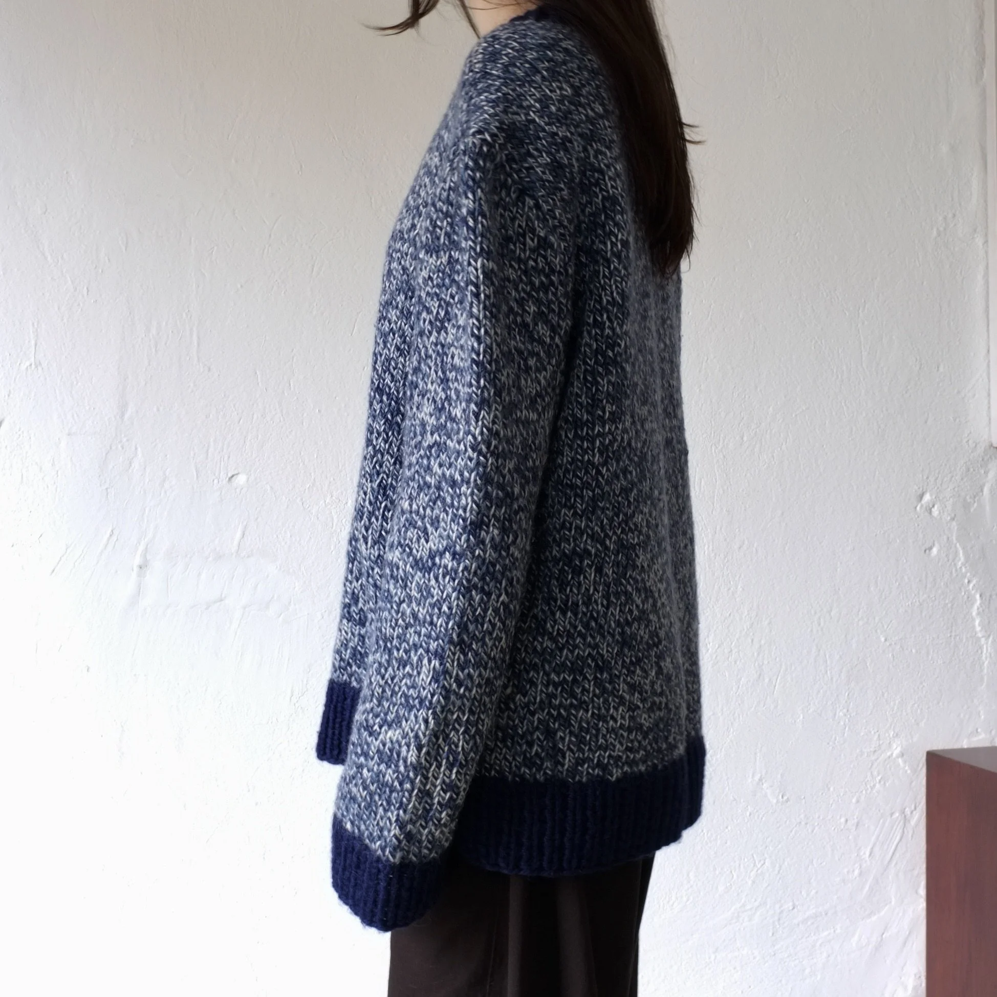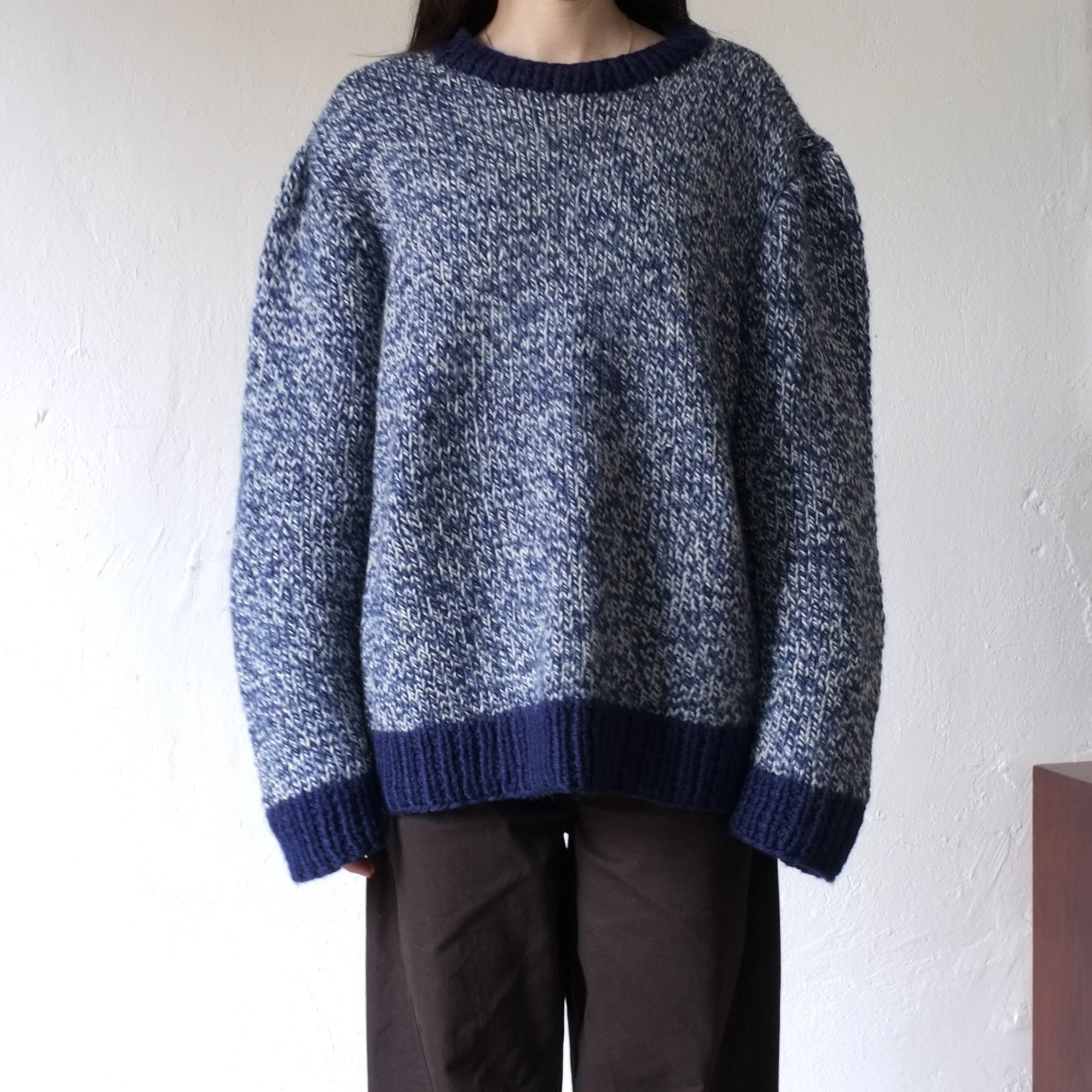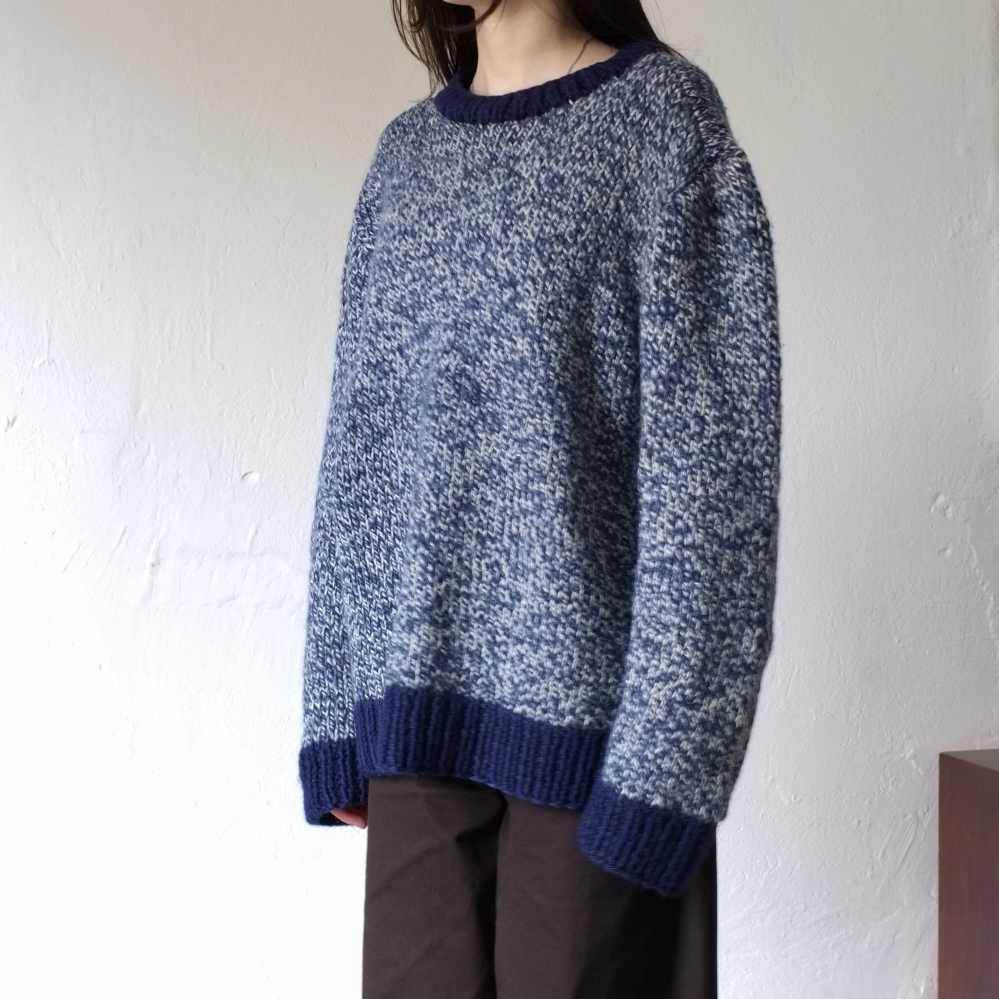Vintage knit sweater in a blue marl yarn with darker blue ribbed neckline, cuffs, and hem. Relaxed straight silhouette with long sleeves and a classic crew neck.